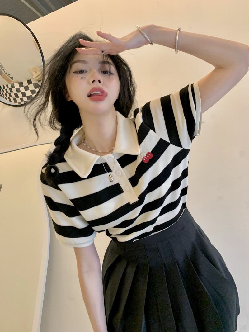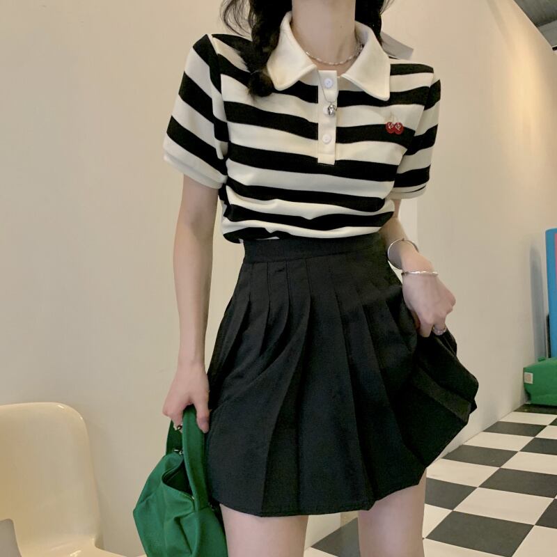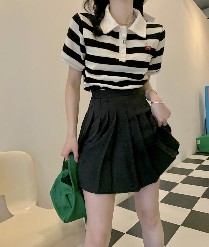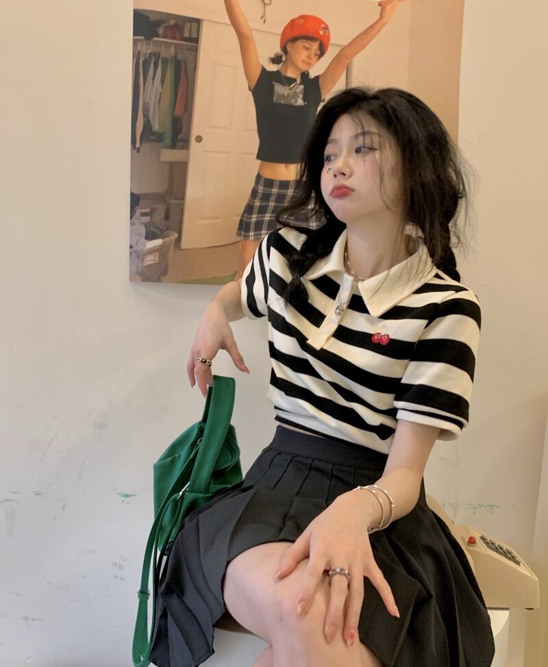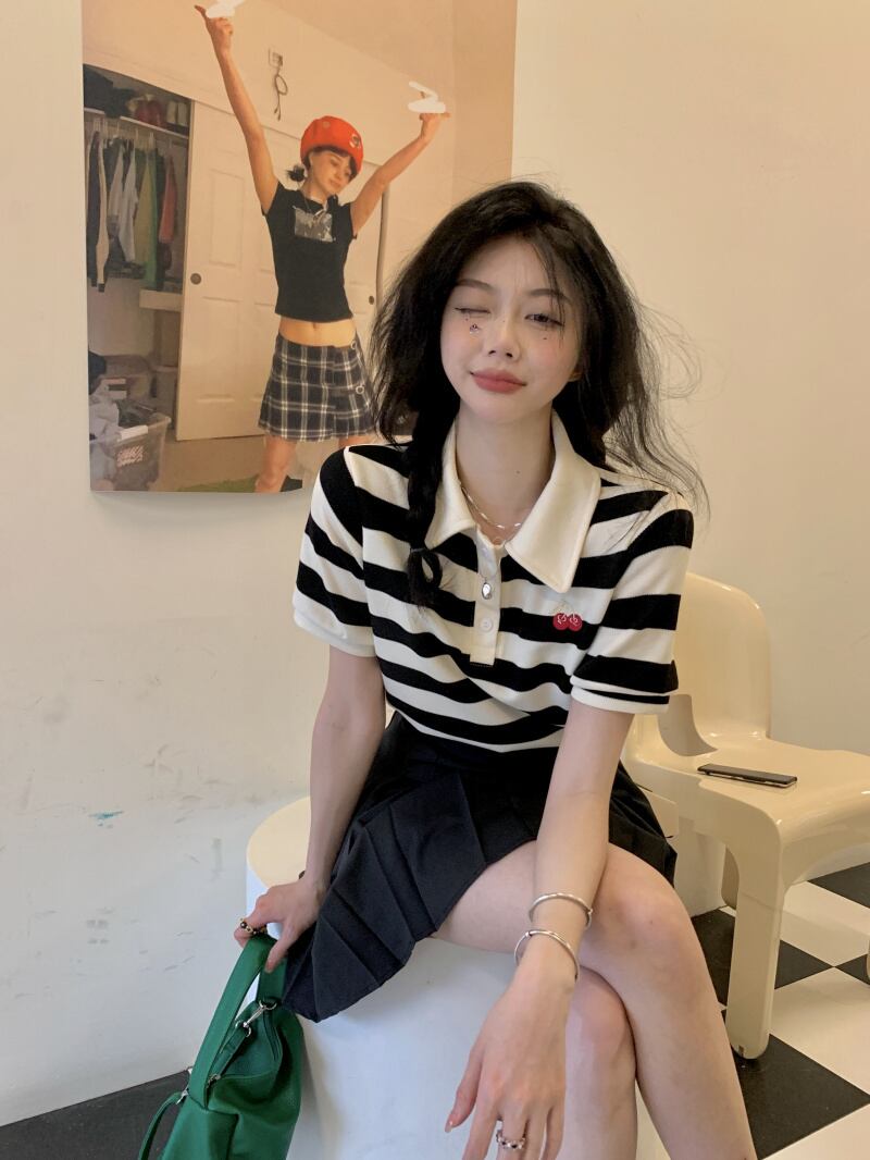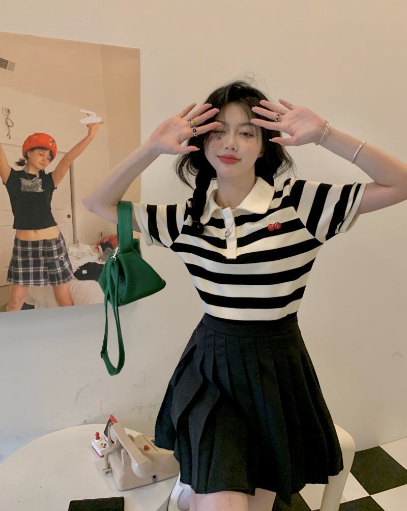 ese大学フロントショルダーPOLOシャツ半袖ストライプTシャツレディースデザインセンスニッチシックトッププリーツスカート夏 サマー 夏物 7460018101018029 | framboise21
