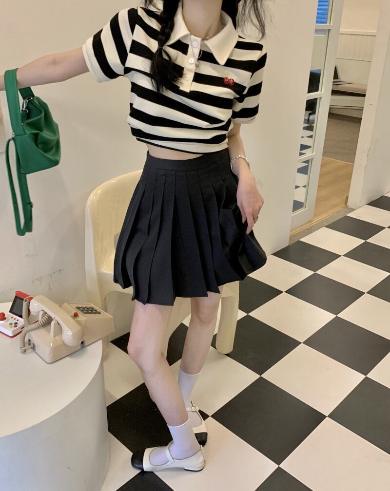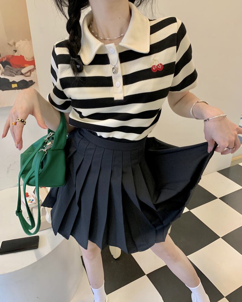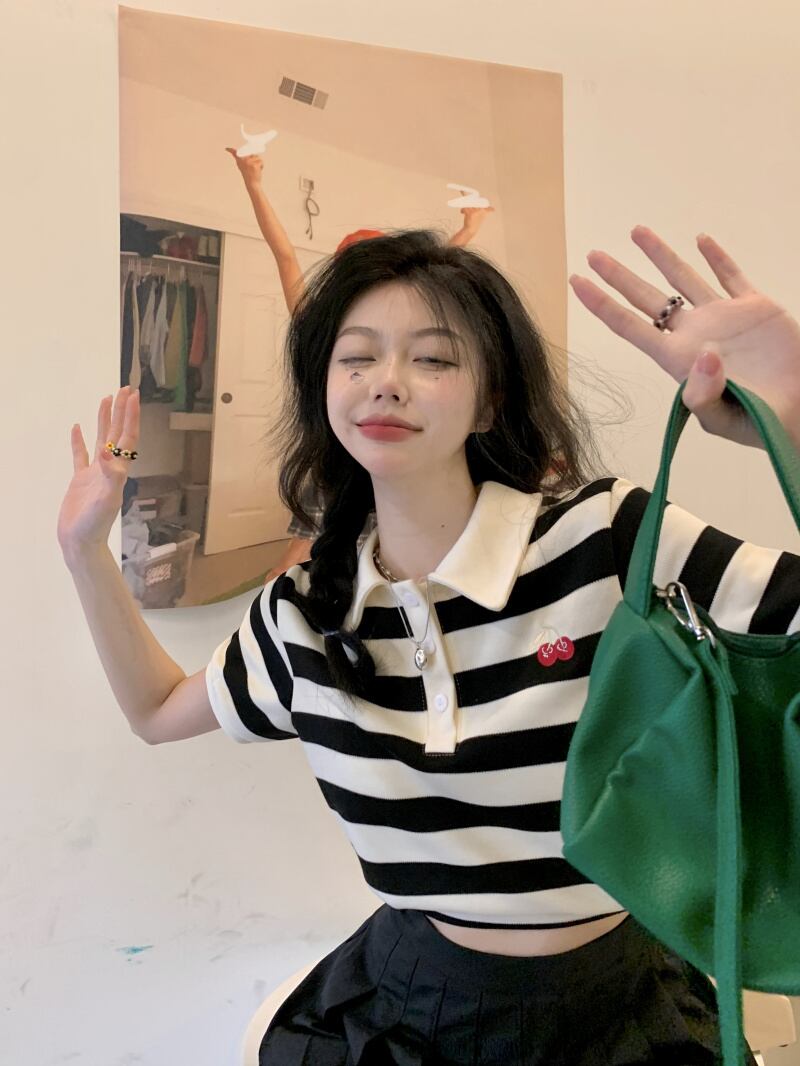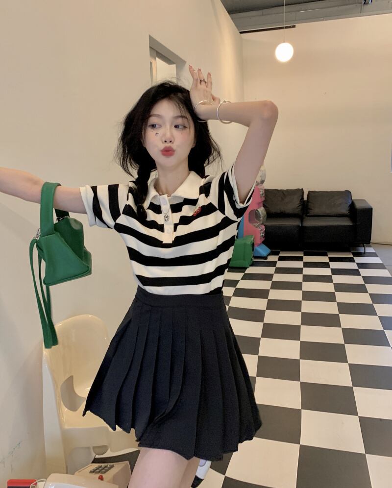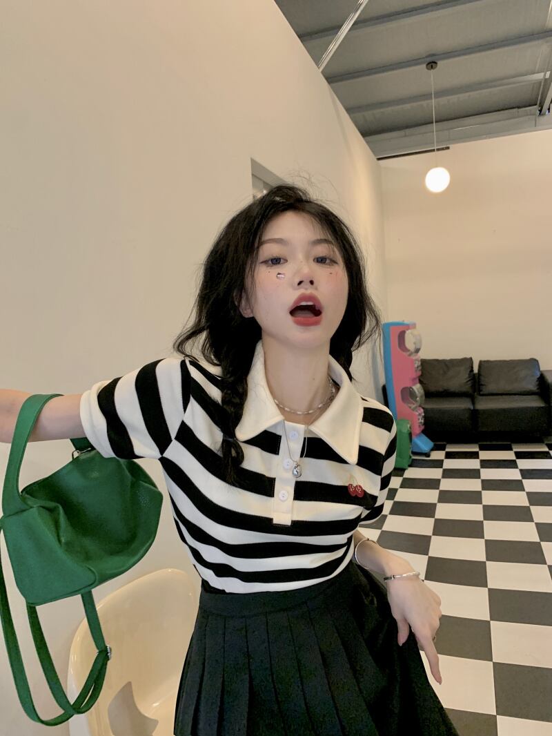 ese大学フロントショルダーPOLOシャツ半袖ストライプTシャツレディースデザインセンスニッチシックトッププリーツスカート夏 サマー 夏物 7460018101018029 | framboise21