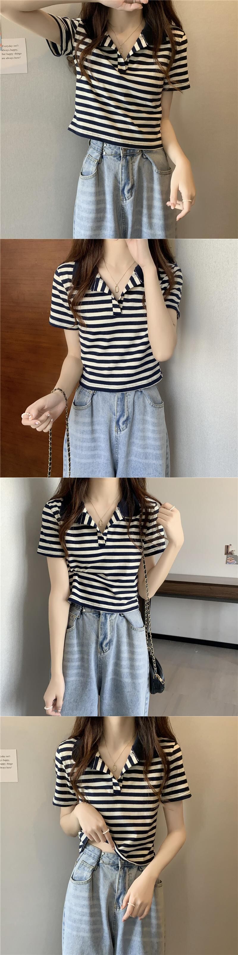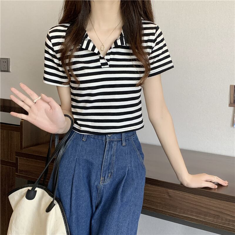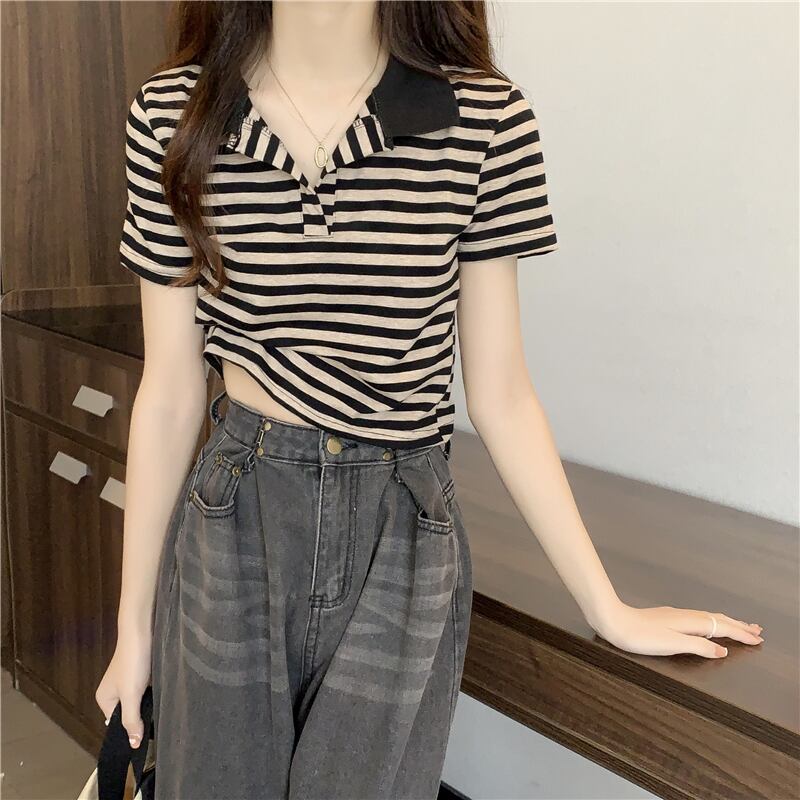 2022年夏のアメリカンレトロストライプ半袖ポロネックTシャツレディースイントレンディなスリムフィットと薄いショートトップ サマー 夏物 Oネック 7460054830748442 | framboise21