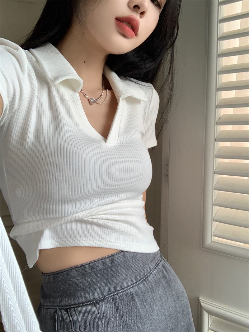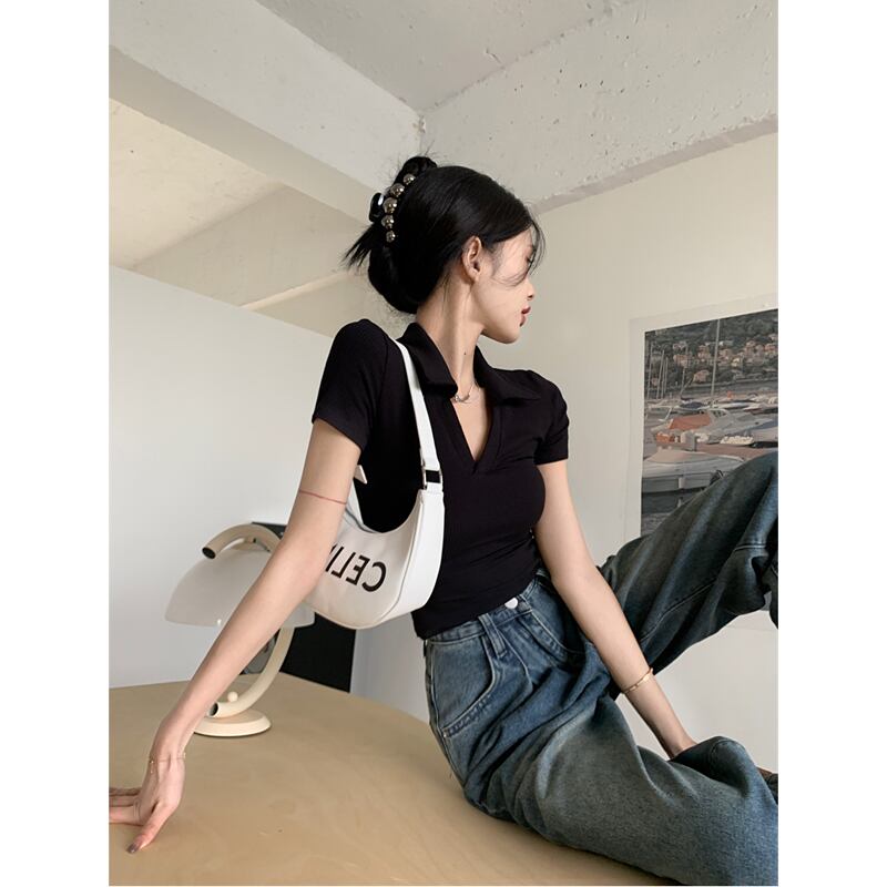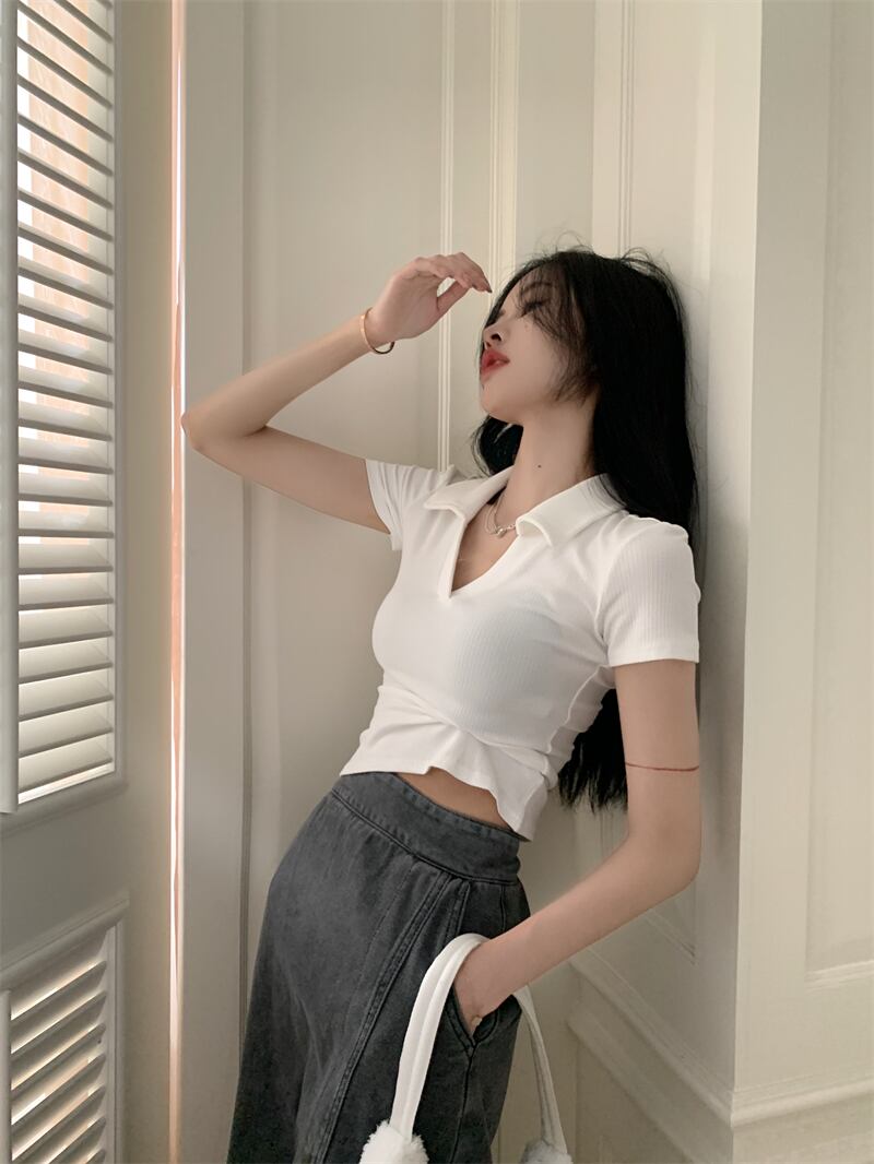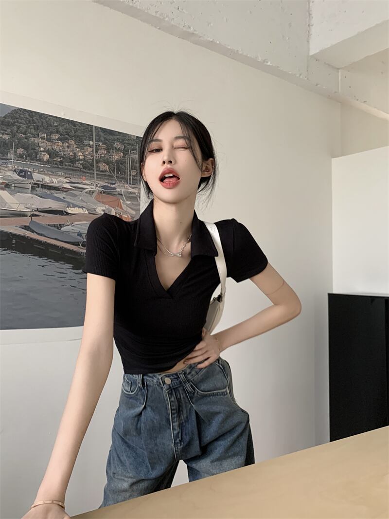ブラックポロカラーフロントショルダー半袖TシャツレディースサマーシンアイスシルクニットスリムボディシャツVネックショートトップ ハーフスリーブ 夏物 7460013809328249 | framboise21