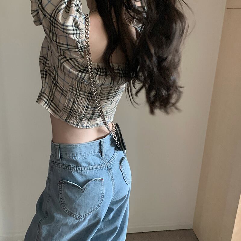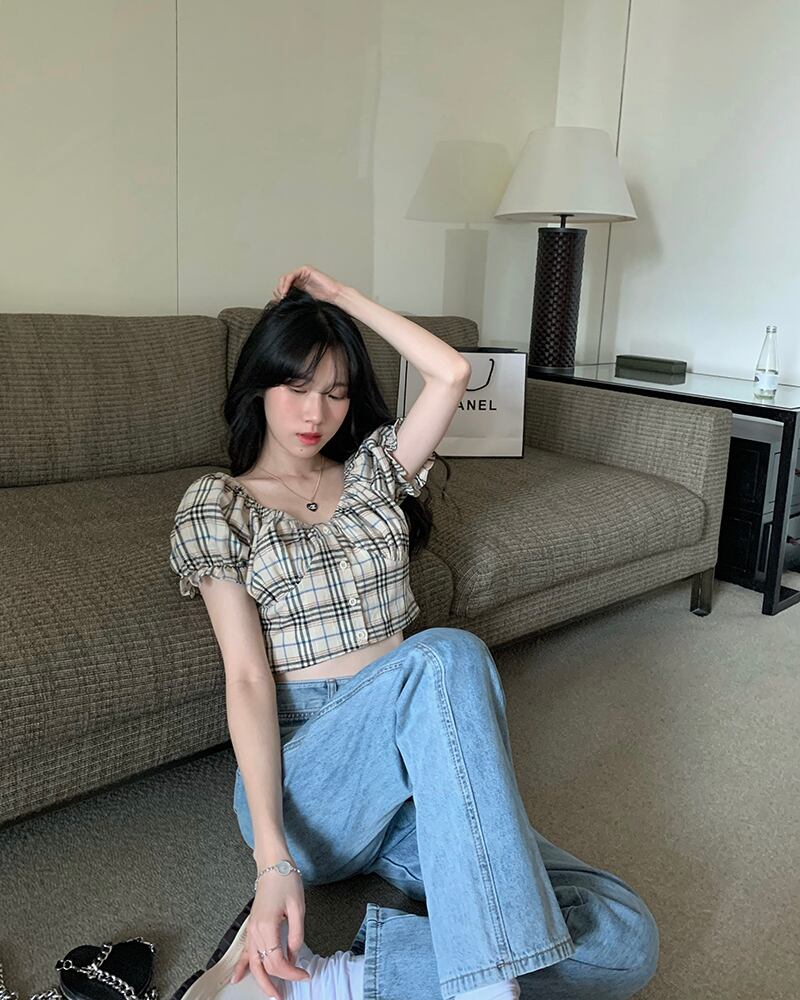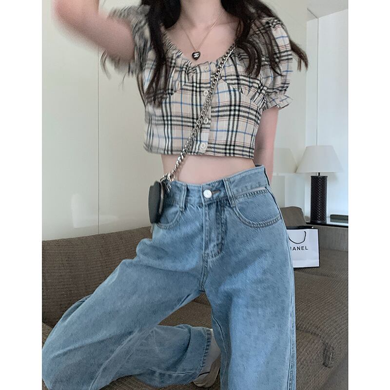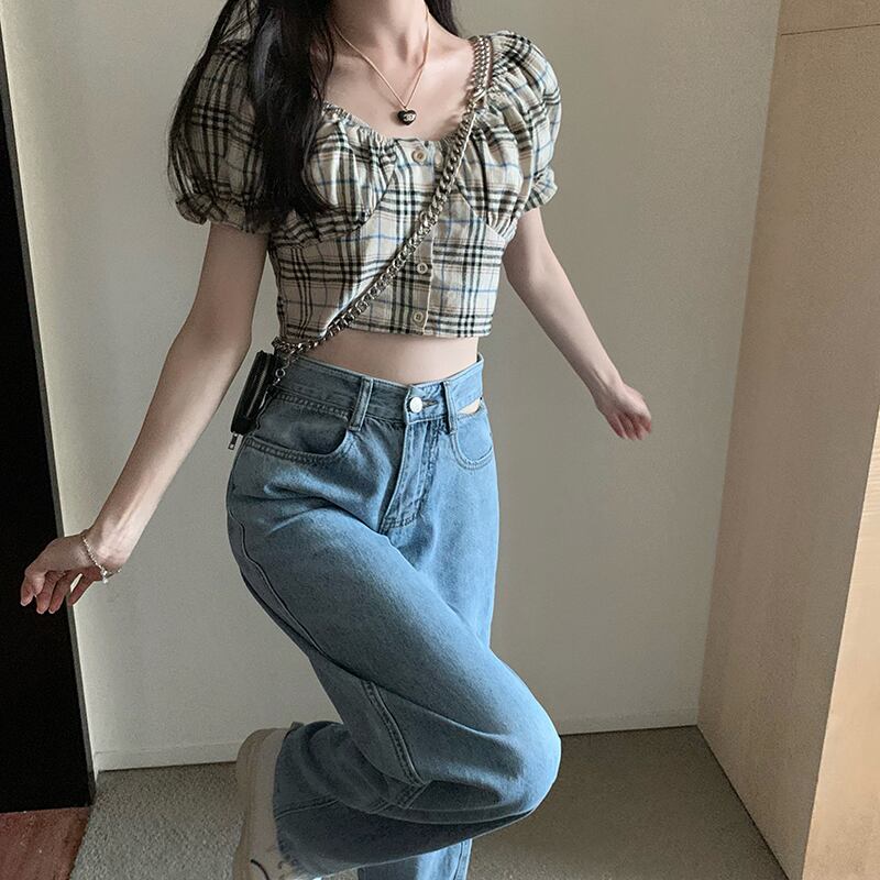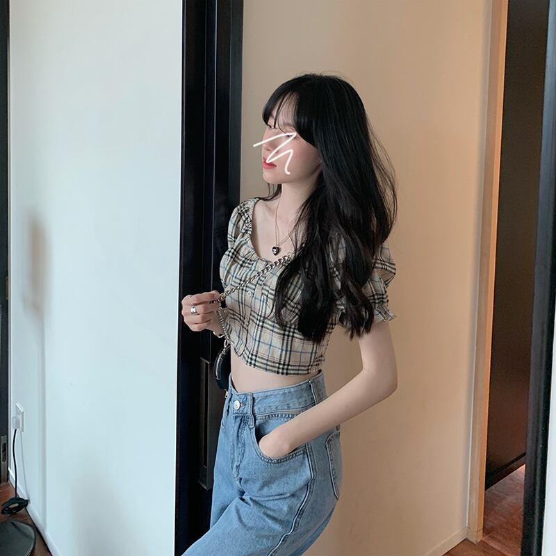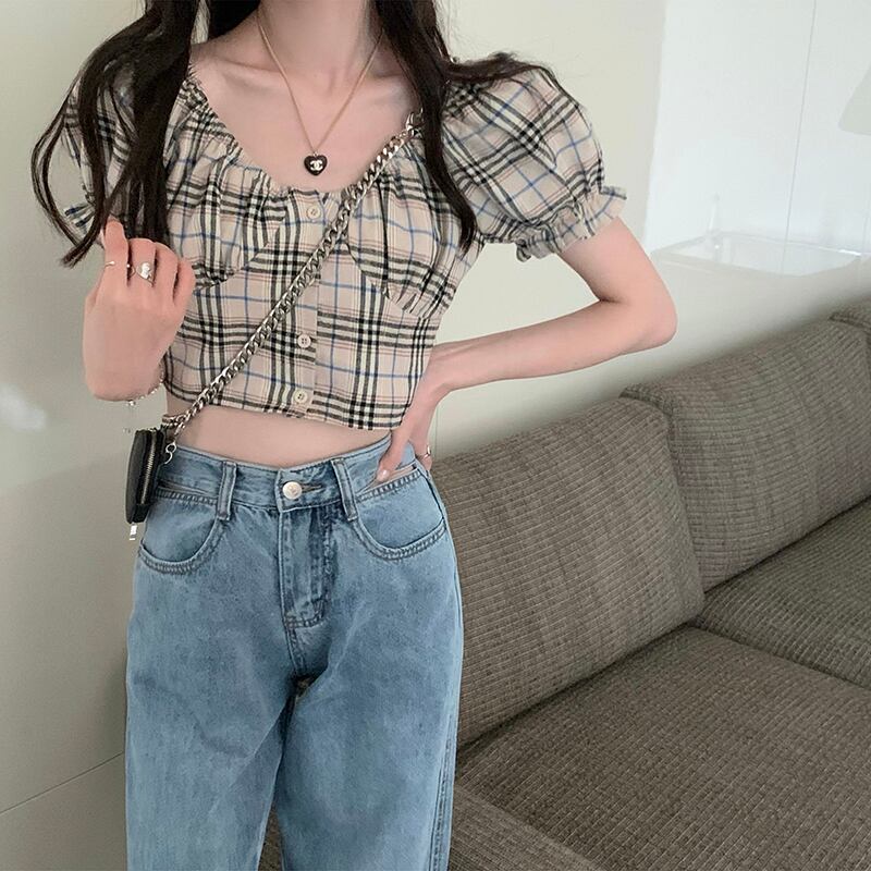甘いワンショルダーバブル半袖チェック柄シャツレディースデザインニッチシャツショートリーク鎖骨トップ 大人ガーリー スウィート キュート カジュアル 7460083555262862 | framboise21