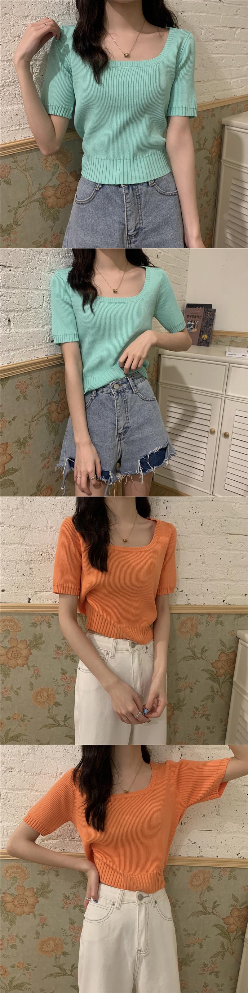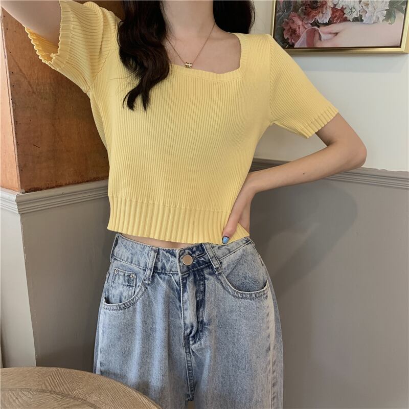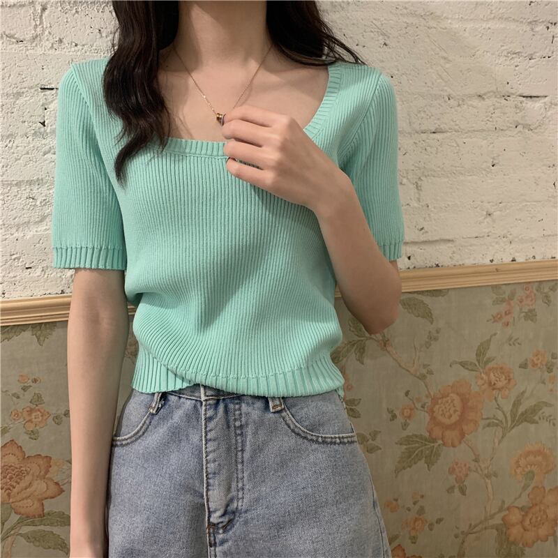 ヨーロッパとアメリカの半袖スクエアネックトップス2022年夏の新しい女性用アイスシルクニットセーターは、薄くて首の低い極薄のTシャツです。 サマー 夏物 スクウェア ヨーロピアン 7460049065609805 | framboise21