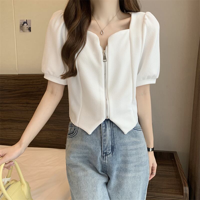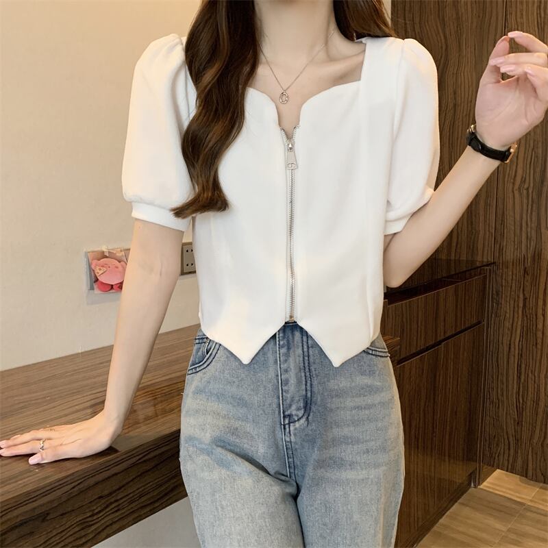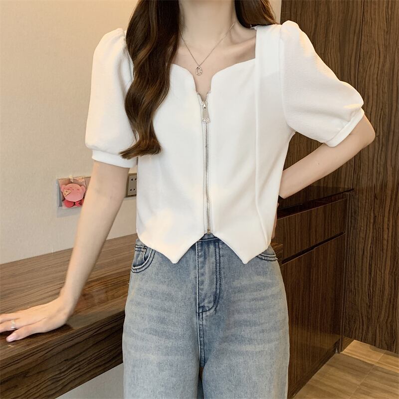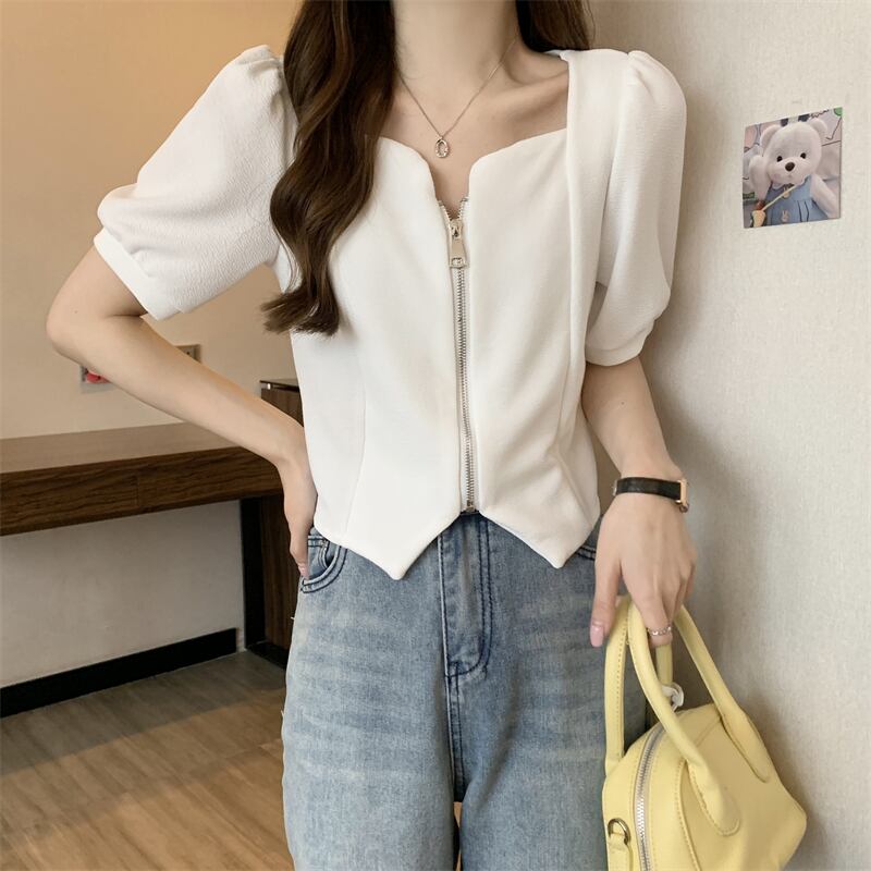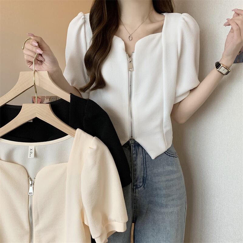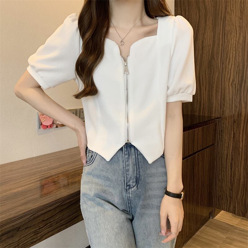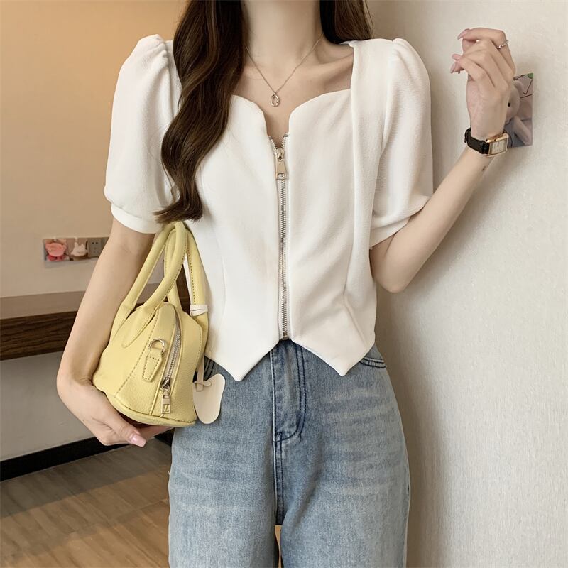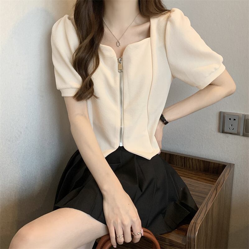 2022年小さな香りのよいフレンチスタイルのスクエアカラーの不規則なパフスリーブ半袖トップシャツ女性の夏のデザインセンスニッチ サマー 夏物 スクウェア 7460010819453407 | framboise21