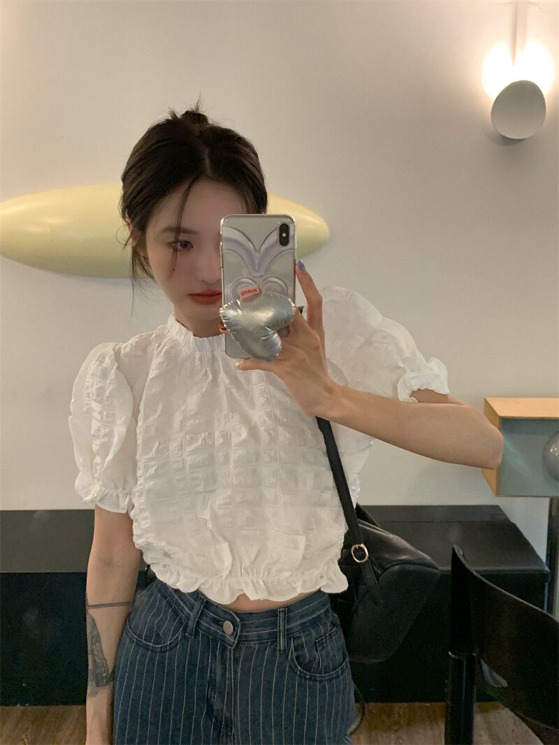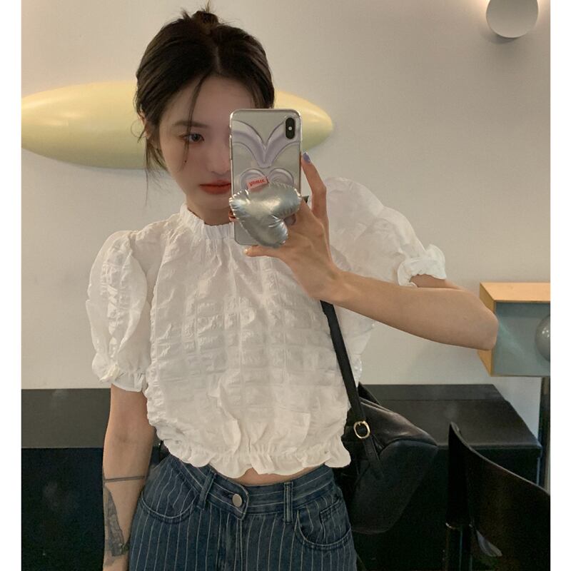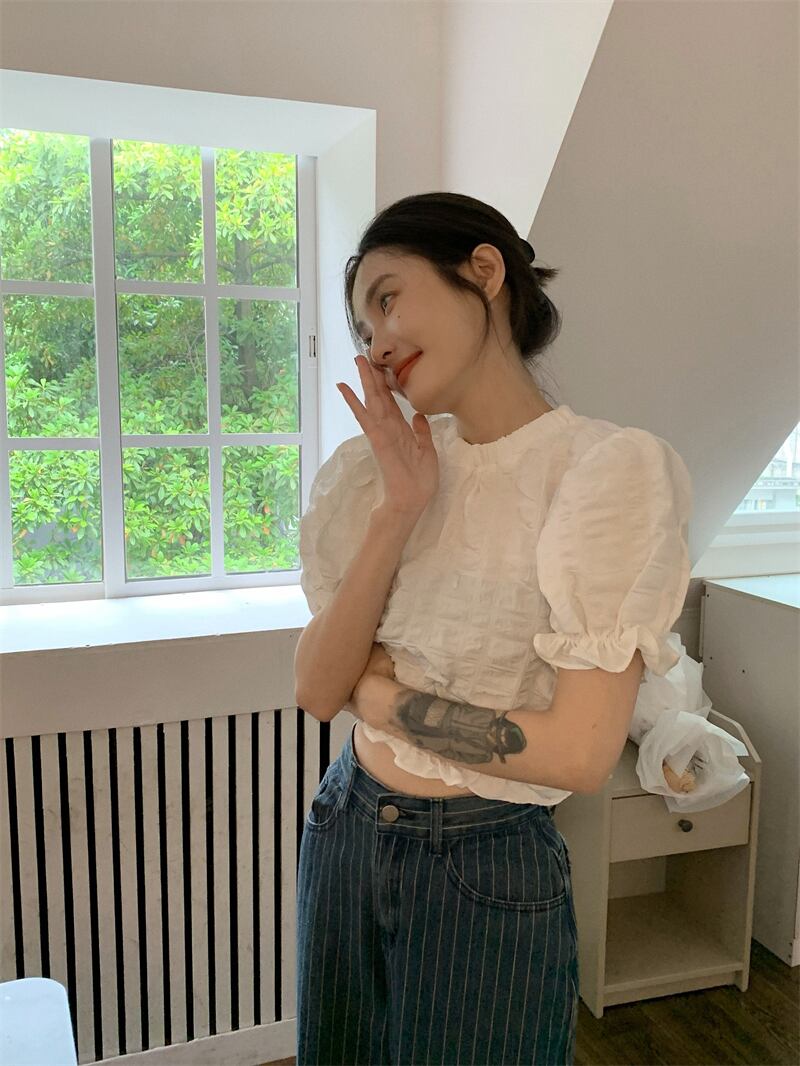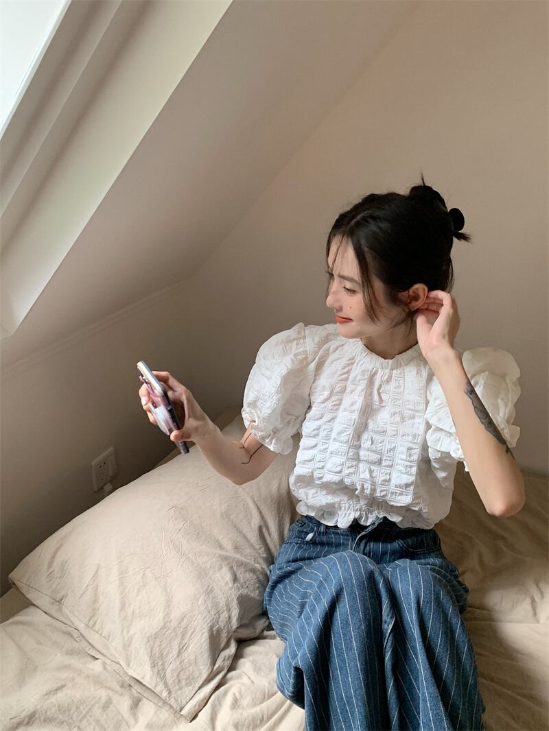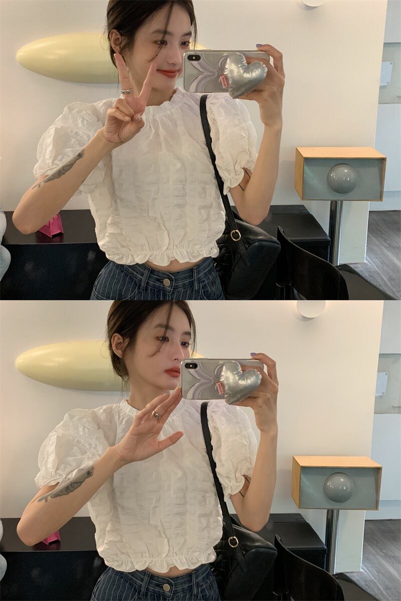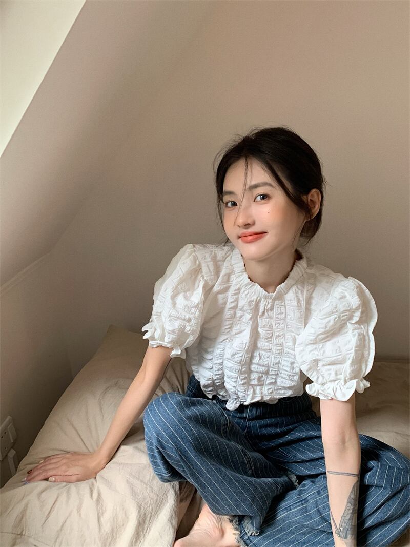 シックな白いシャツレディースデザインセンスニッチな夏シックなプリーツスリムフィットスリムパフスリーブショートトップトレンディ ホワイト サマー 夏物 7460092058125342 | framboise21