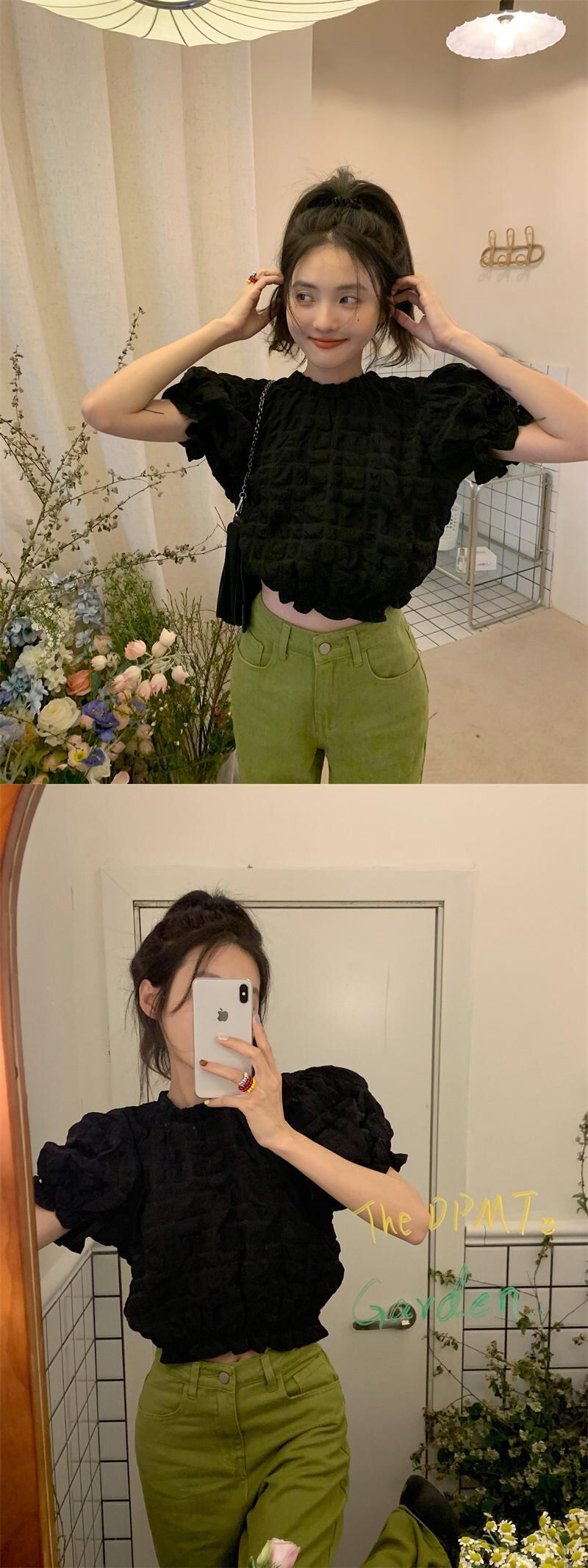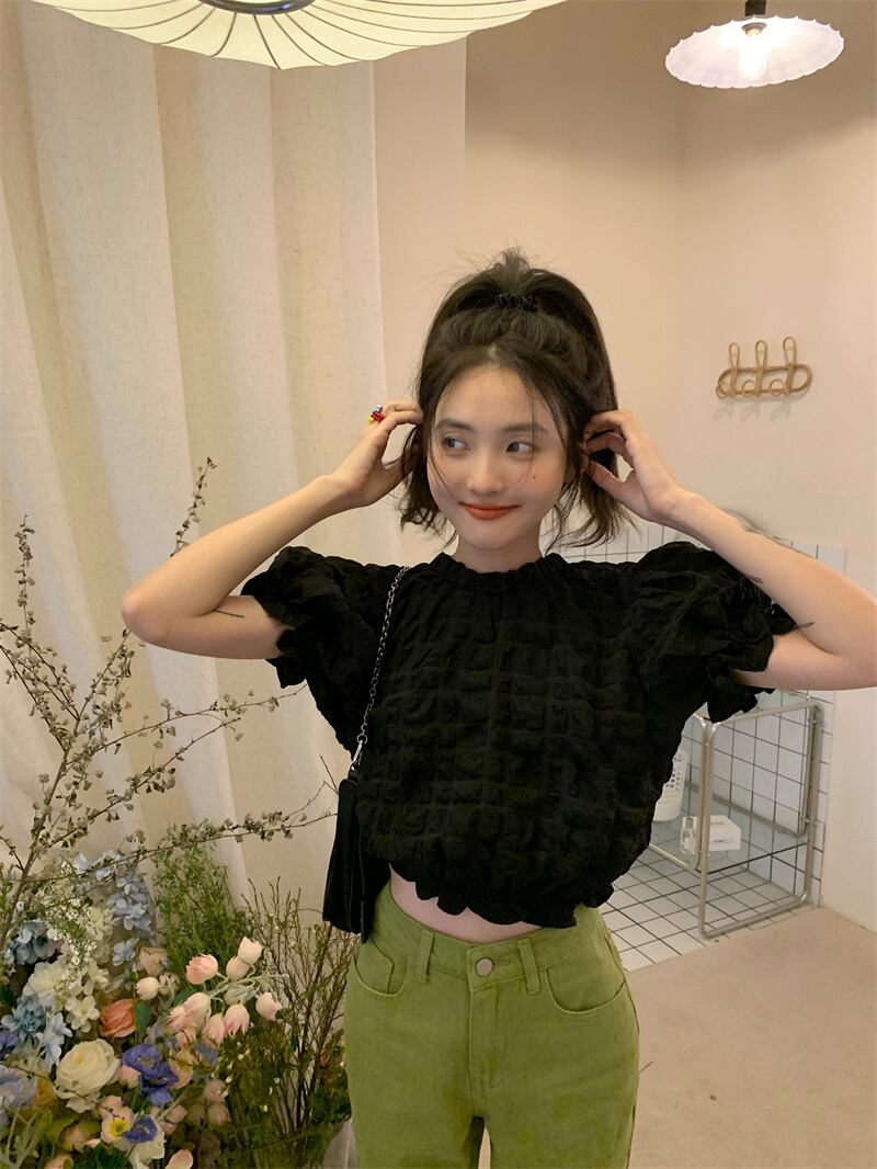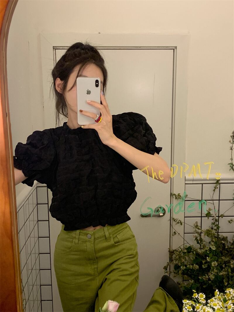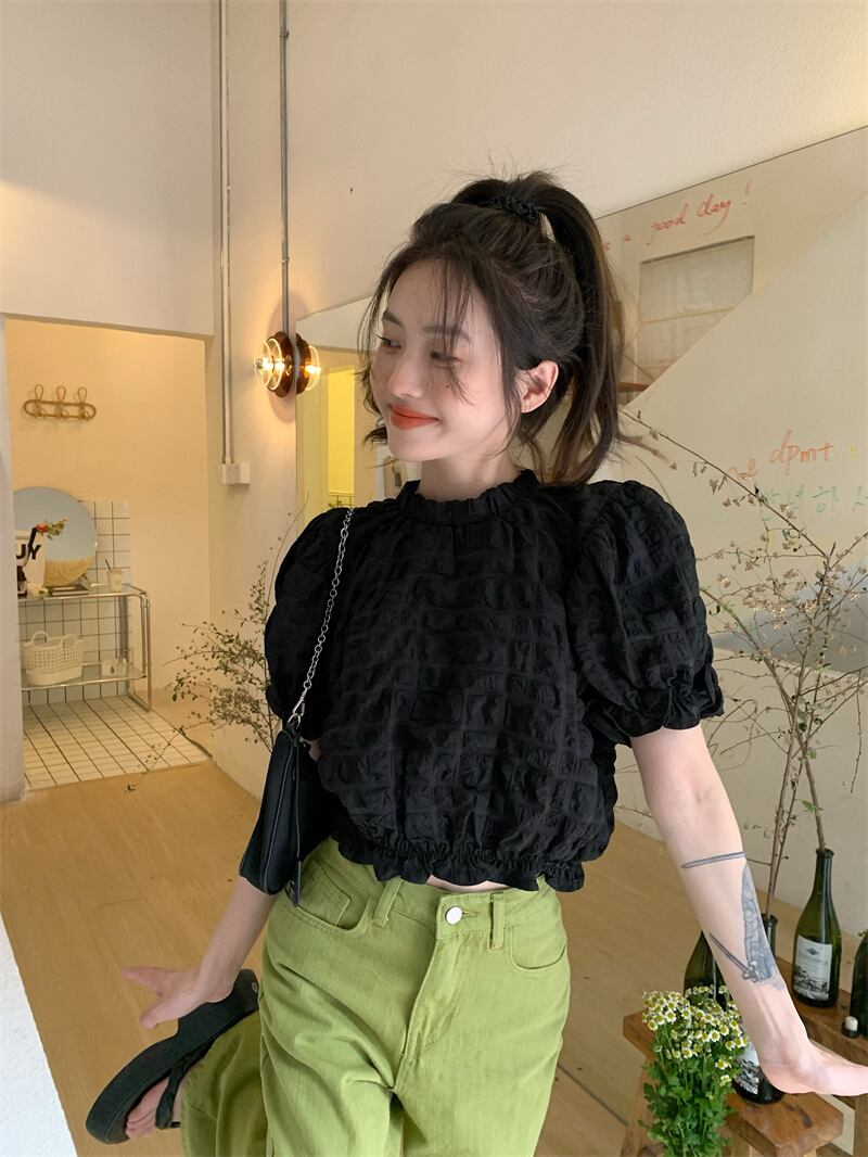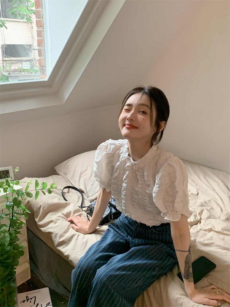シックな白いシャツレディースデザインセンスニッチな夏シックなプリーツスリムフィットスリムパフスリーブショートトップトレンディ ホワイト サマー 夏物 7460092058125342 | framboise21