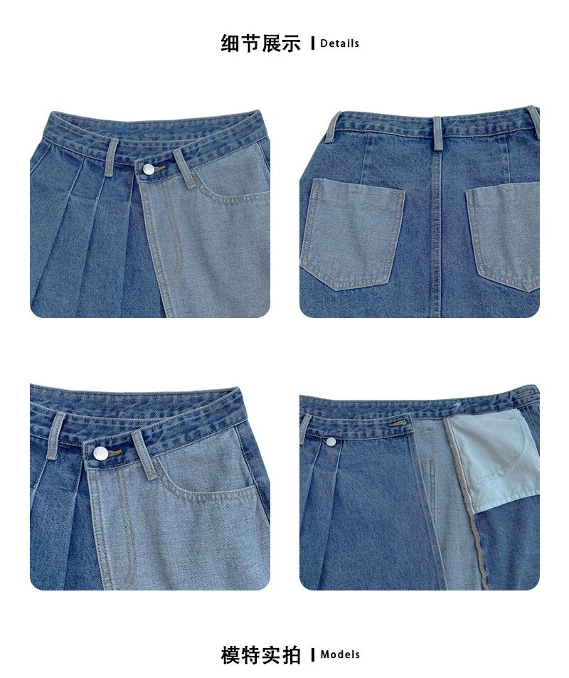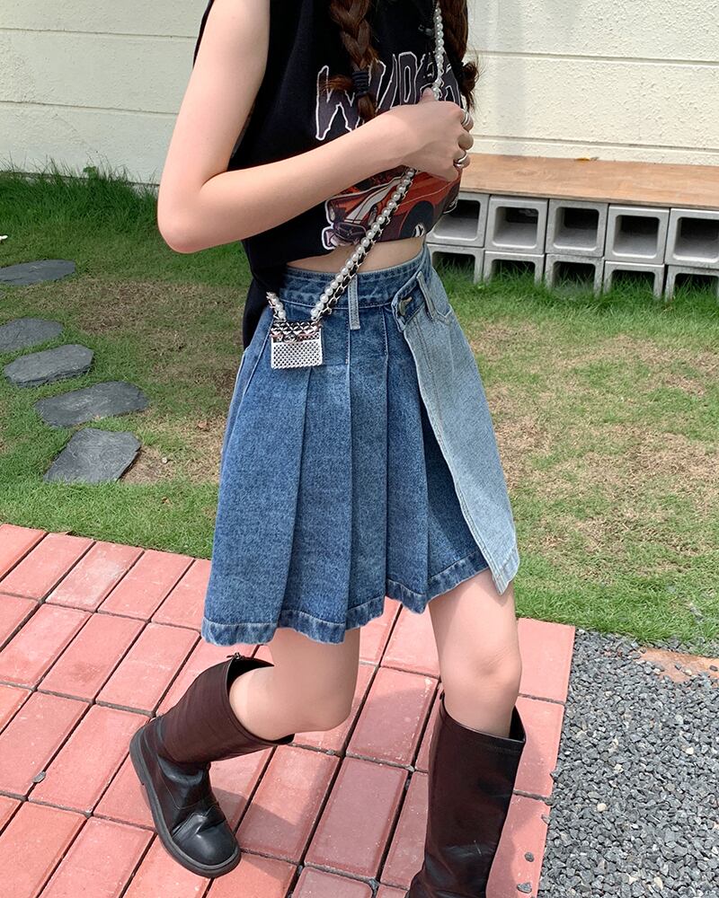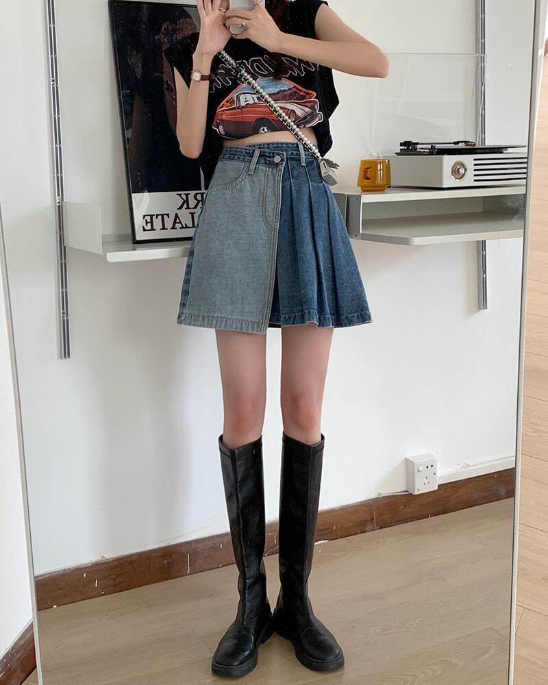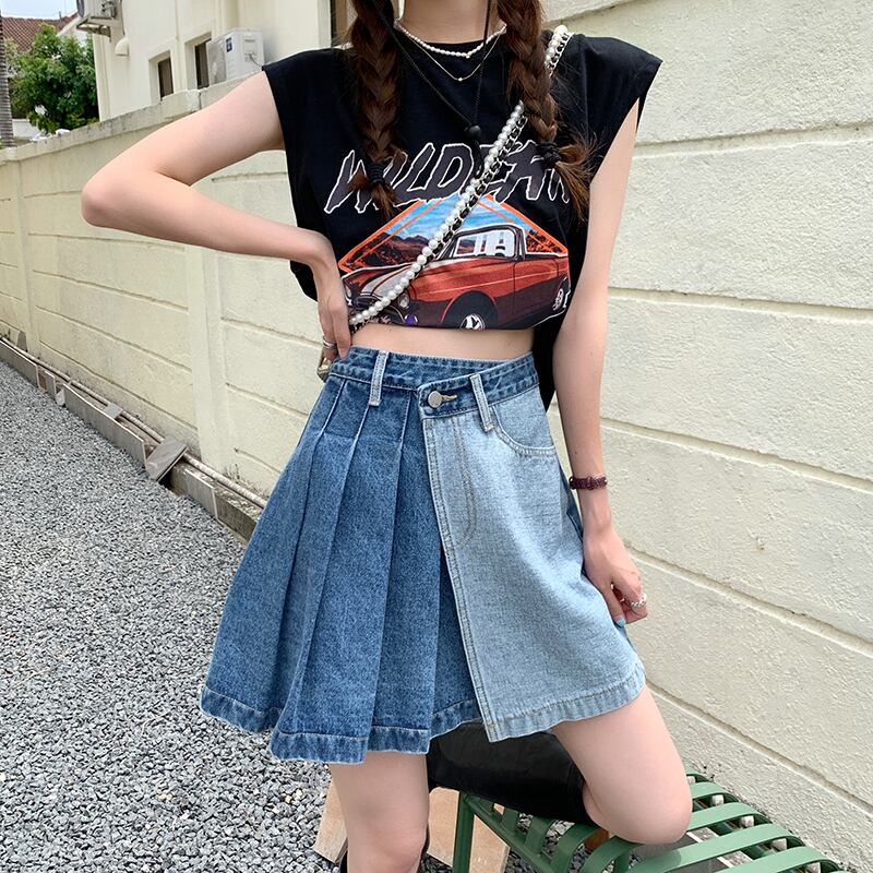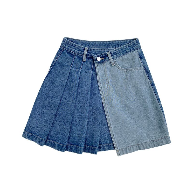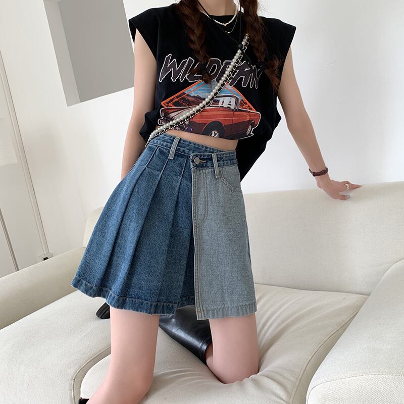 2022年夏の新作カレッジスタイルデザインセンスカラーマッチングハイウエストプリーツオールマッチデニムスカートイレギュラースカート ハイウェスト サマー 夏物 7460073847120182 | framboise21