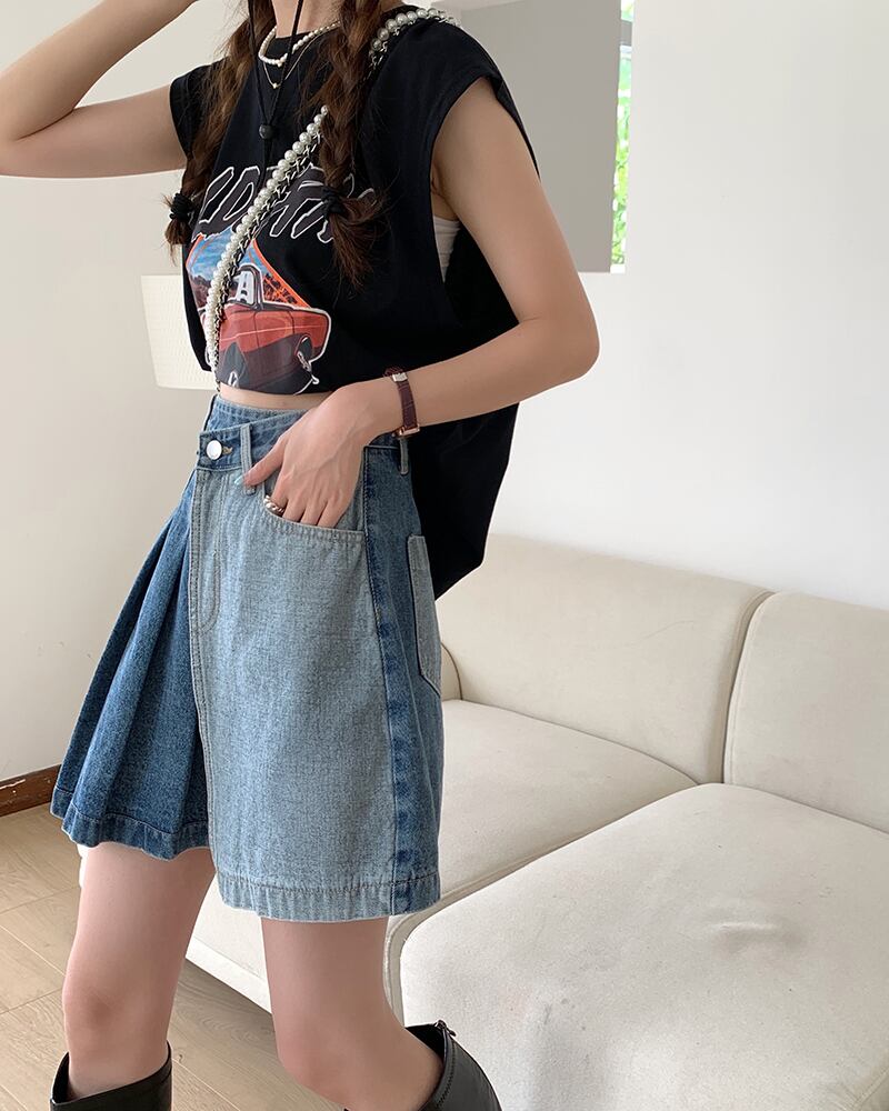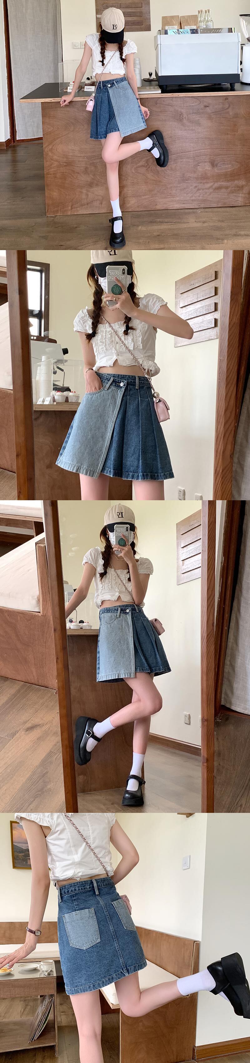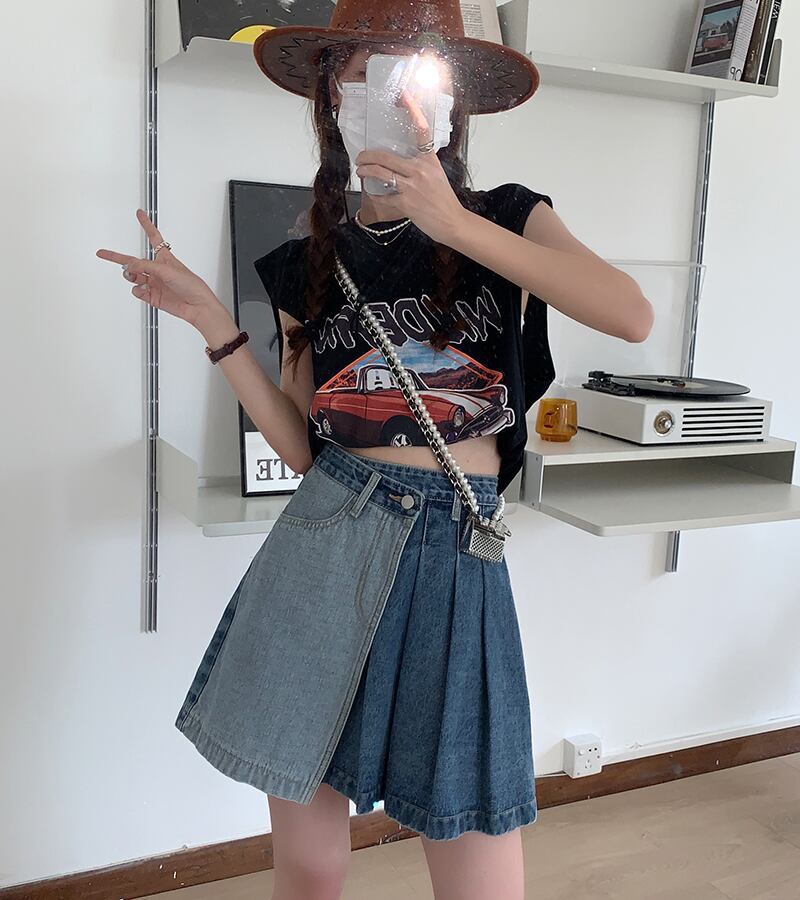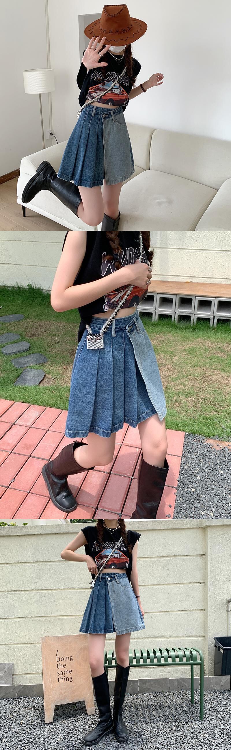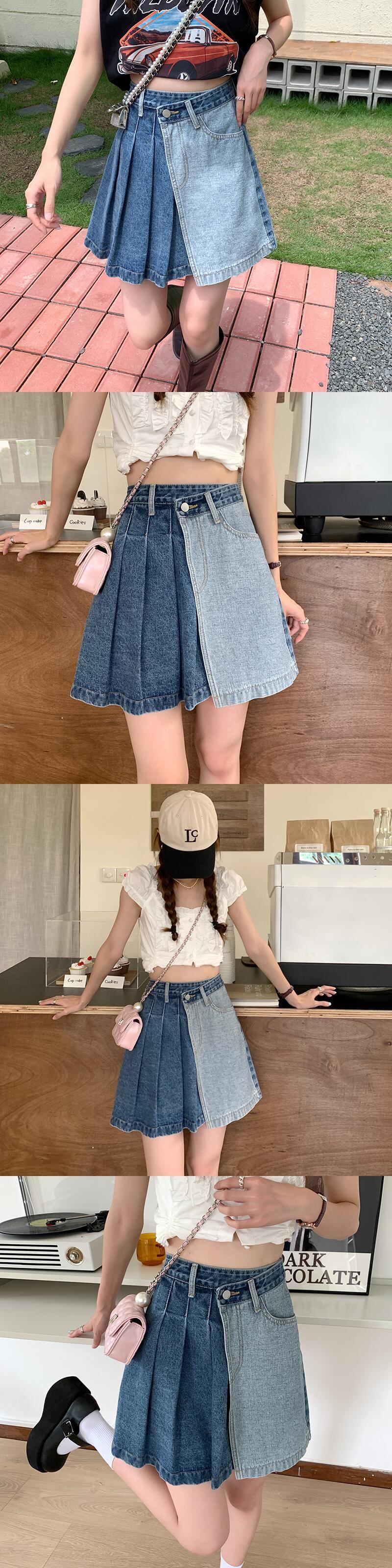 2022年夏の新作カレッジスタイルデザインセンスカラーマッチングハイウエストプリーツオールマッチデニムスカートイレギュラースカート ハイウェスト サマー 夏物 7460073847120182 | framboise21
