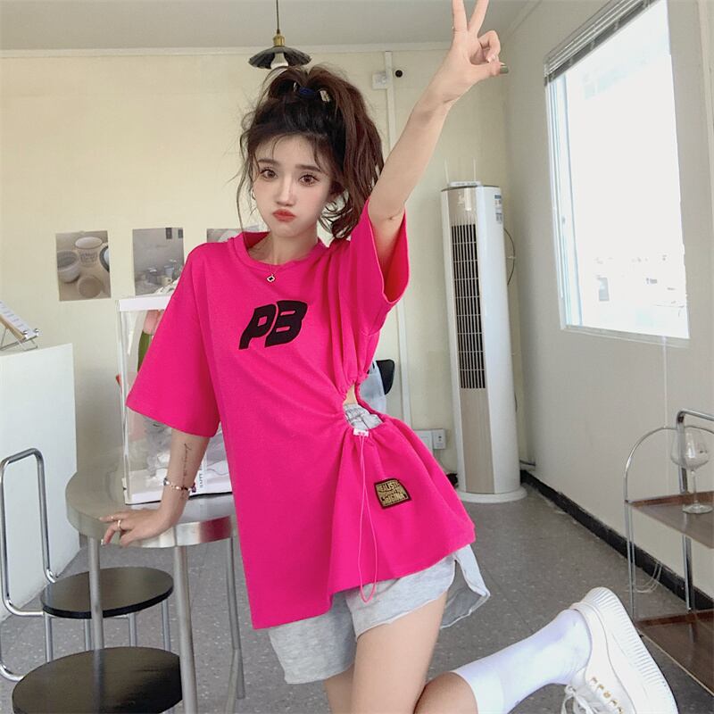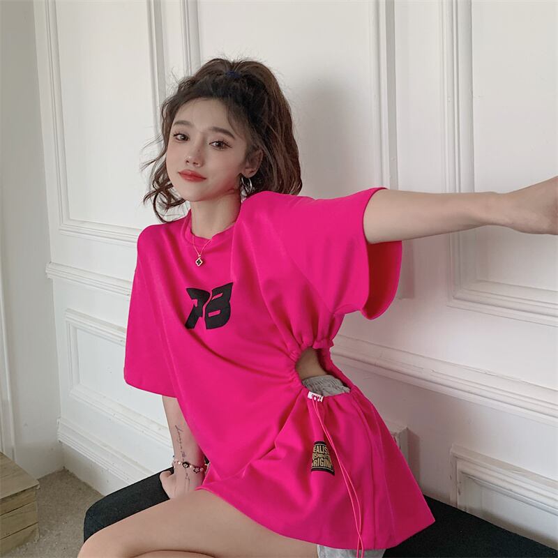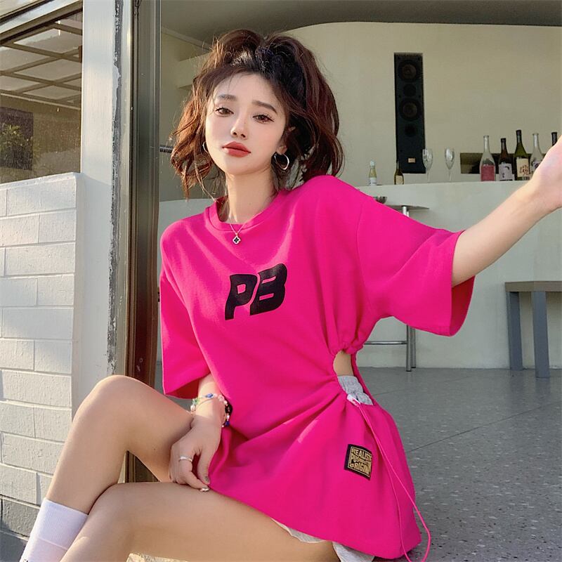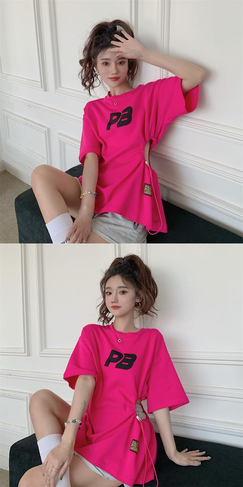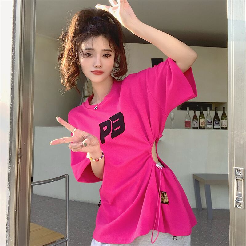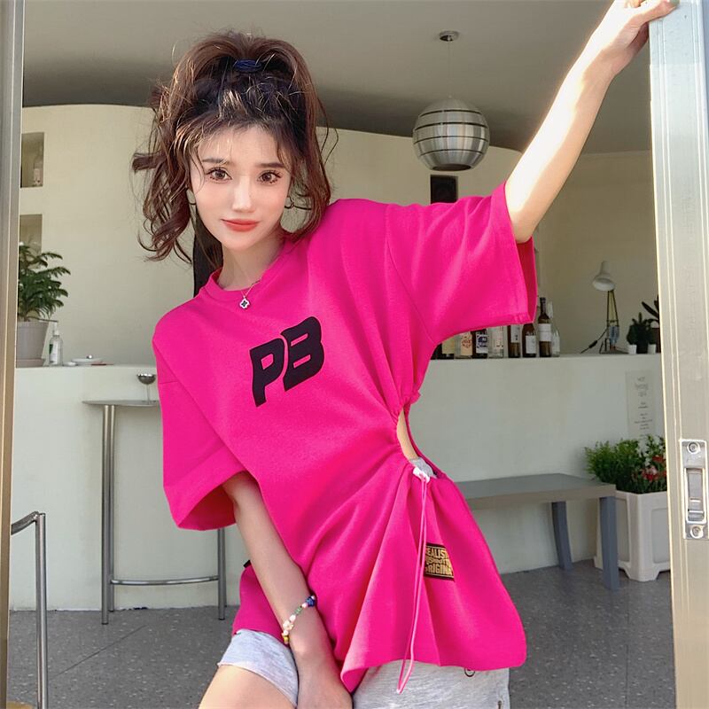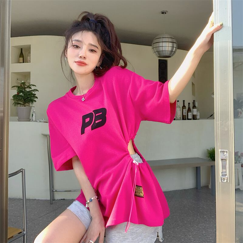 サイドウエストドローストリング半袖Tシャツレディースミドル丈サマーシックローズレッド甘くてスパイシーなトップデザインニッチ 大人ガーリー スウィート キュート カジュアル 夏物 7460094392658553 | framboise21