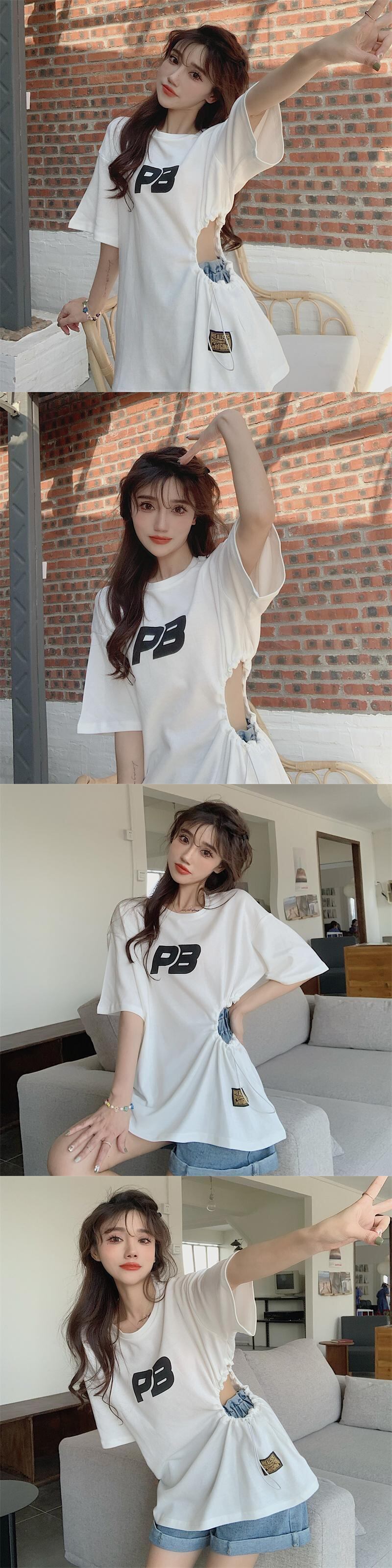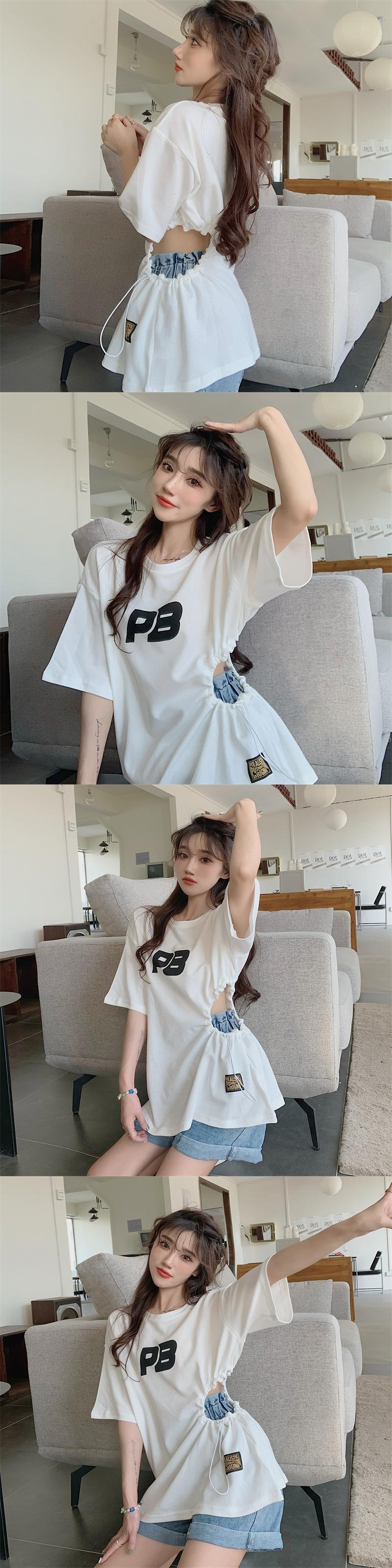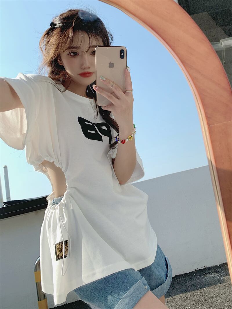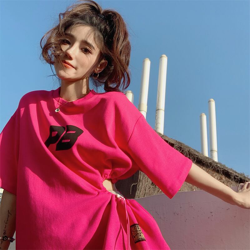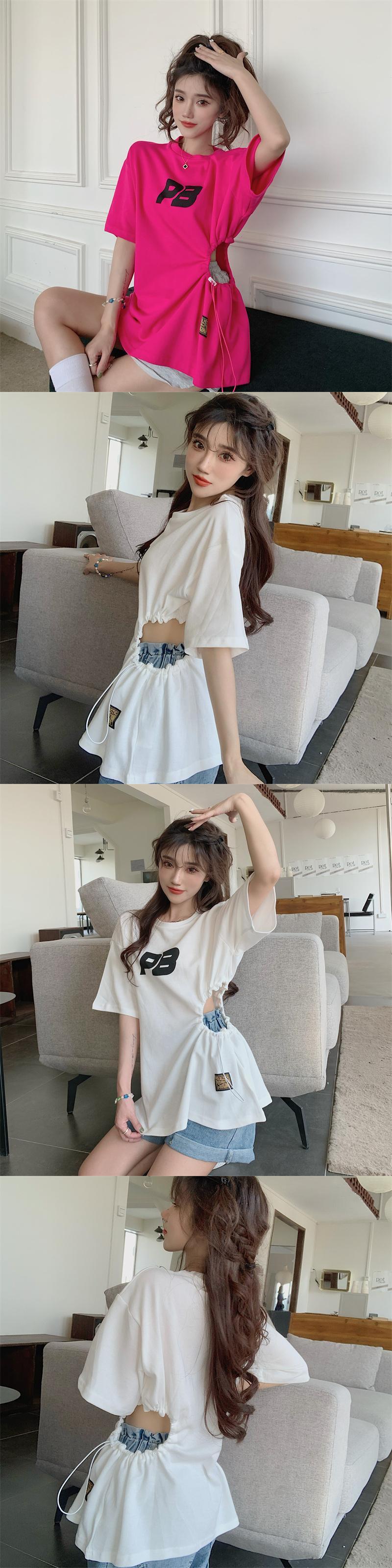 サイドウエストドローストリング半袖Tシャツレディースミドル丈サマーシックローズレッド甘くてスパイシーなトップデザインニッチ 大人ガーリー スウィート キュート カジュアル 夏物 7460094392658553 | framboise21
