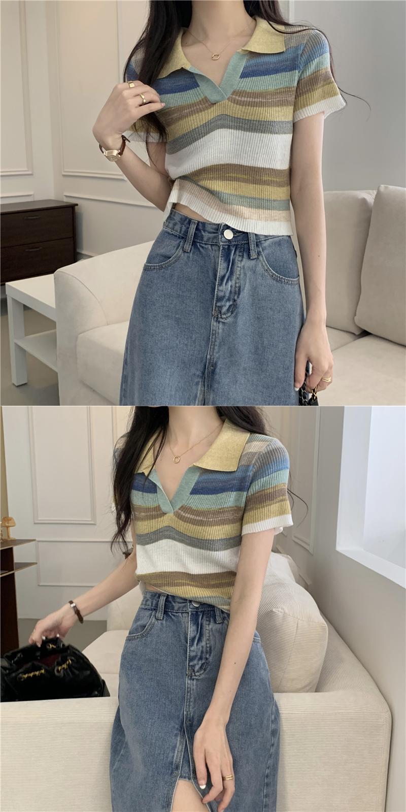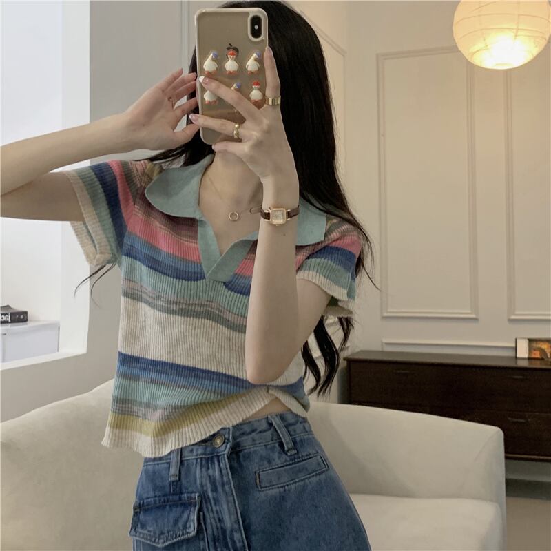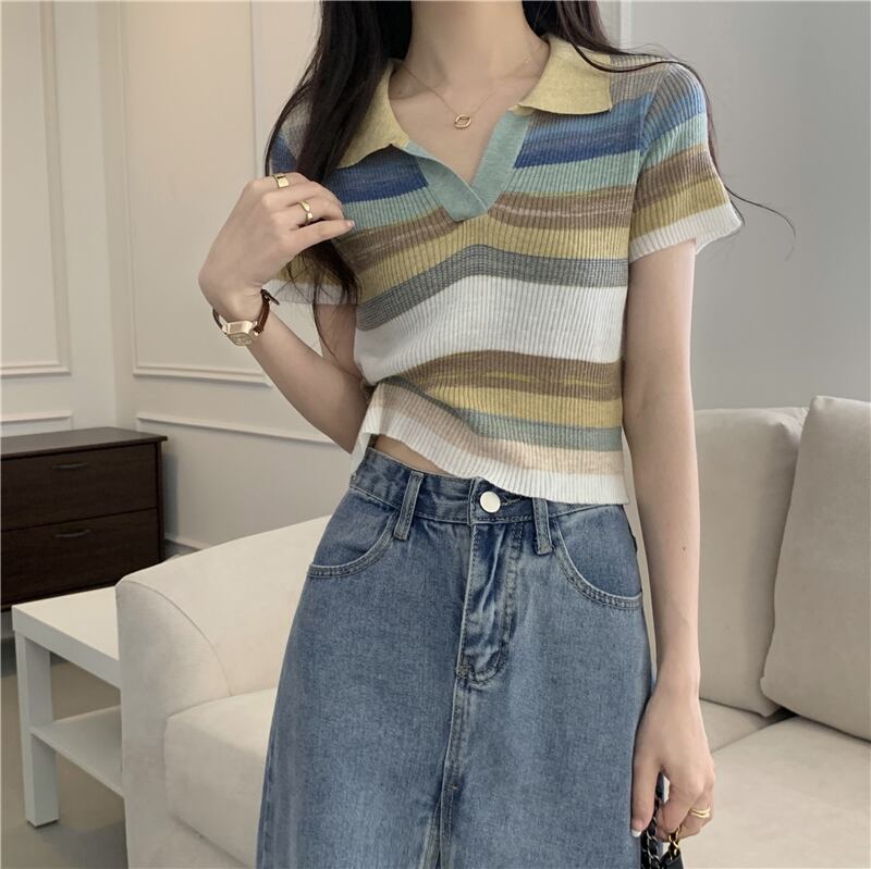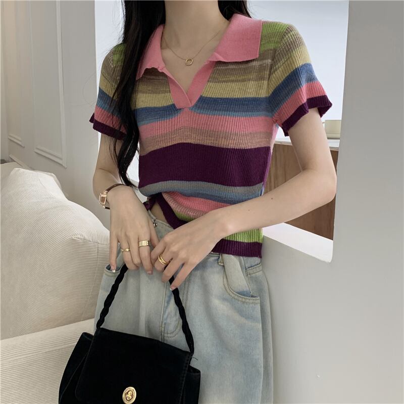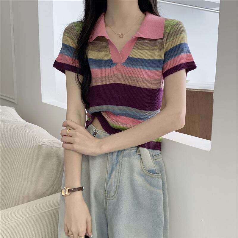 レインボーストライプポロカラーフロントショルダーニット半袖Tシャツレディース2022年夏新作デザインショートアイスシルクトップス サマー 夏物 7460046061876041 | framboise21