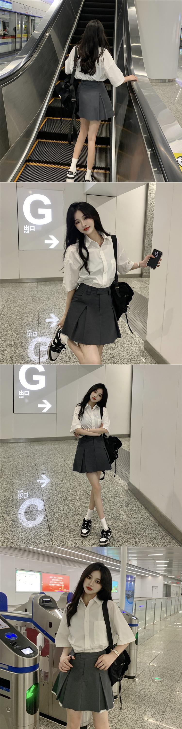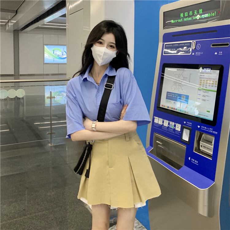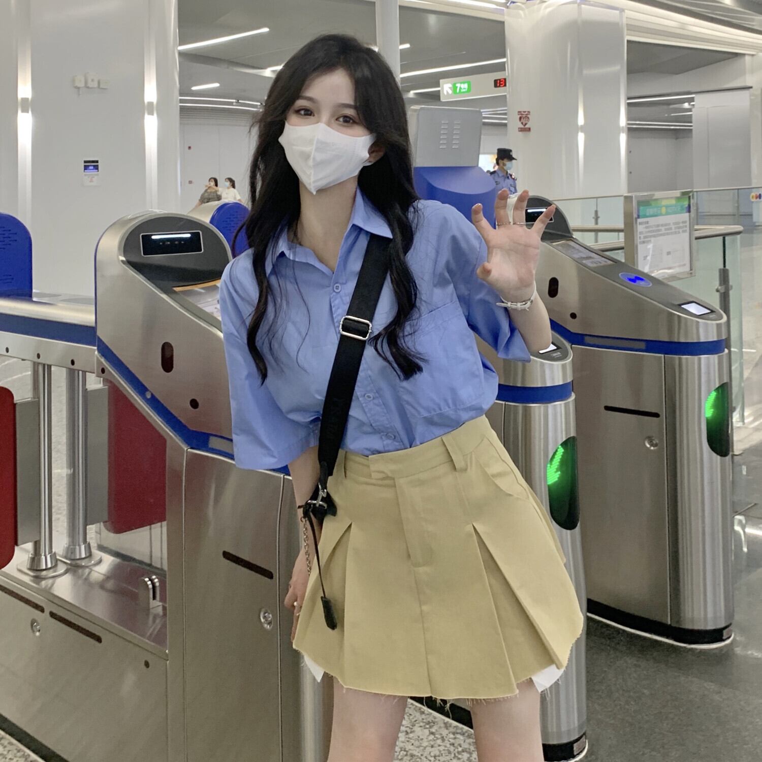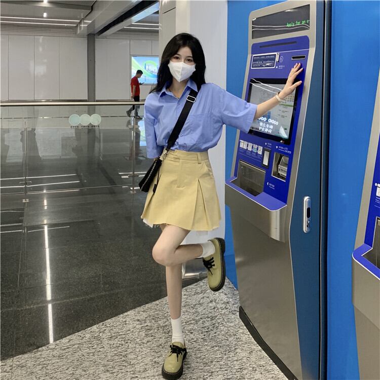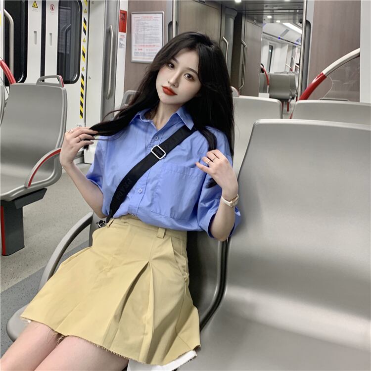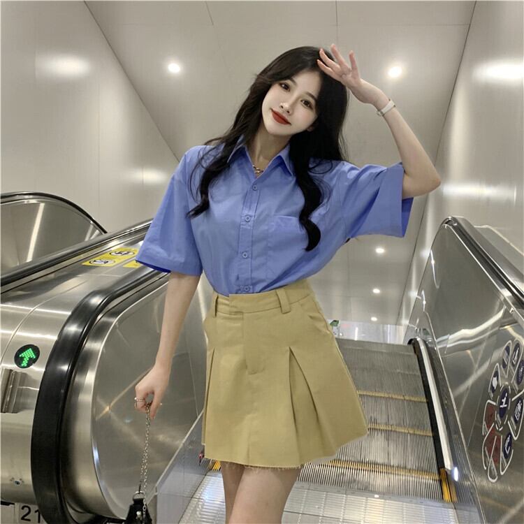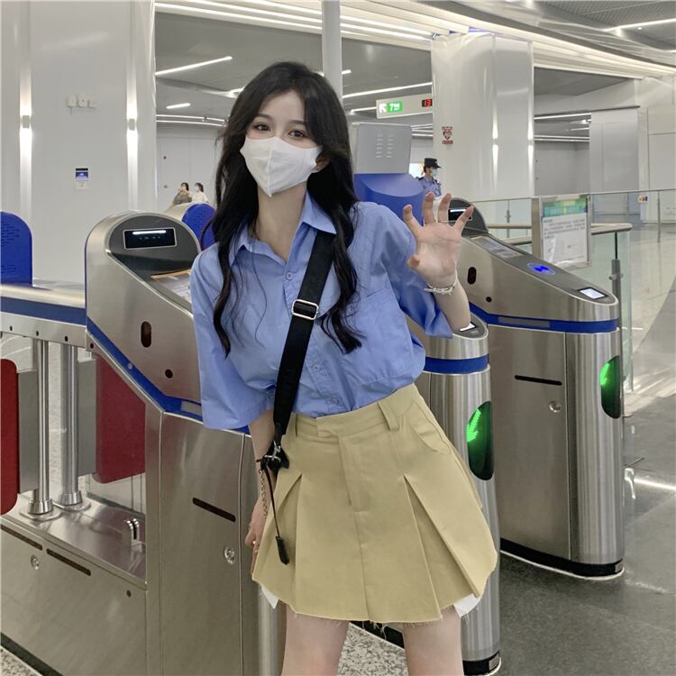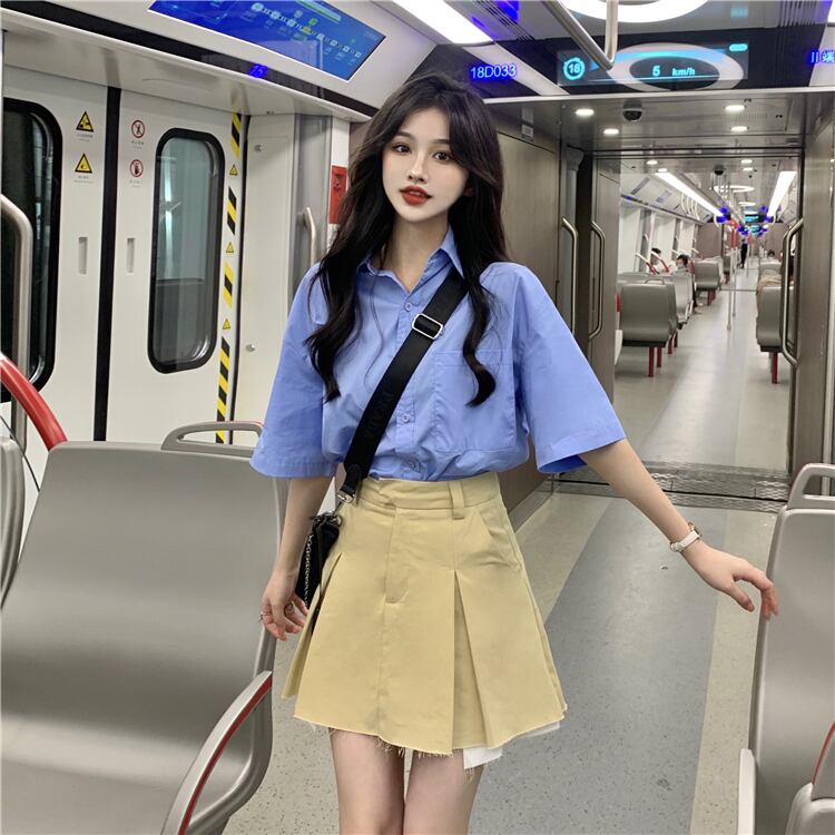 色:青いシャツ,白のシャツ,カーキ色のスカート,グレースカート