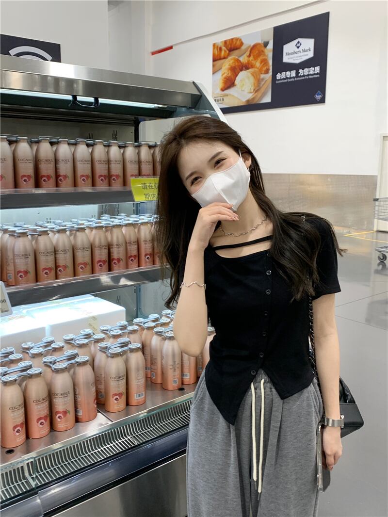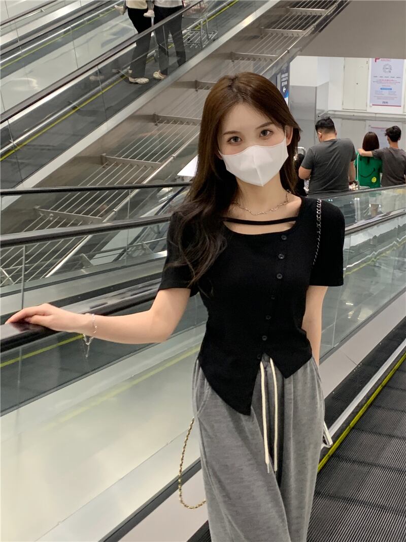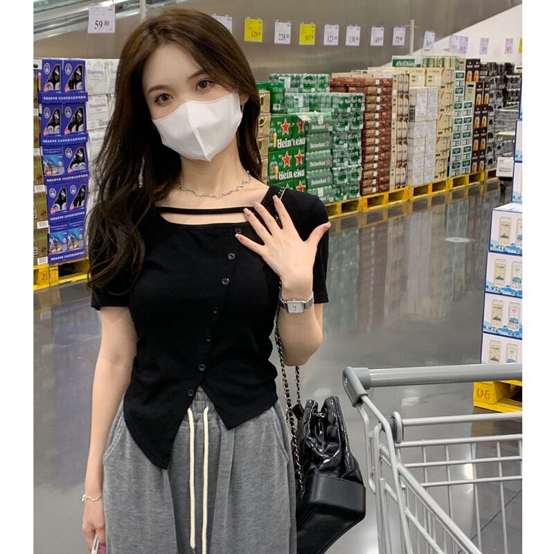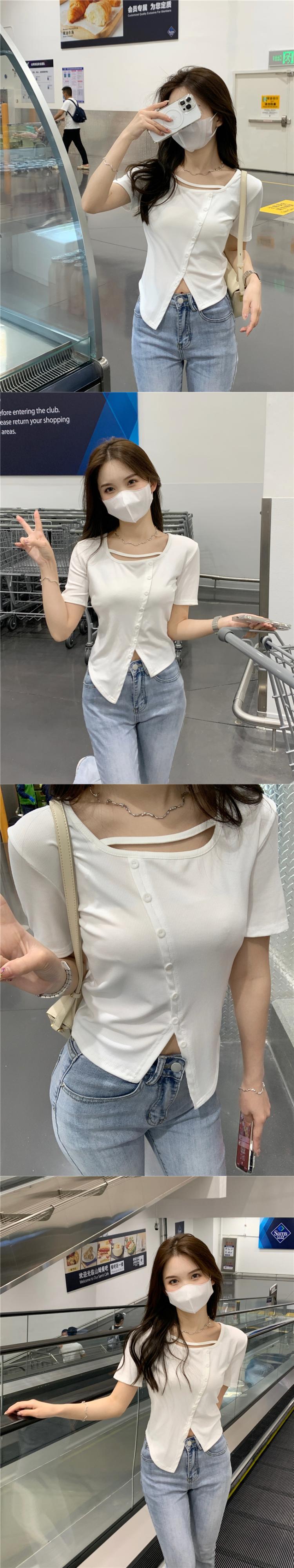 2022年の新しいシックでユニークなトップイントレンディな短い不規則な半袖フロントショルダーTシャツ女性の夏のデザインのニッチ ショート サマー 夏物 7460040323089113 | framboise21