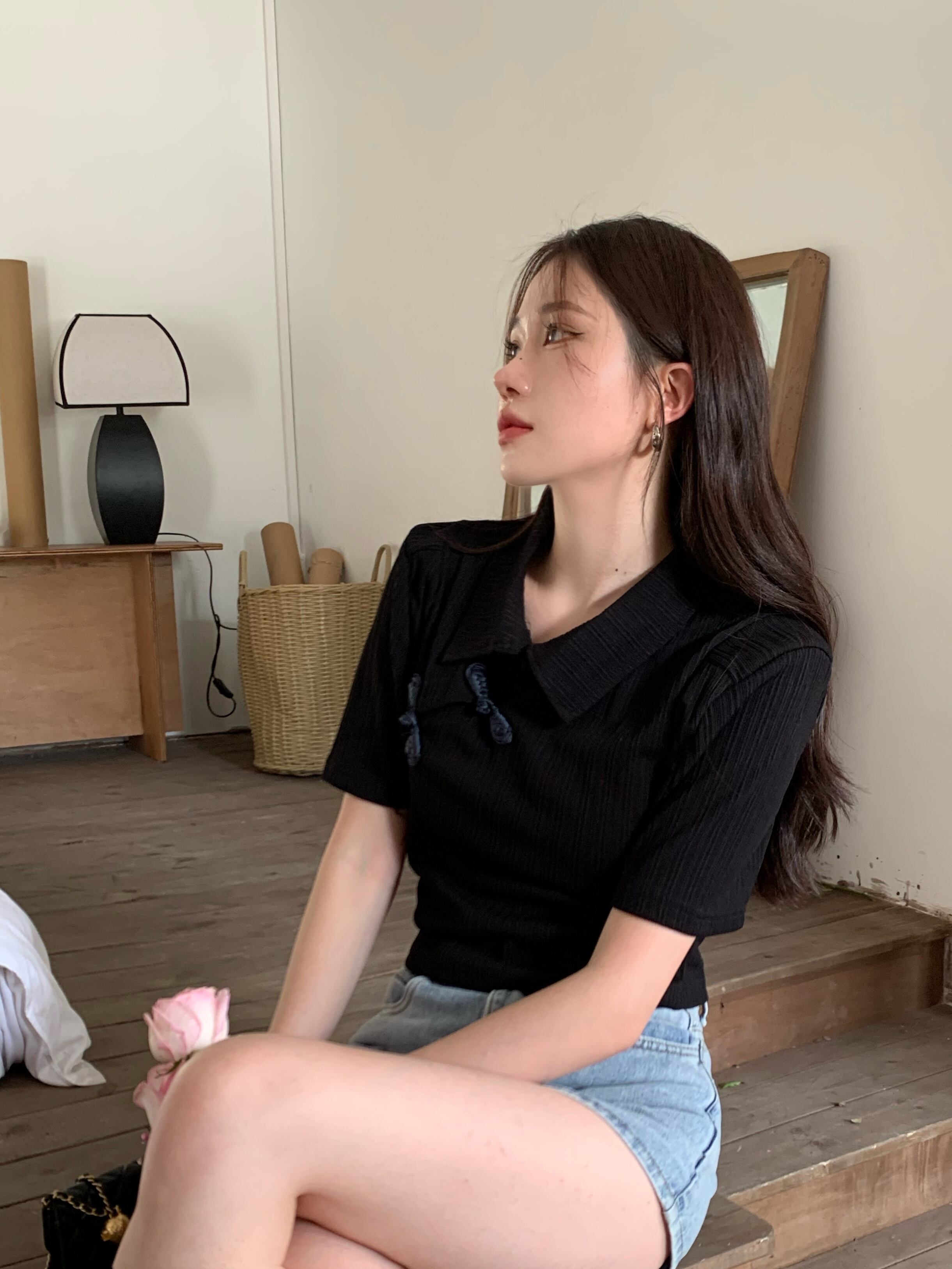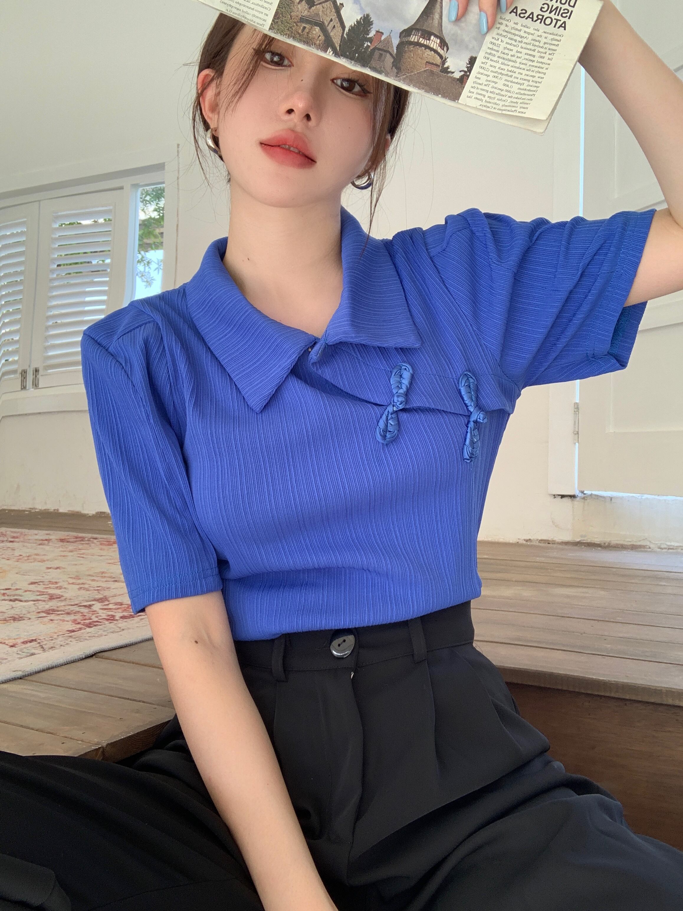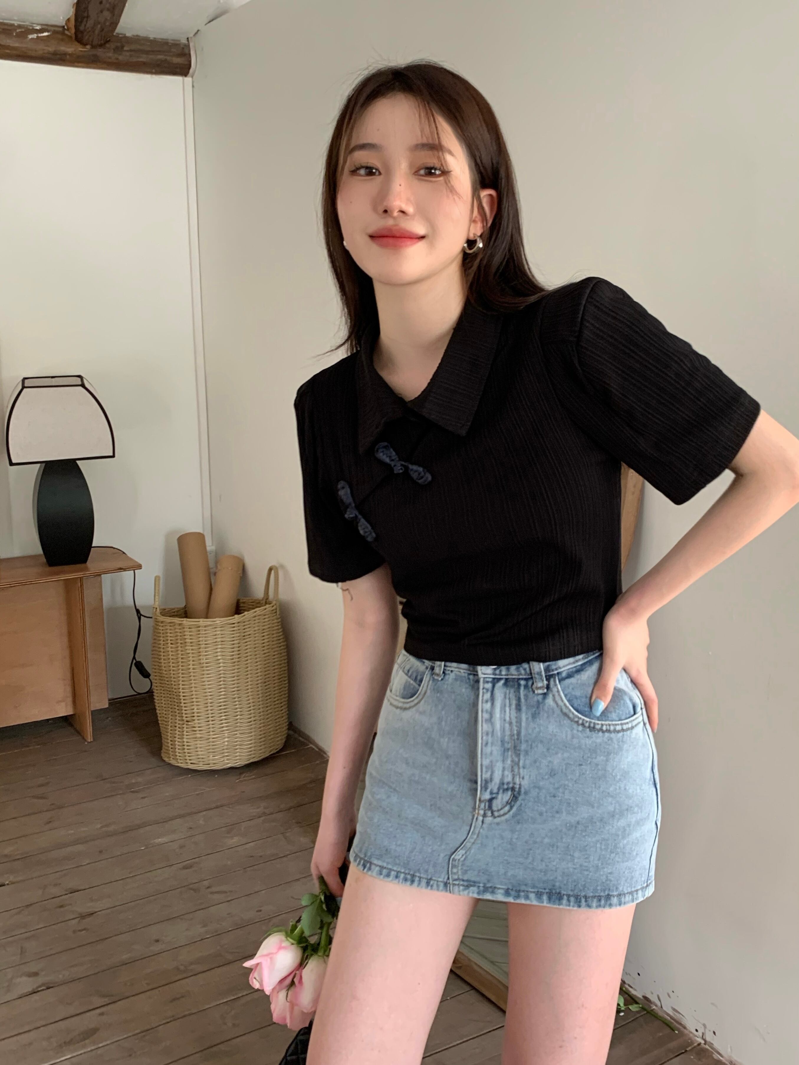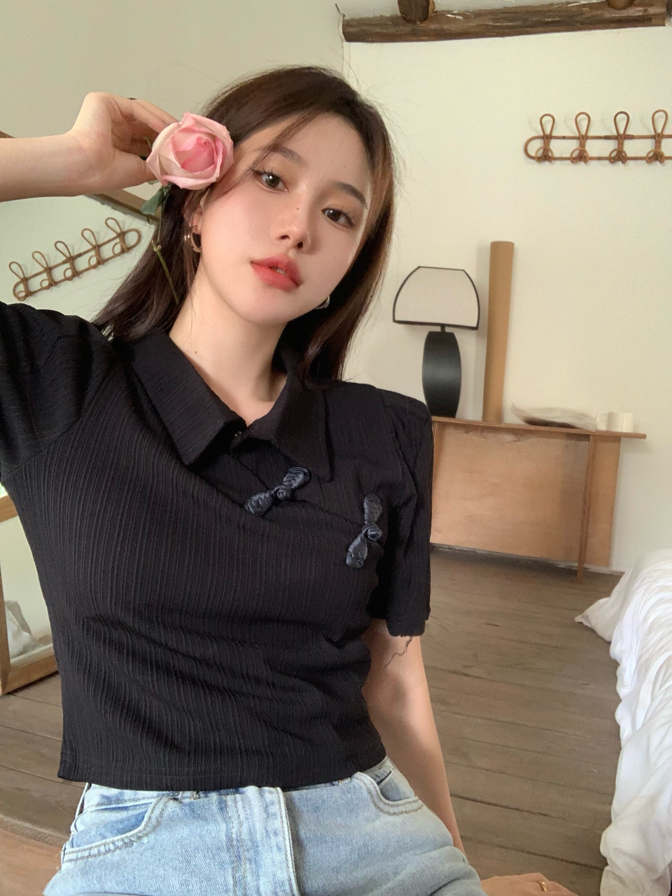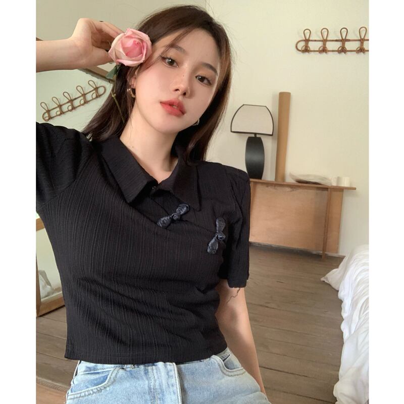 黒の半袖Tシャツ女性の夏のデザインセンスニッチ新しい中国の女性のナショナルスタイルのレトロなバックルシックなショートトップ ブラック サマー 夏物 7460021801812274 | framboise21
