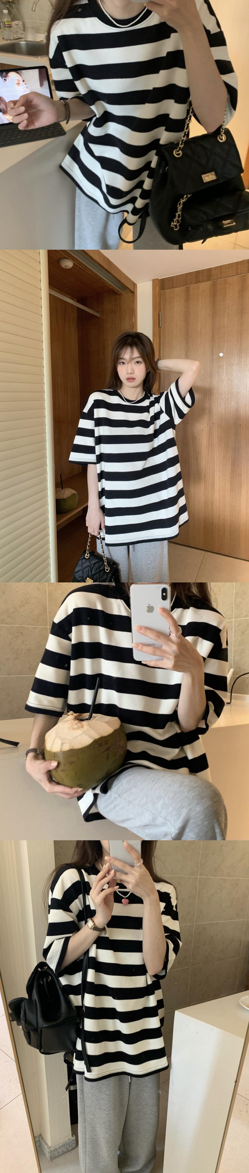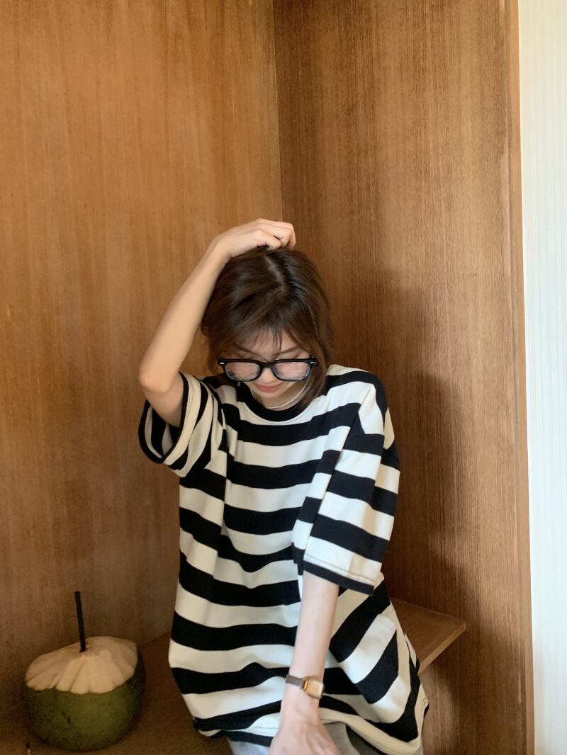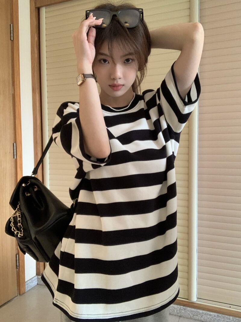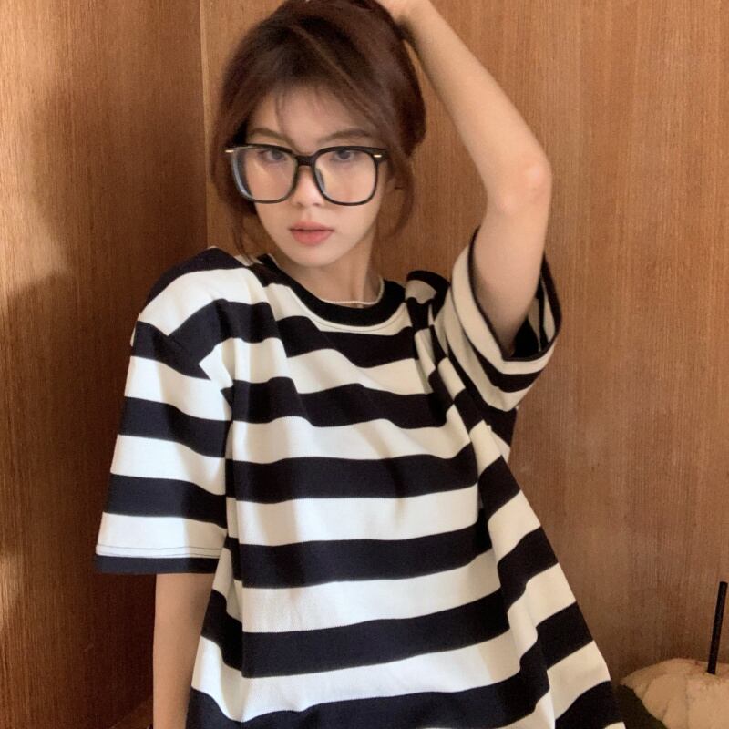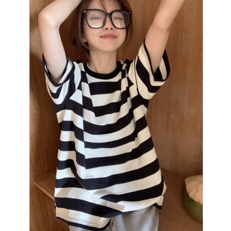 黒と白のストライプの半袖Tシャツレディースインスティッドサマーカジュアルラウンドネックルーズシンオーバーサイズミドル丈トップ ホワイト ブラック 夏物 Oネック 7460056412967162 | framboise21
