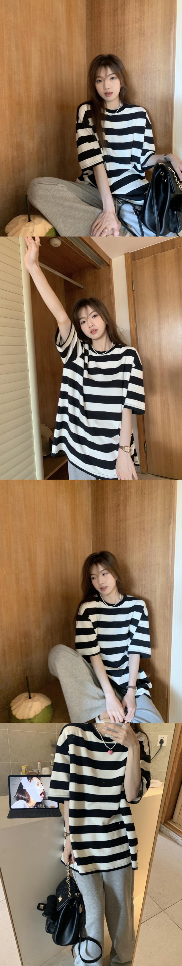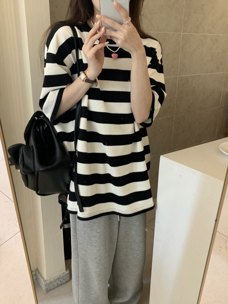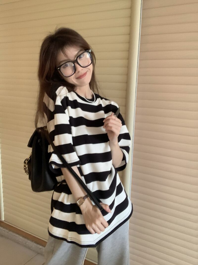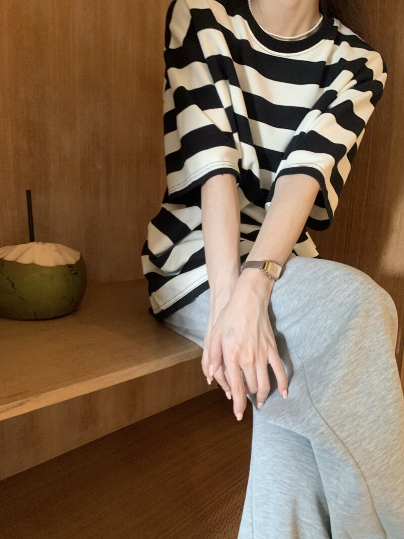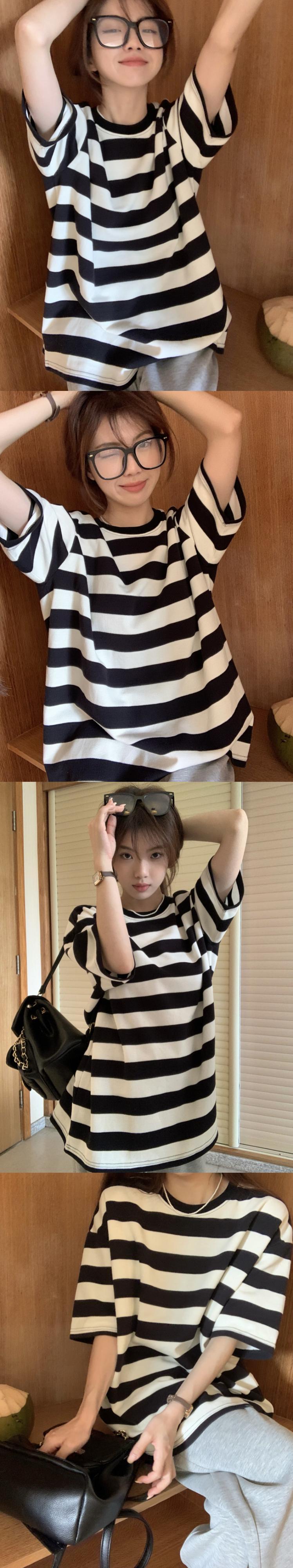 黒と白のストライプの半袖Tシャツレディースインスティッドサマーカジュアルラウンドネックルーズシンオーバーサイズミドル丈トップ ホワイト ブラック 夏物 Oネック 7460056412967162 | framboise21