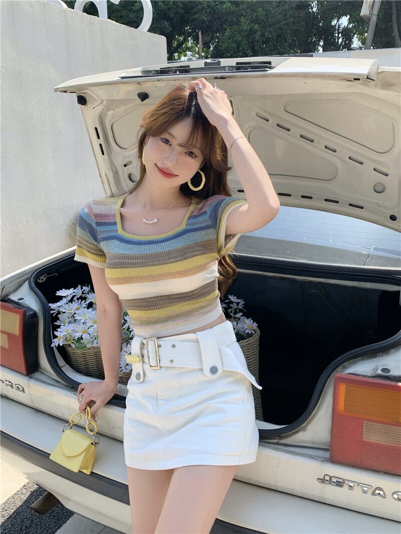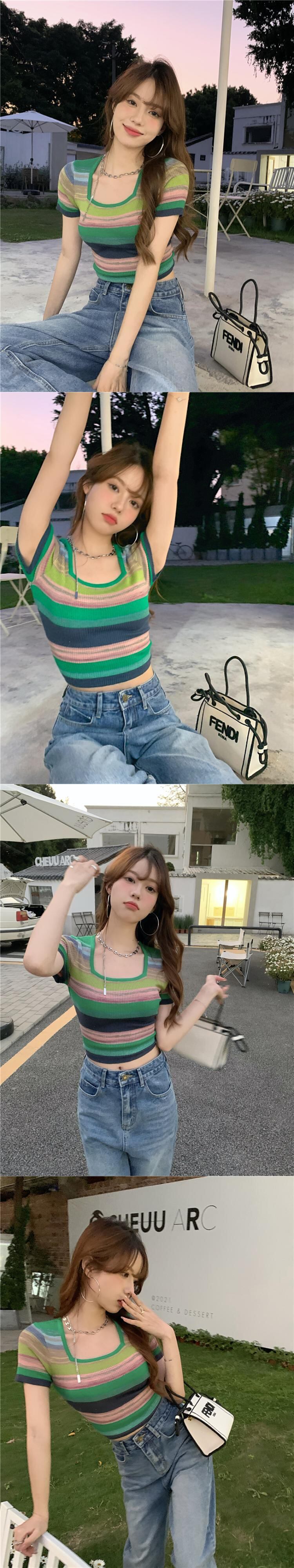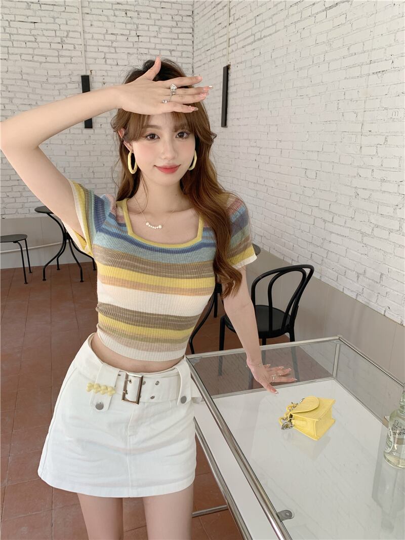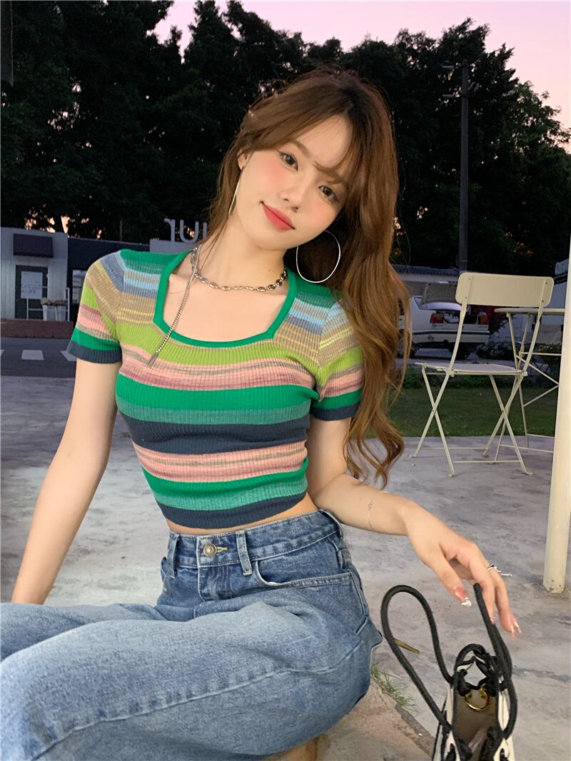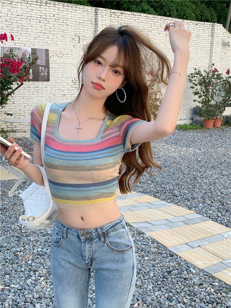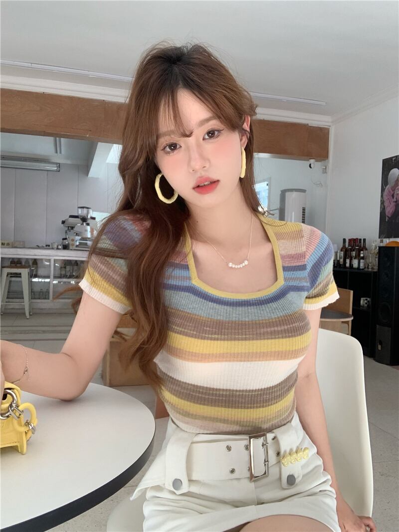 アイスシルクニットストライプスクエアネック半袖Tシャツレディースデザインセンスニッチ夏純粋な欲望セクシーショートトップ サマー 夏物 ピュア スクウェア 7460098657540846 | framboise21