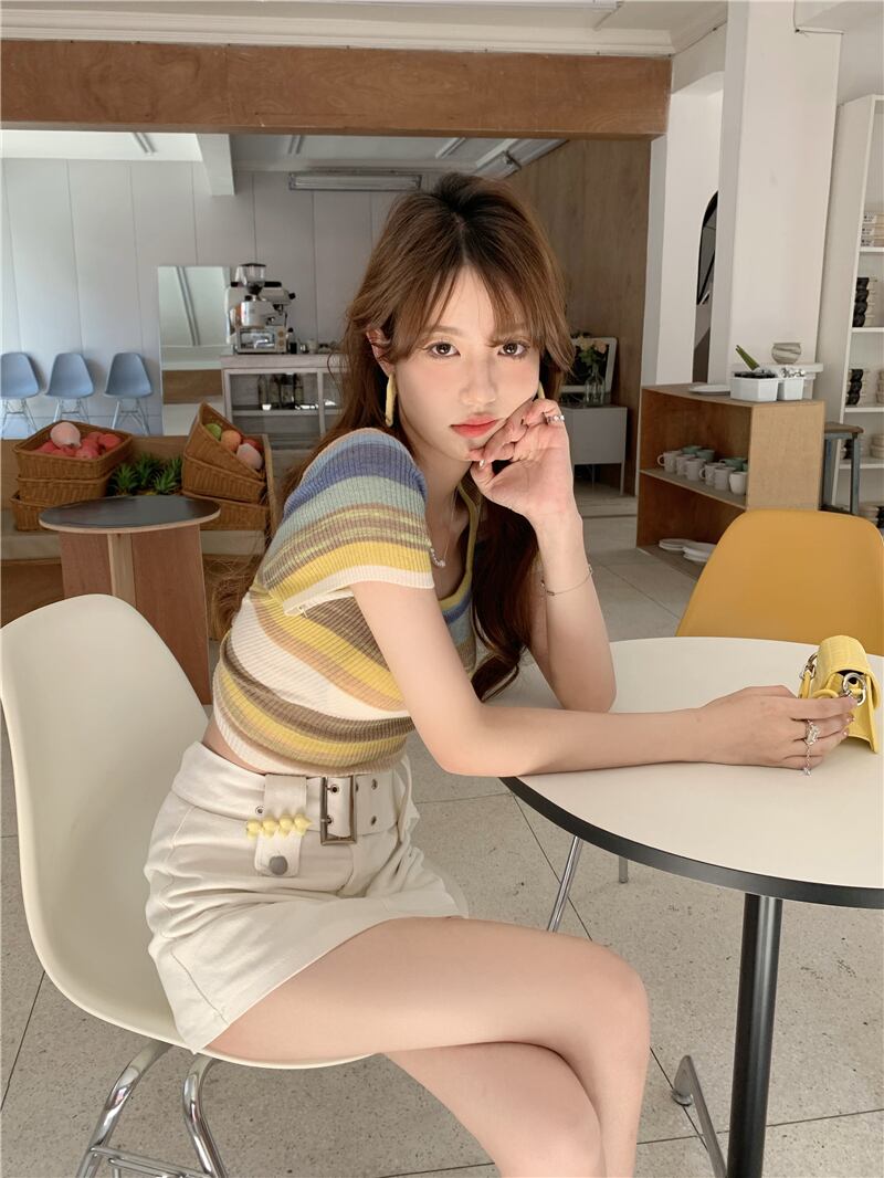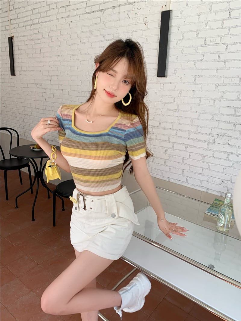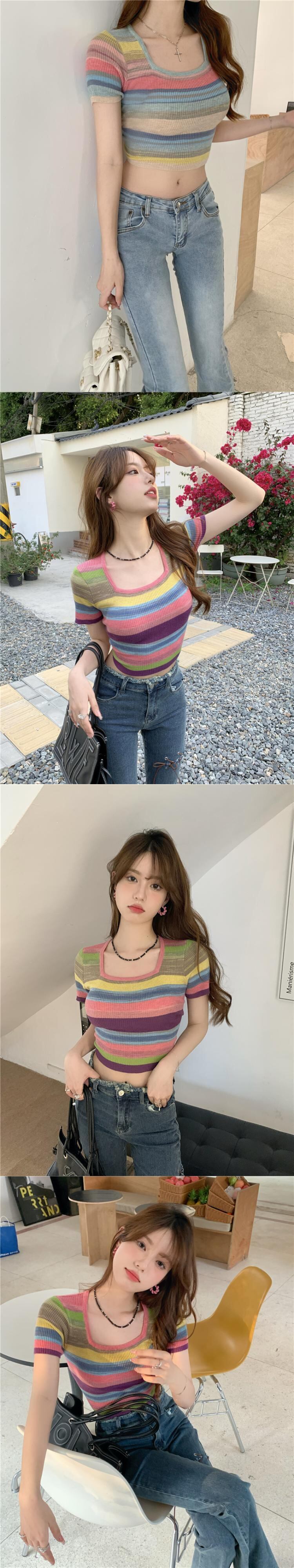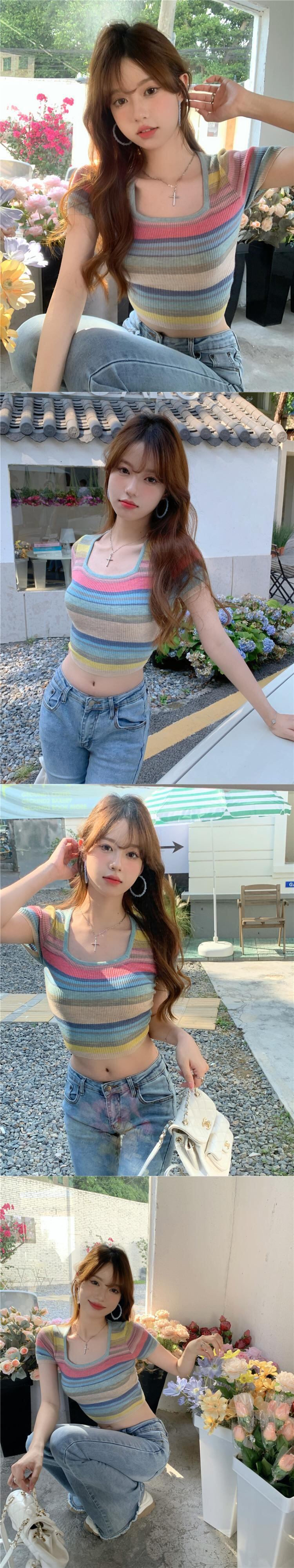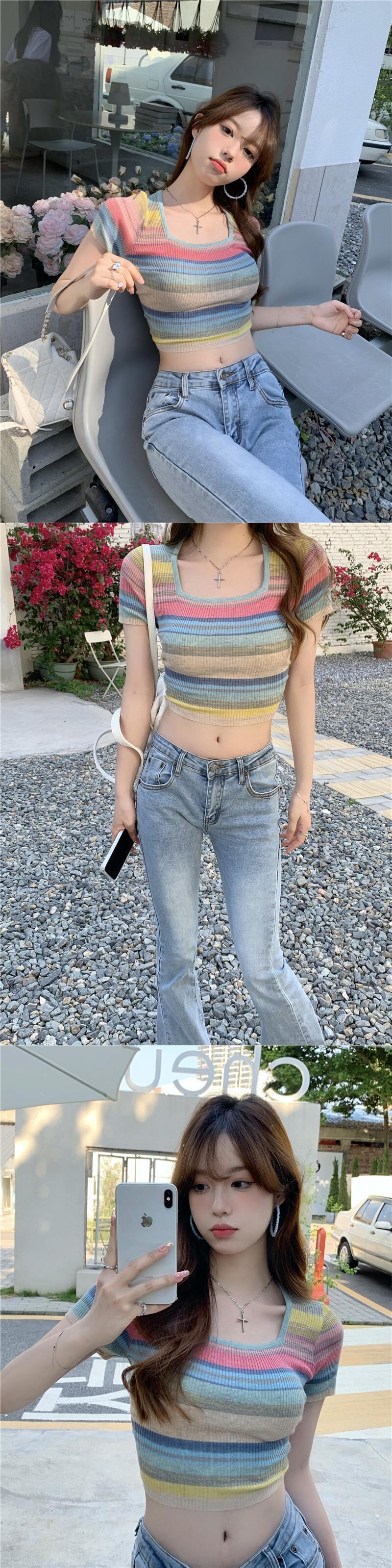アイスシルクニットストライプスクエアネック半袖Tシャツレディースデザインセンスニッチ夏純粋な欲望セクシーショートトップ サマー 夏物 ピュア スクウェア 7460098657540846 | framboise21