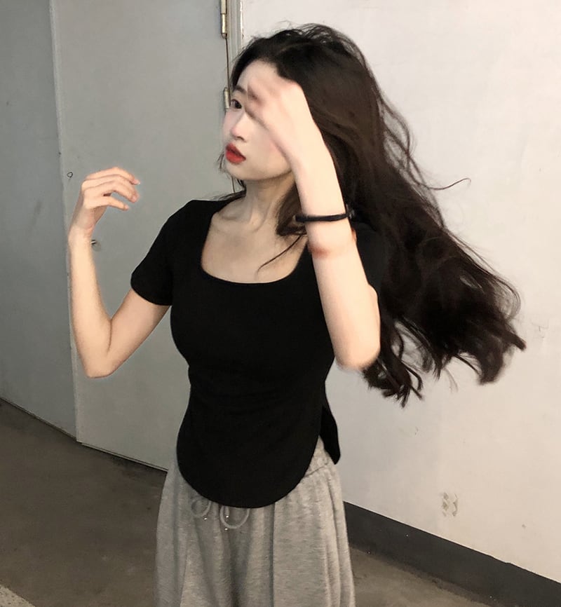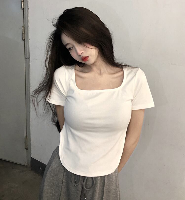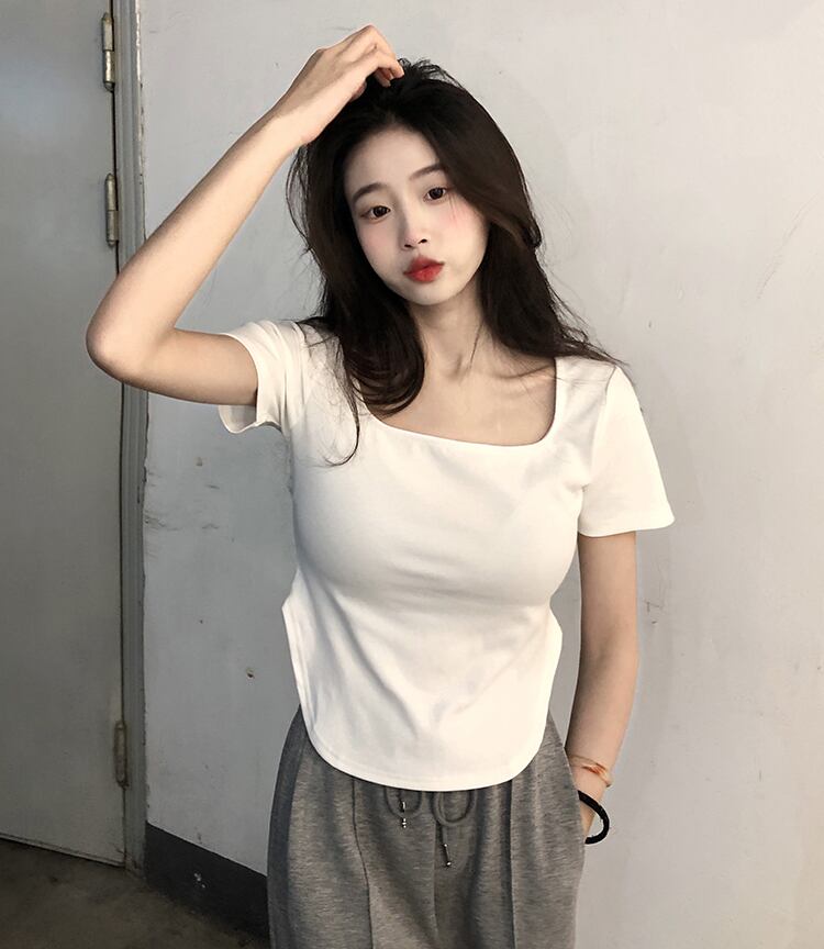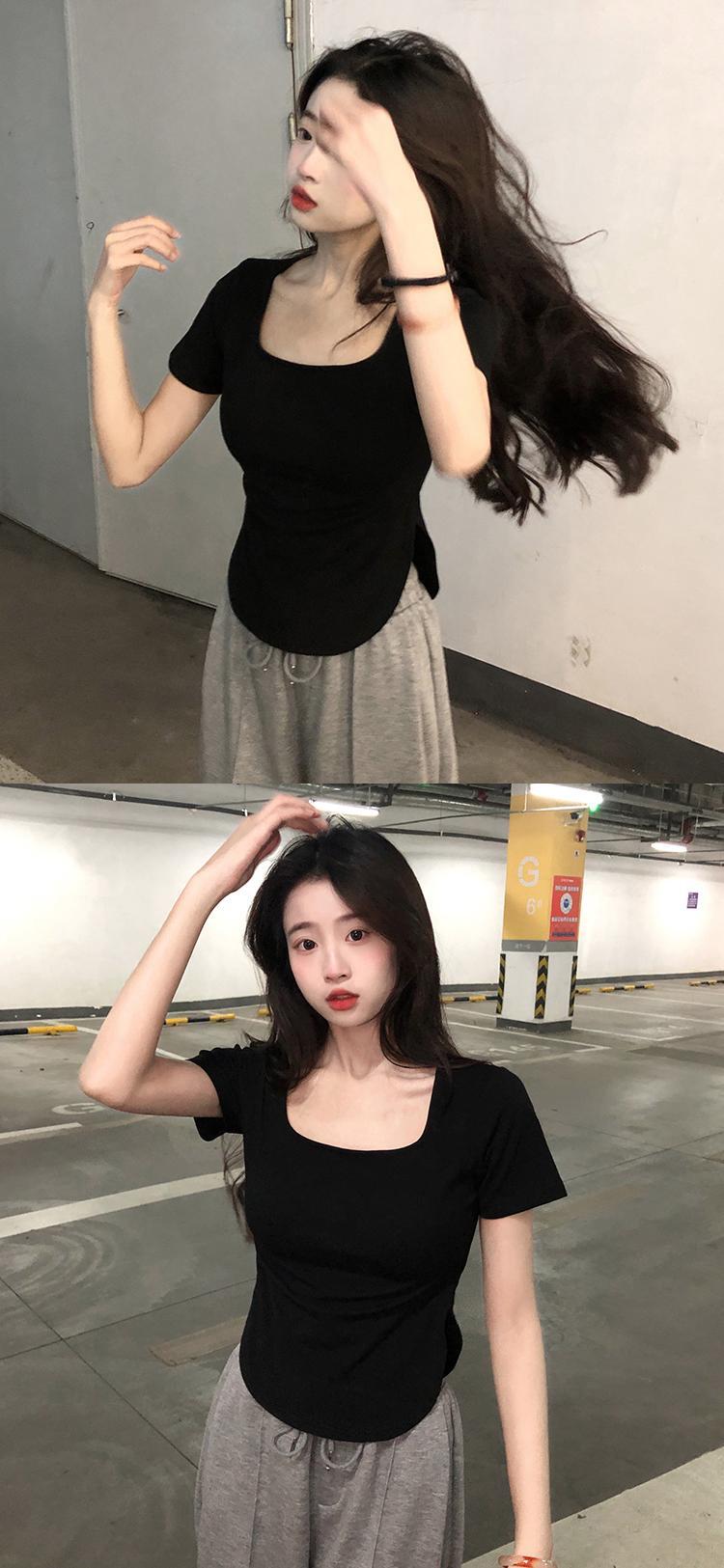 黒の肩の半袖Tシャツ女性XiaChunyuスタイルのスリムなスクエアカラーのボトミングシャツとショートトップTシャツ ブラック スクウェア 7460030158816160 | framboise21