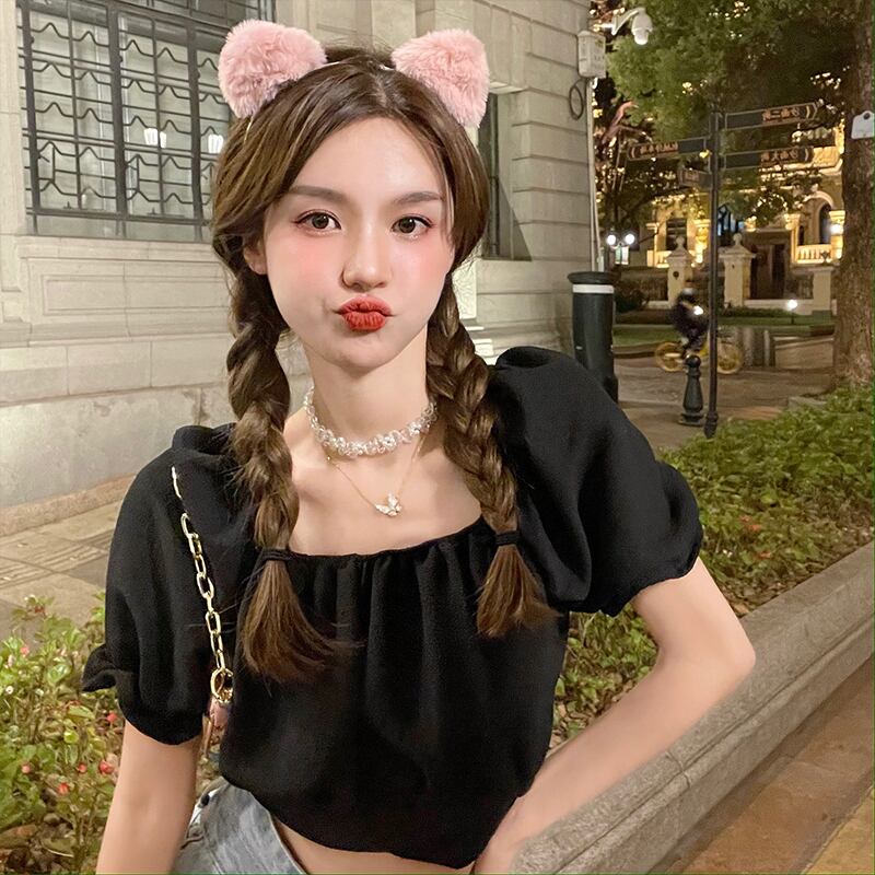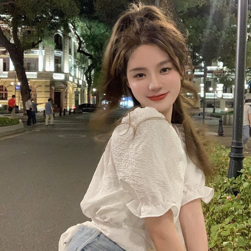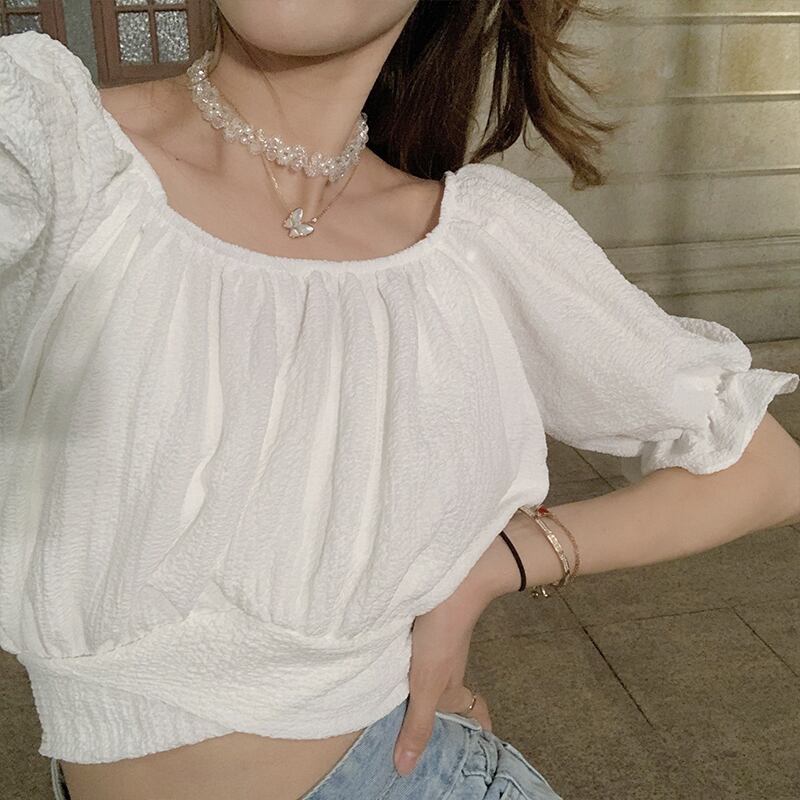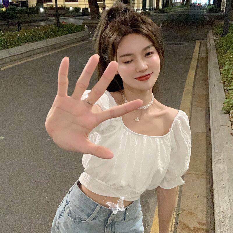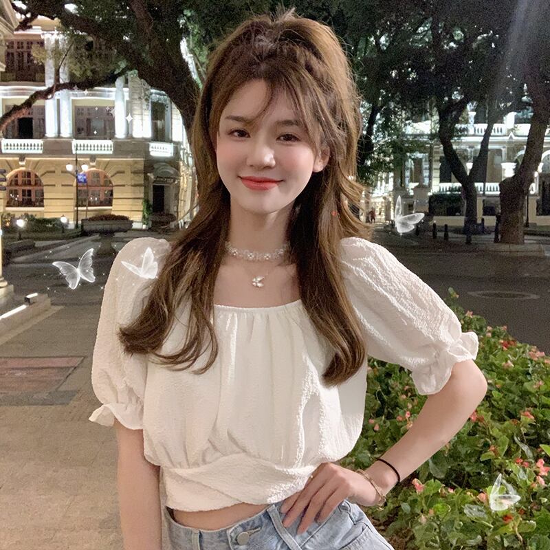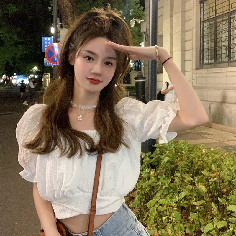 ニッチなハイウエストショートトップスパフスリーブフレンチシックな女性の夏の半袖の新しい甘いデザインのシャツ ハイウェスト 大人ガーリー スウィート キュート カジュアル サマー 夏物 7460049621945663 | framboise21