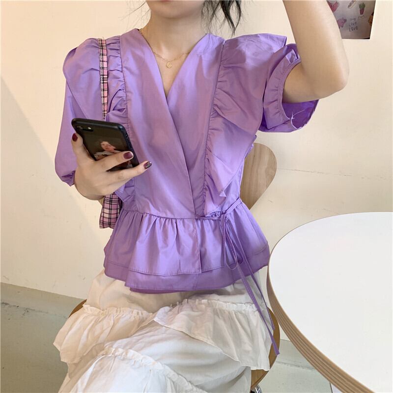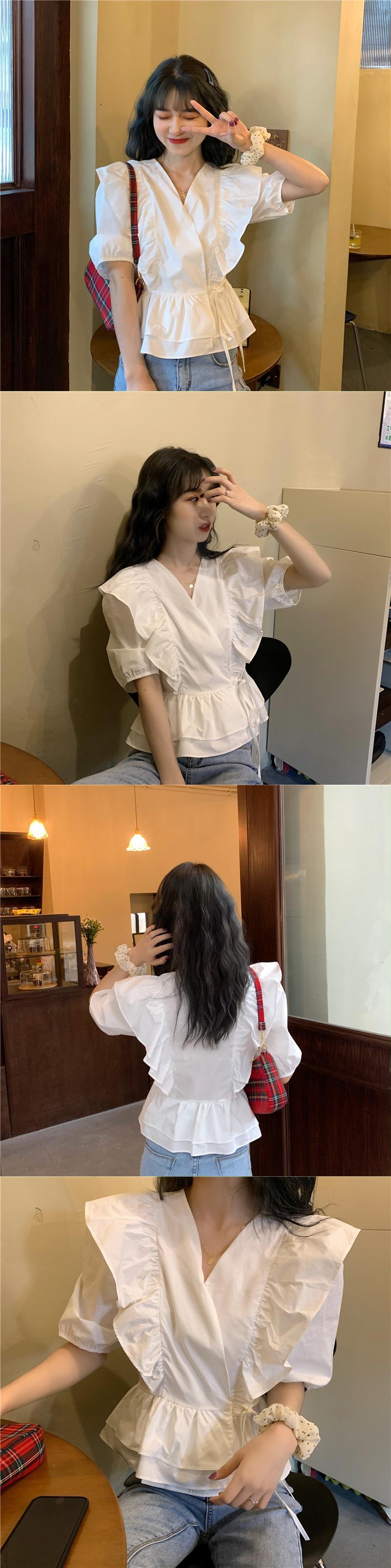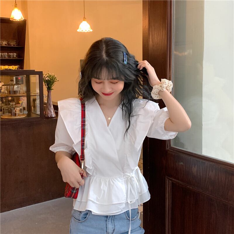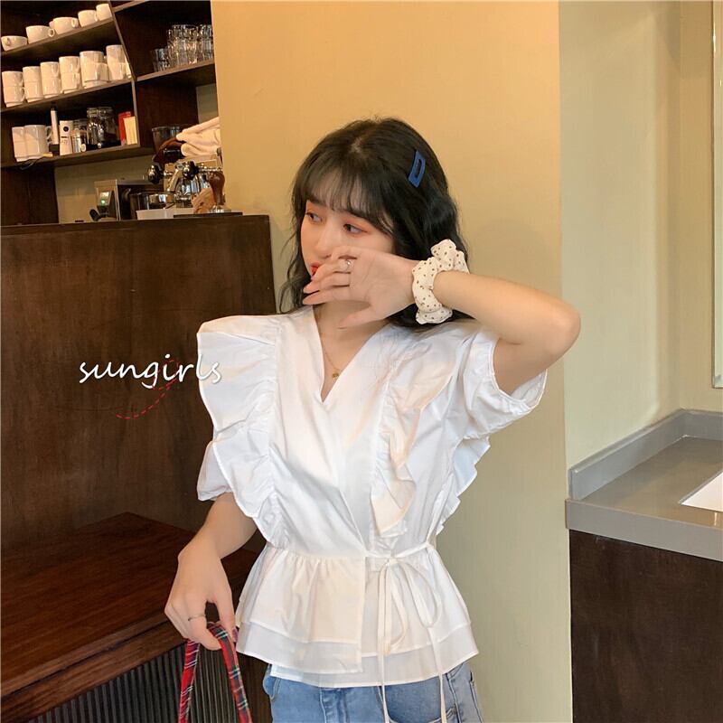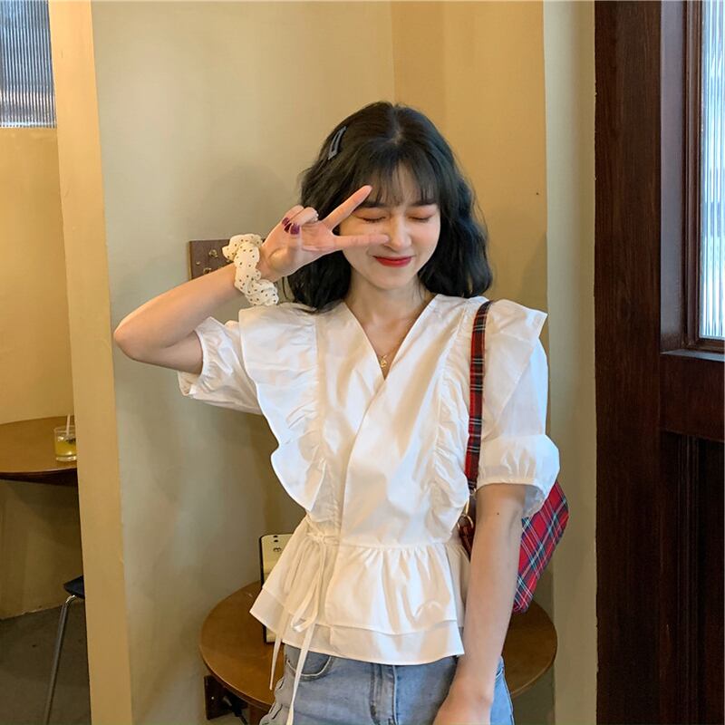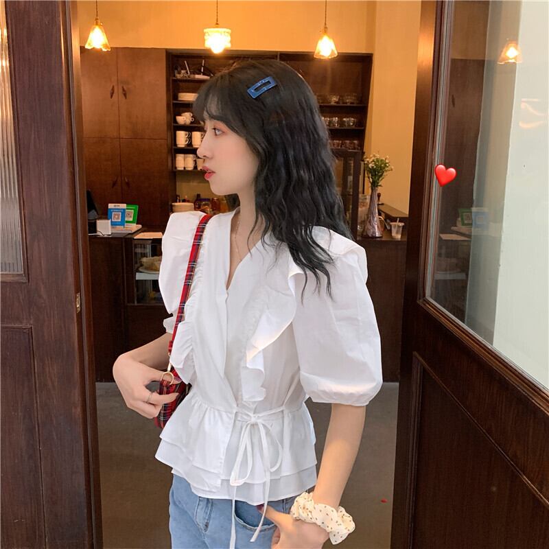 夏の甘い半袖フレンチシックパフスリーブトップホワイトウエストホワイトシャツレディースシフォンデザイン薄片 大人ガーリー スウィート キュート カジュアル サマー 夏物 7460062984565771 | framboise21