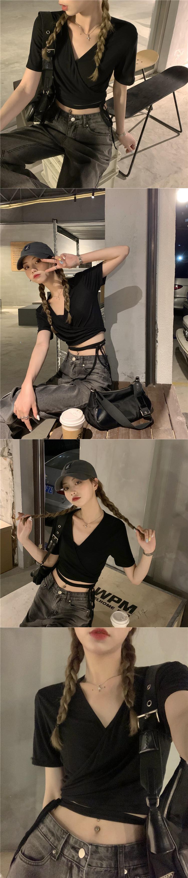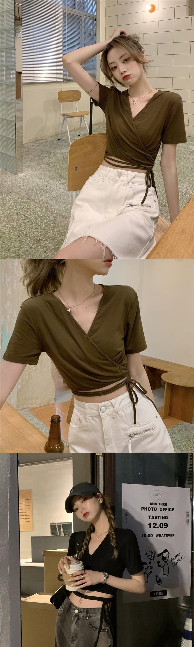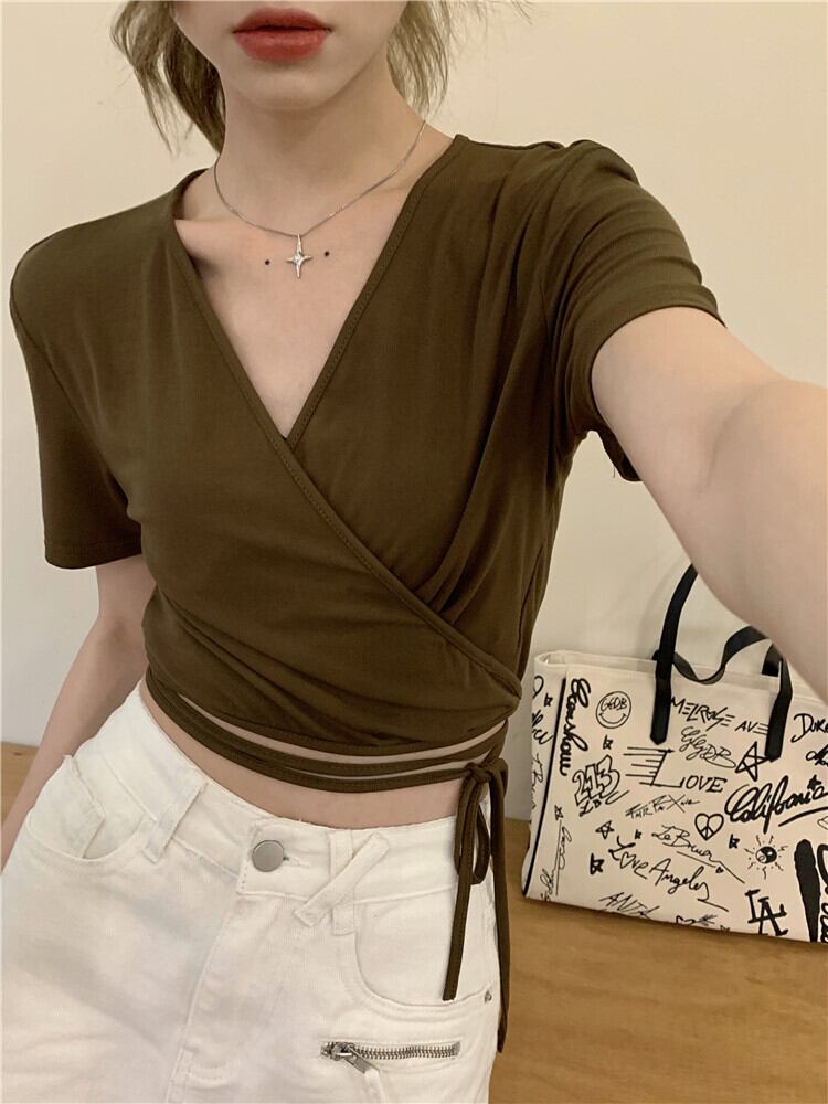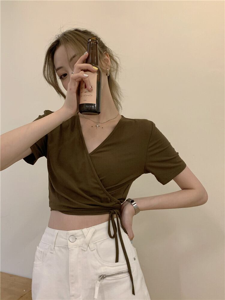 セクシーなVネックストラップは、軽い親しみやすさの感覚をデザインします夏の半袖Tシャツシックなトップ女性の2022年バージョンのショートトレンド サマー 夏物 7460016653518934 | framboise21