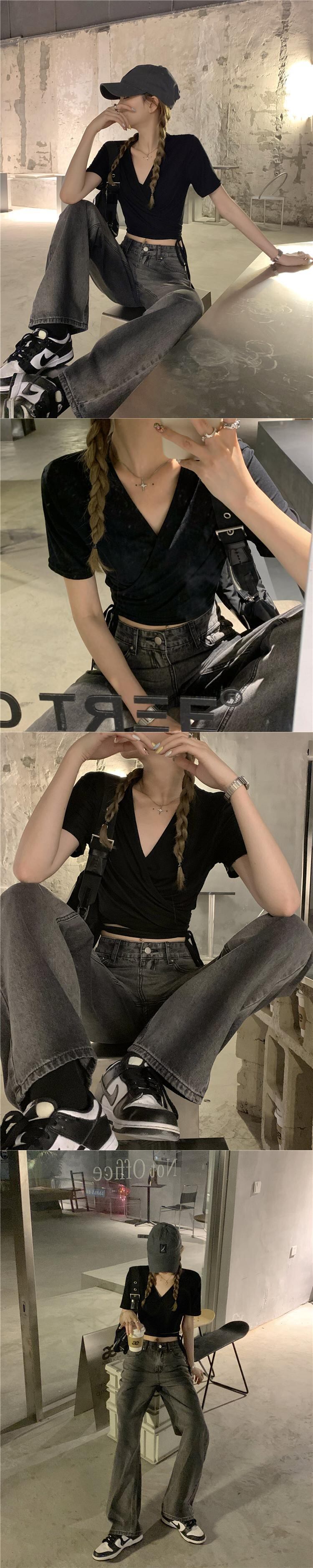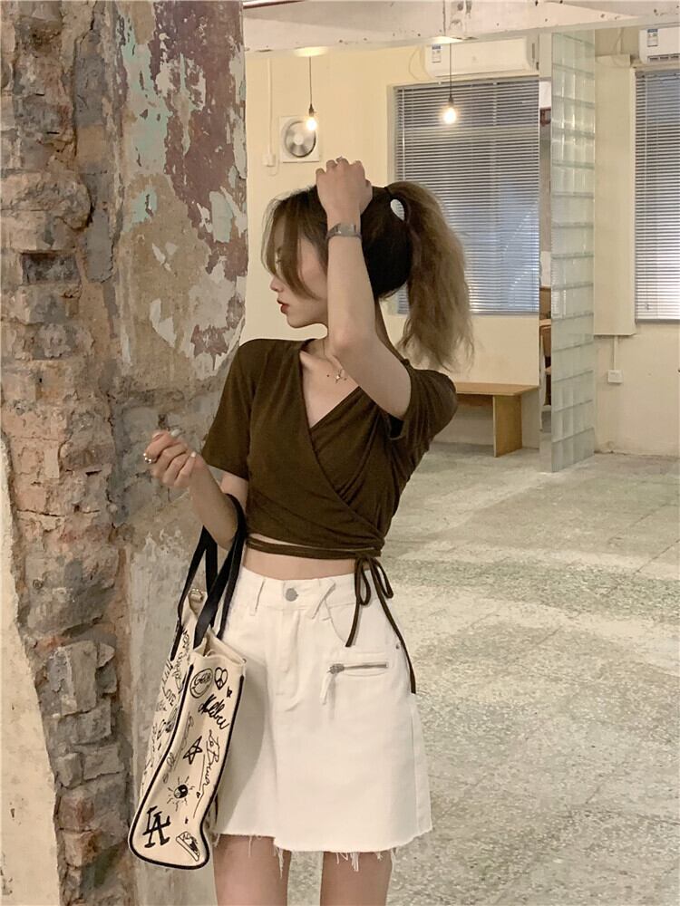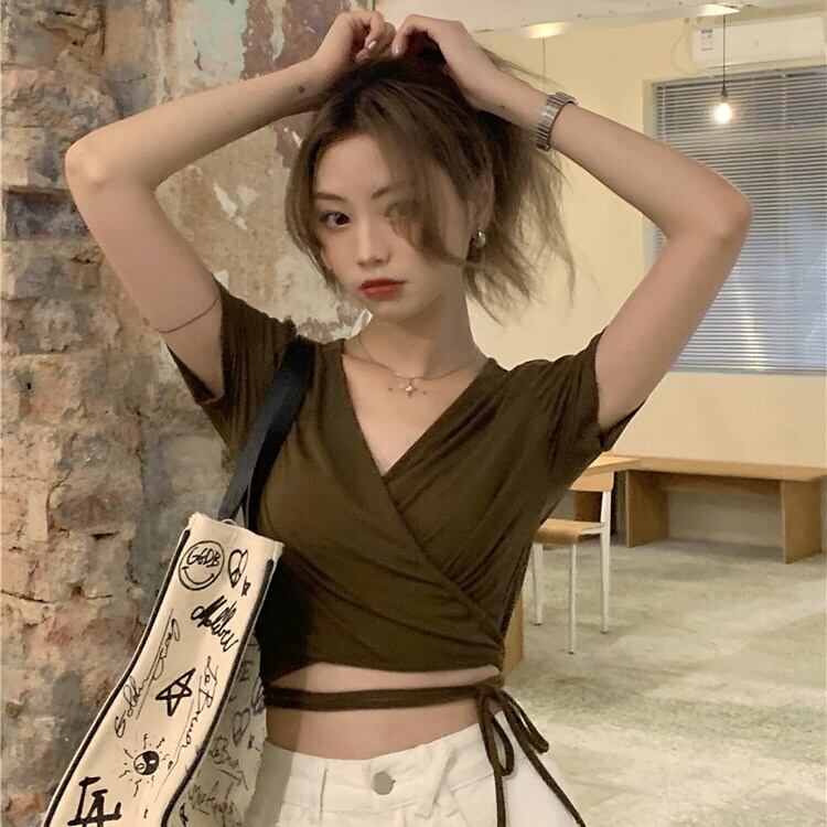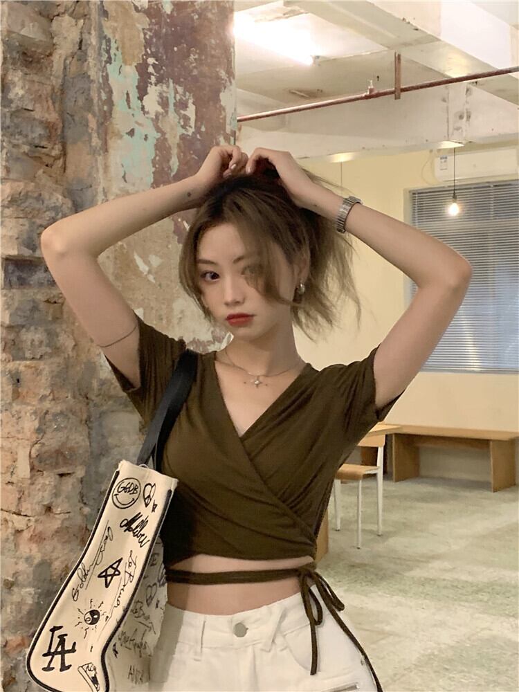 セクシーなVネックストラップは、軽い親しみやすさの感覚をデザインします夏の半袖Tシャツシックなトップ女性の2022年バージョンのショートトレンド サマー 夏物 7460016653518934 | framboise21