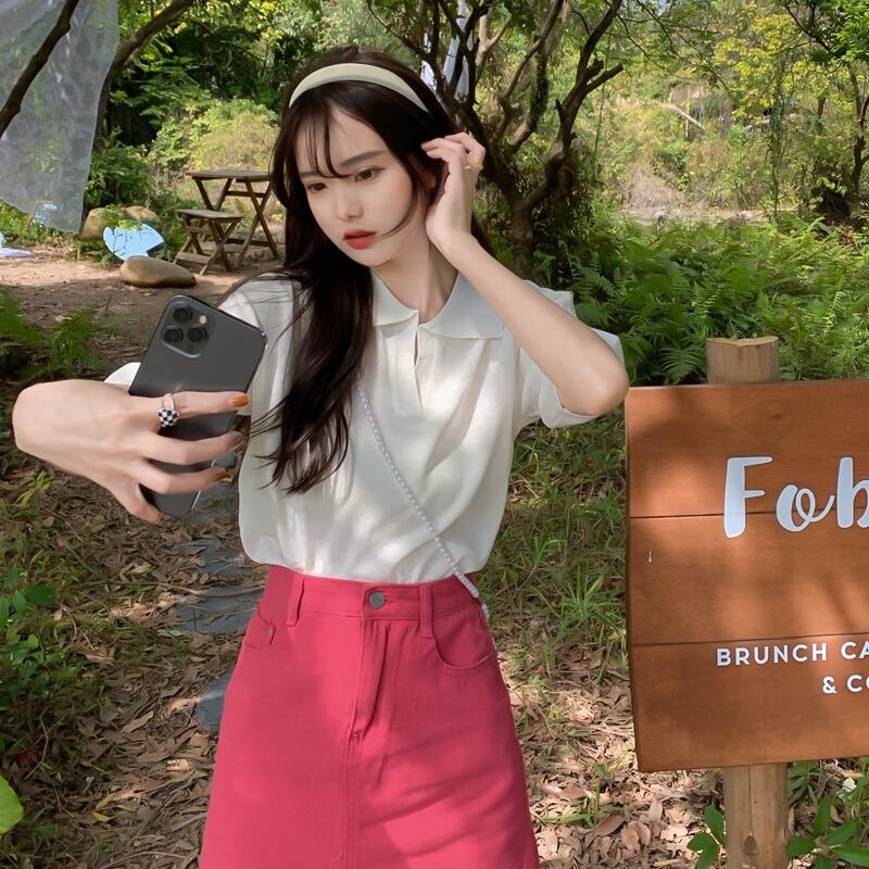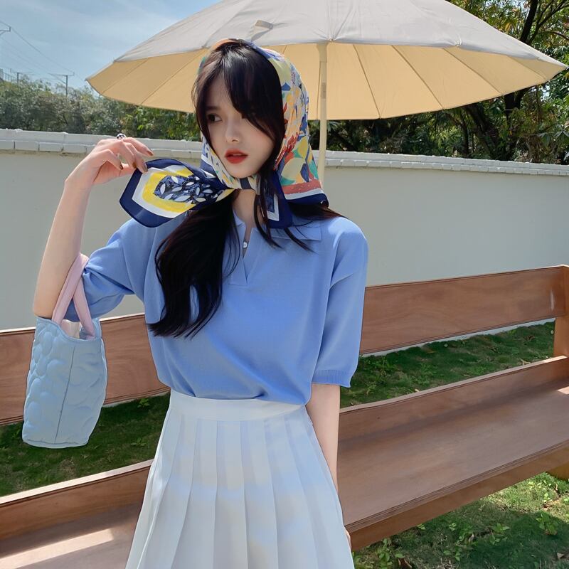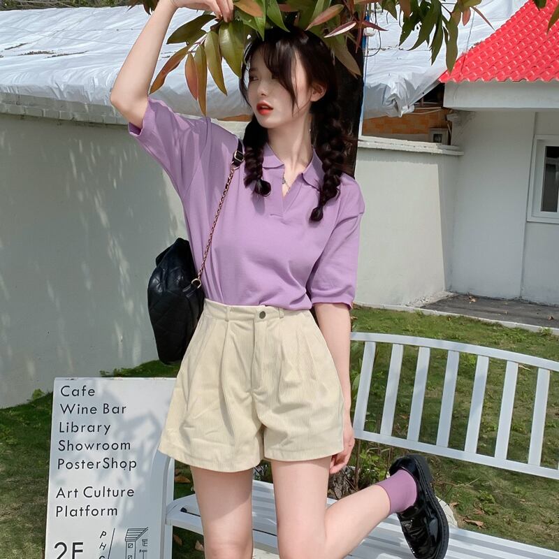 パープルポロカラーアイスシルクニットセーター半袖フロントショルダーTシャツ女性の2022年夏の新しいシックでユニークなトップ サマー 夏物 7460020039351731 | framboise21