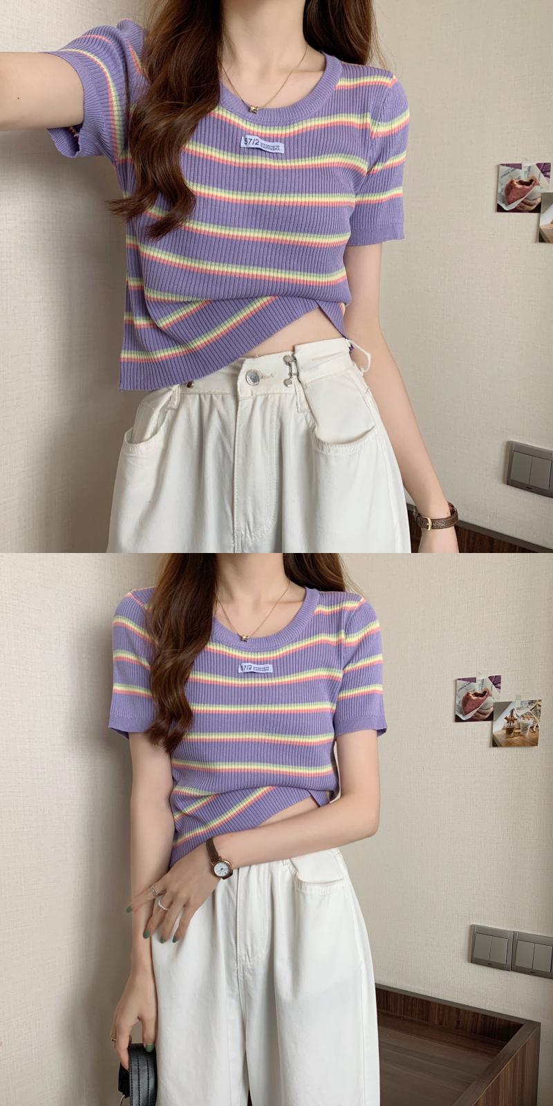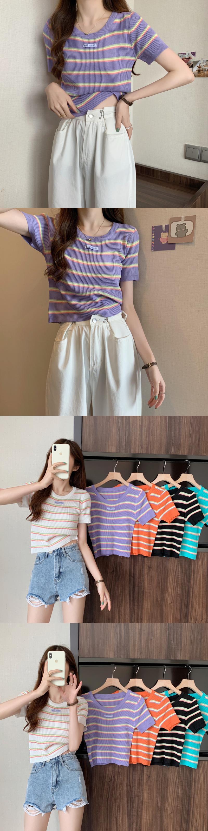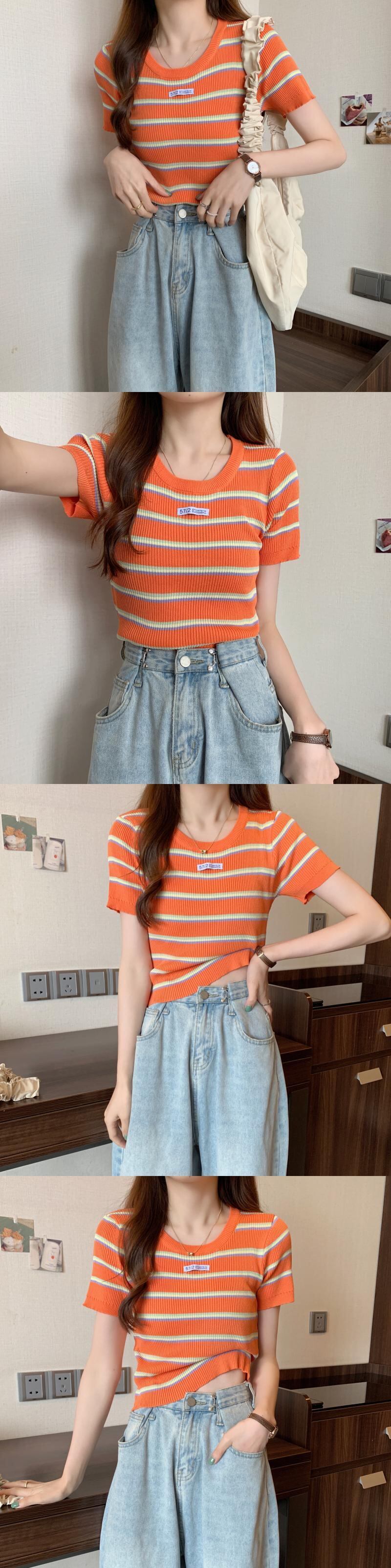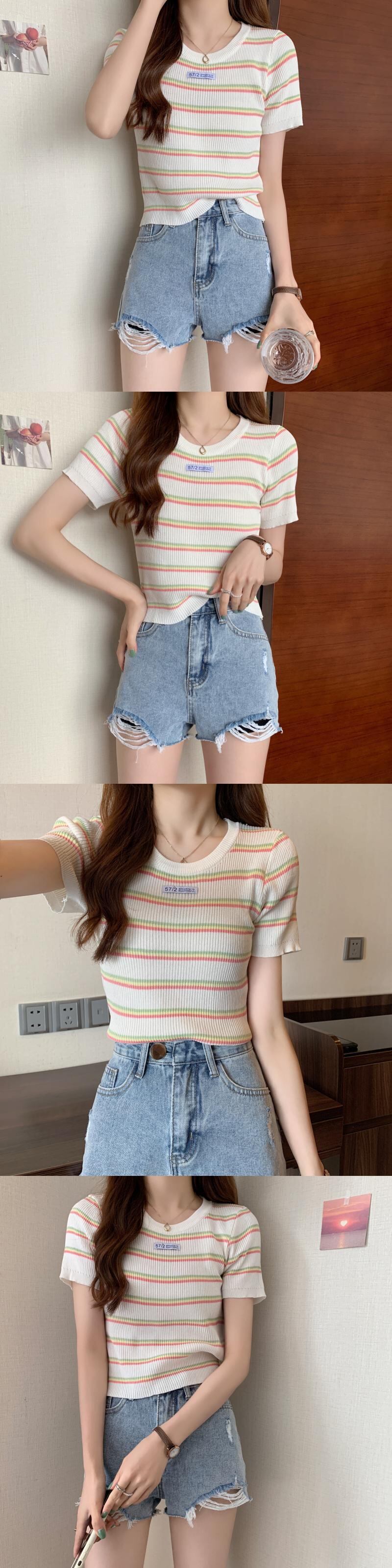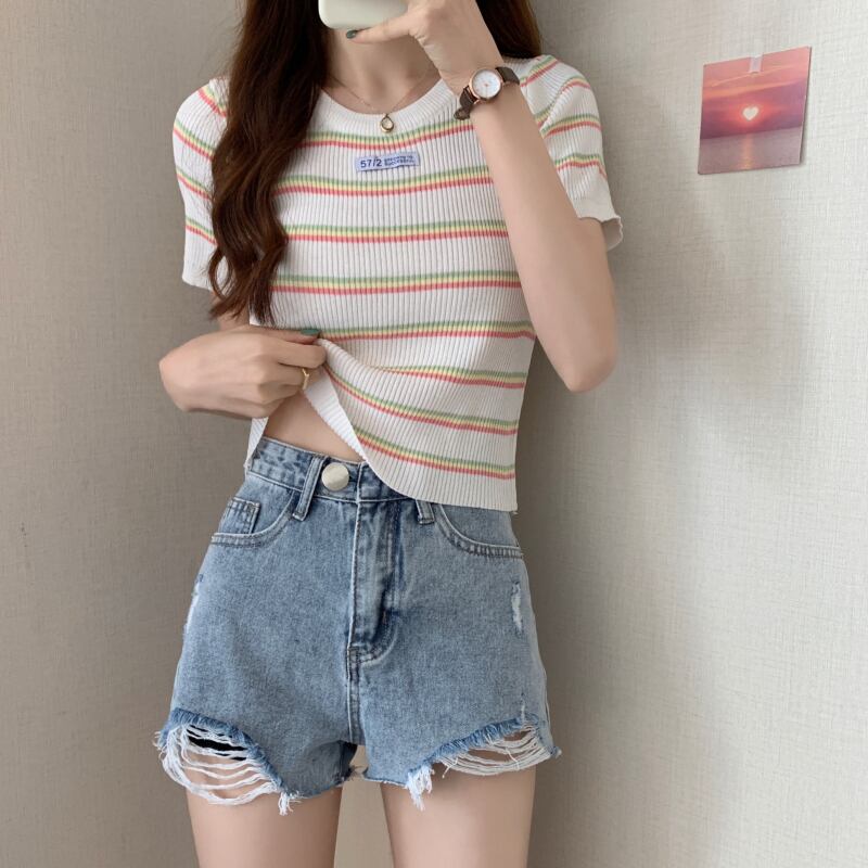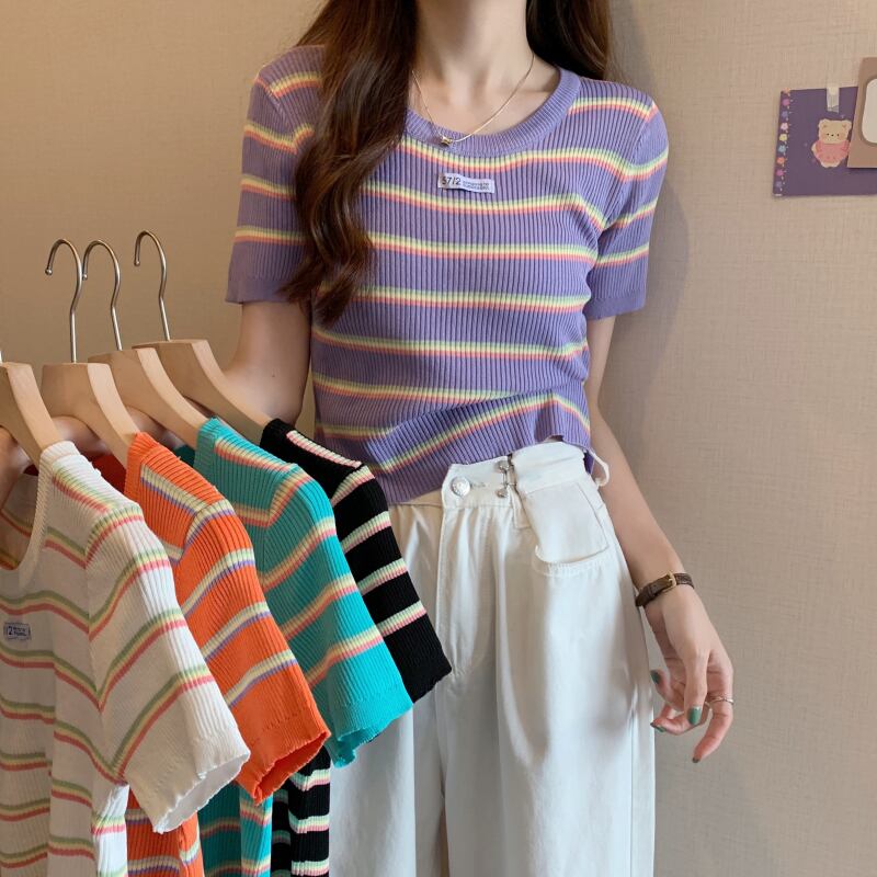 夏の女性のネットレッドのデザインセンスオールマッチ半袖ニッチストライプラウンドネックショートTシャツハイウエストニットトップトレンディなイン サマー 夏物 Oネック 7460067683176353 | framboise21