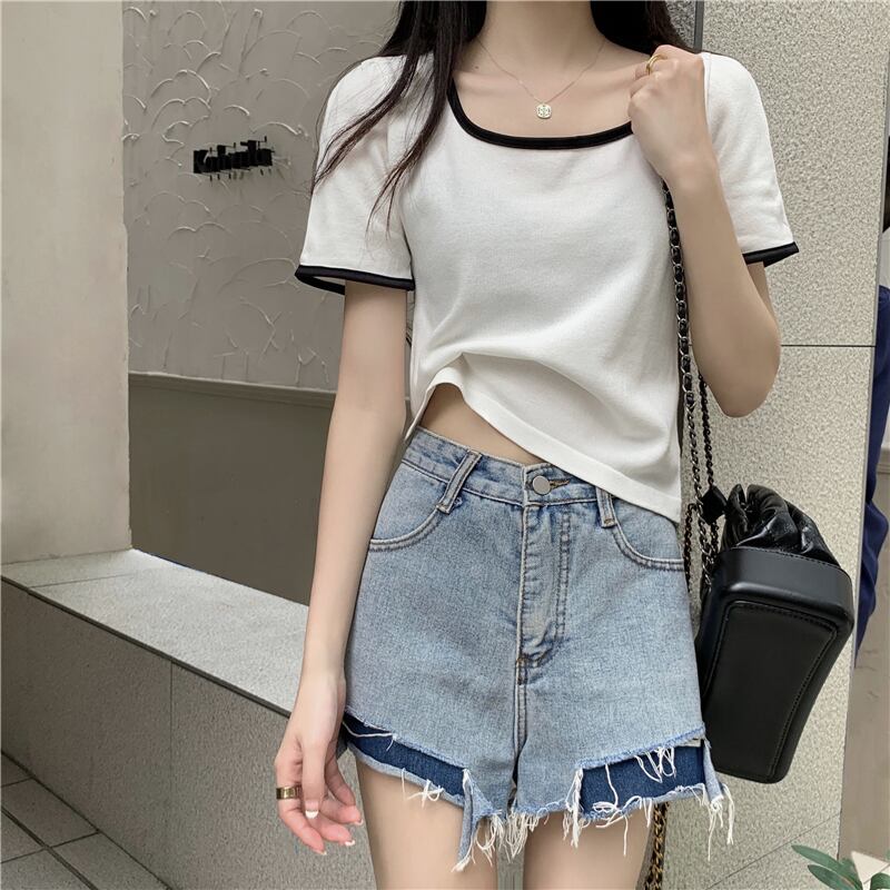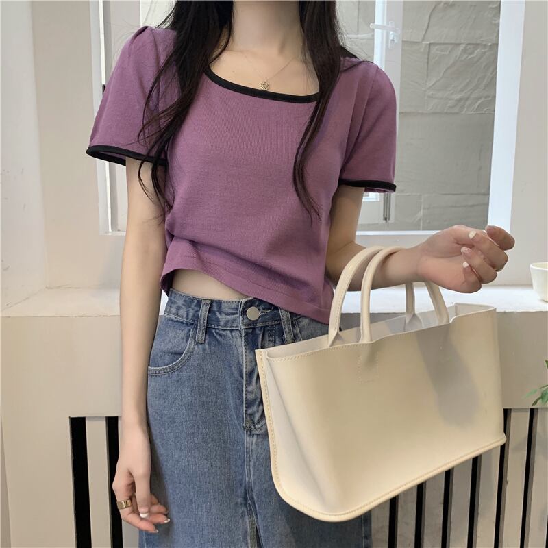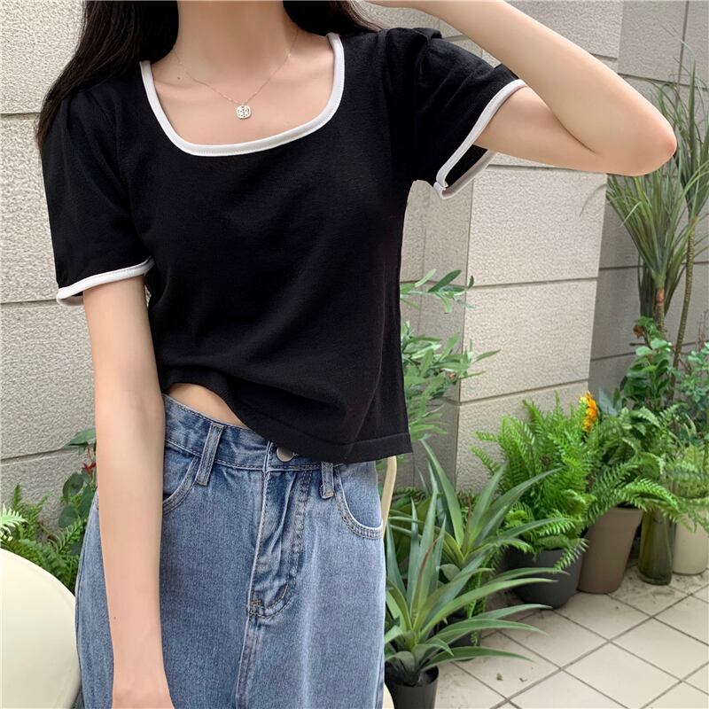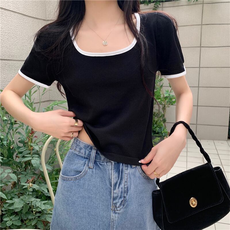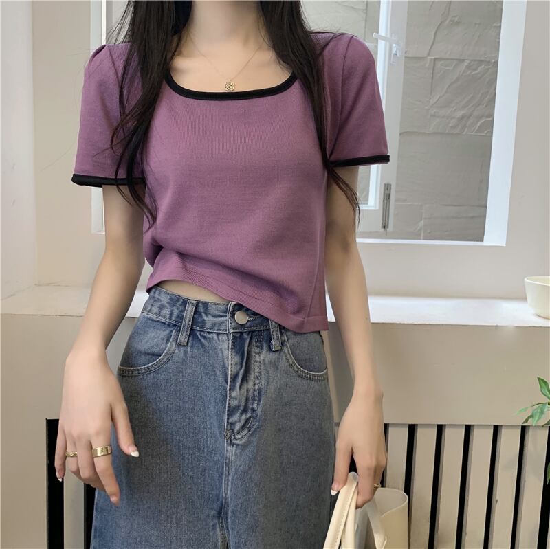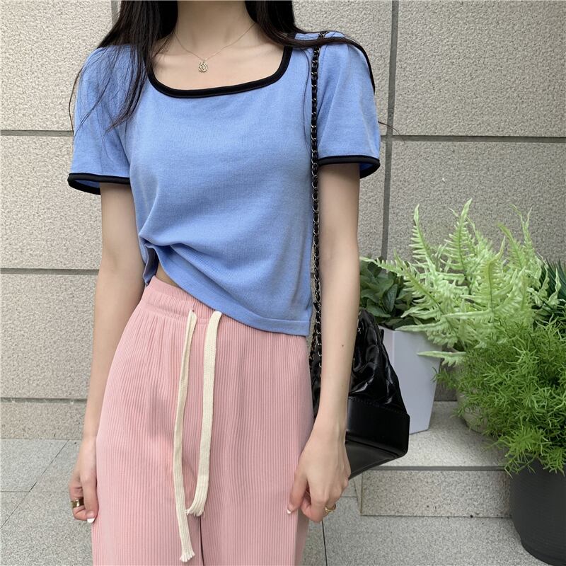 ウエストショートトップレディース夏2022年新作デザインニッチニット薄手のアイスシルクスクエアネック半袖Tシャツ サマー 夏物 スクウェア 7460057152734298 | framboise21