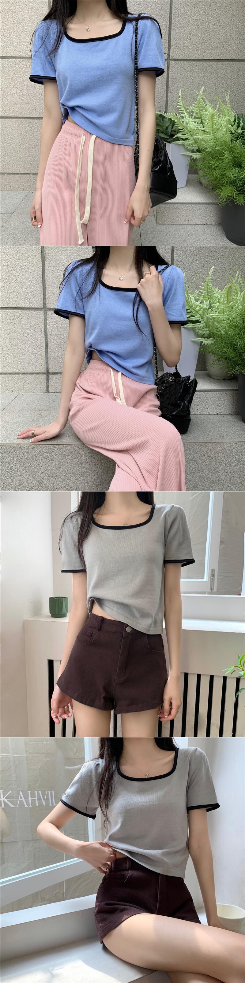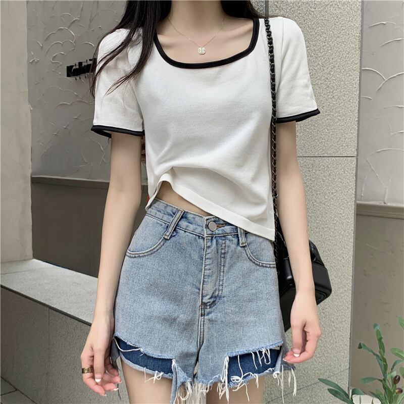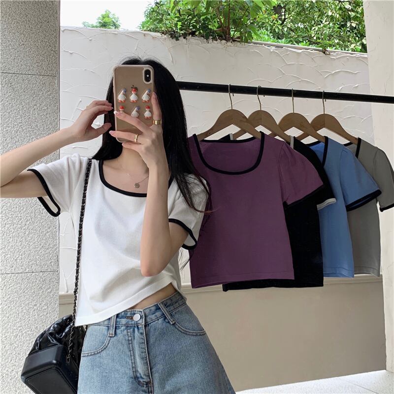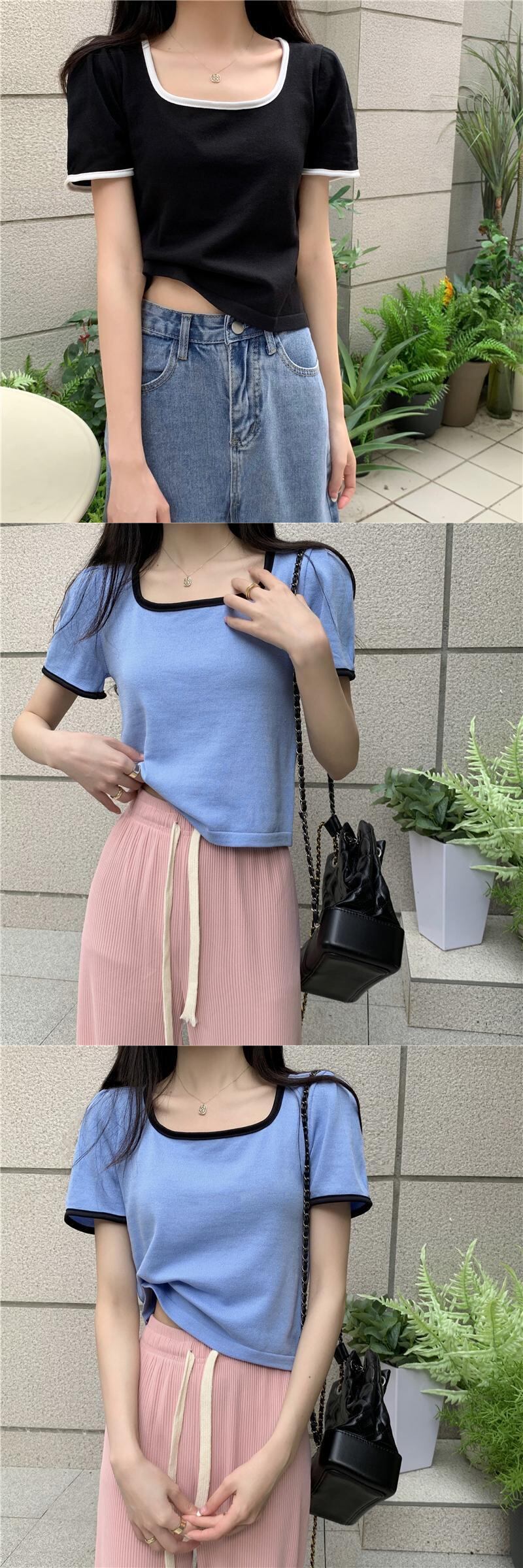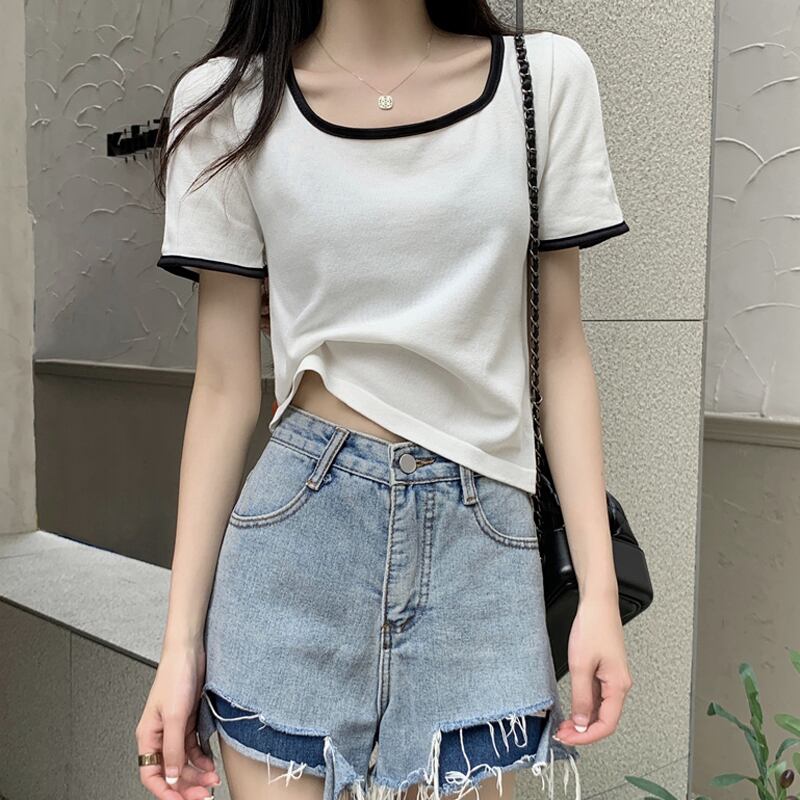 ウエストショートトップレディース夏2022年新作デザインニッチニット薄手のアイスシルクスクエアネック半袖Tシャツ サマー 夏物 スクウェア 7460057152734298 | framboise21