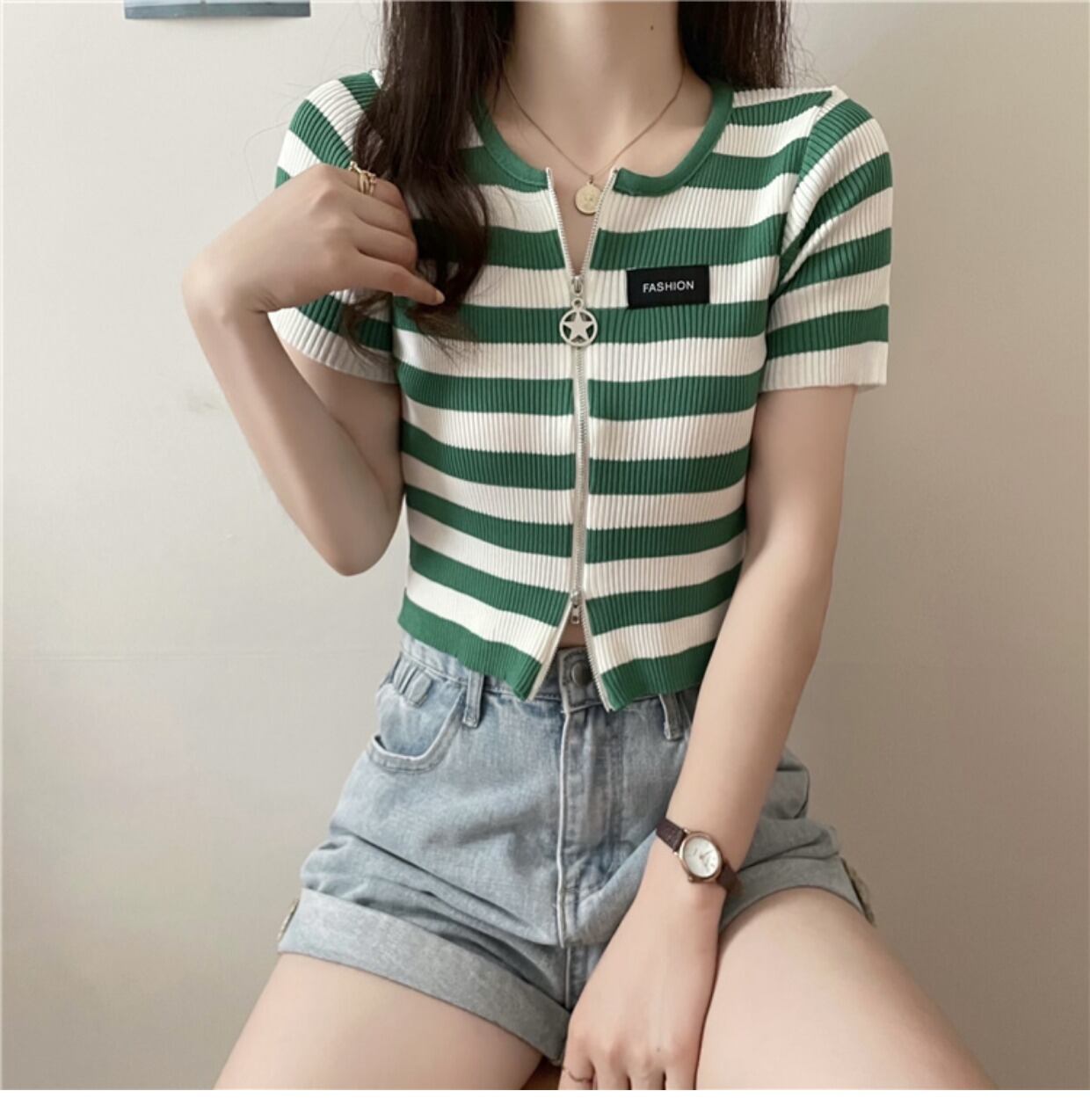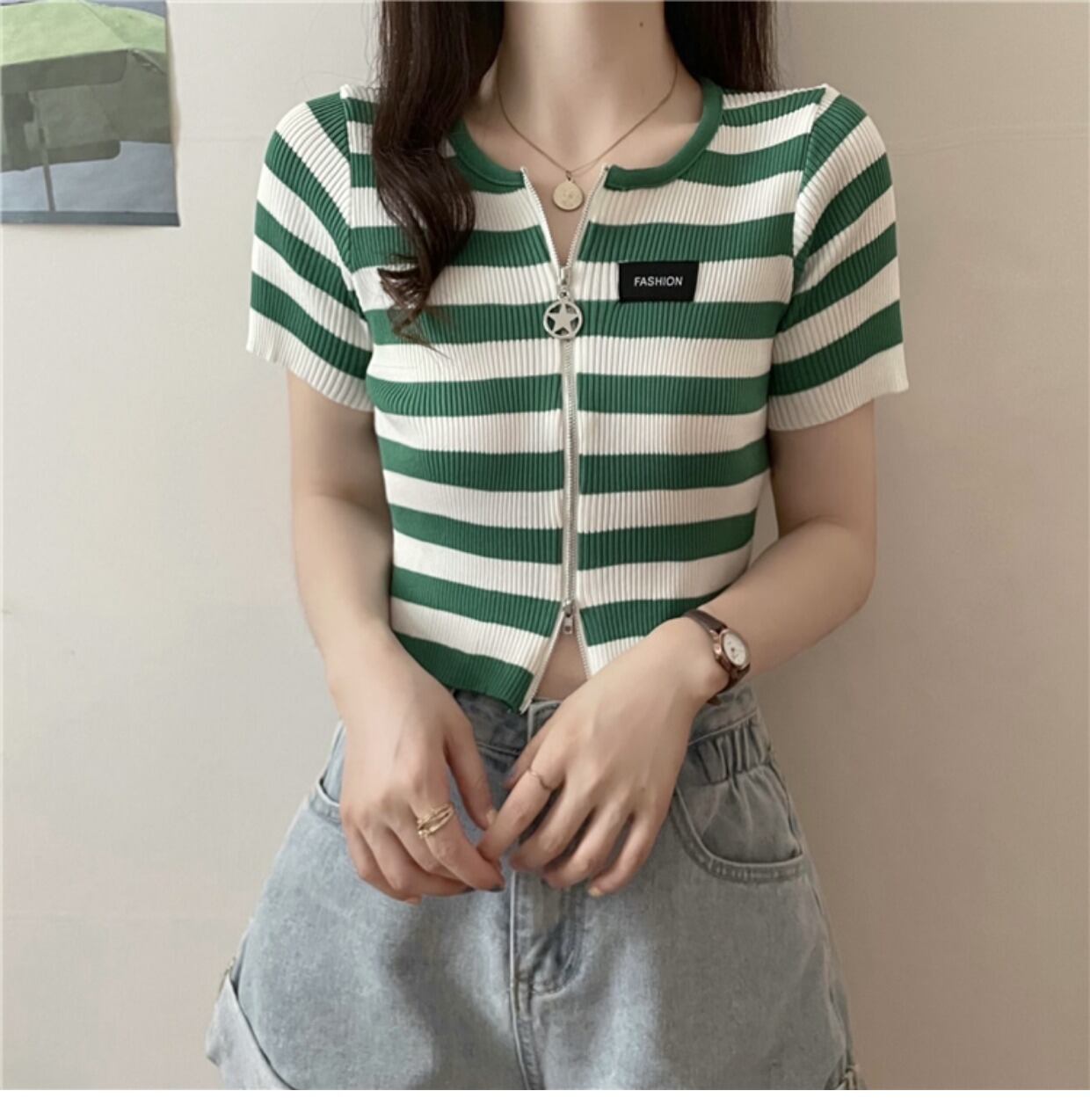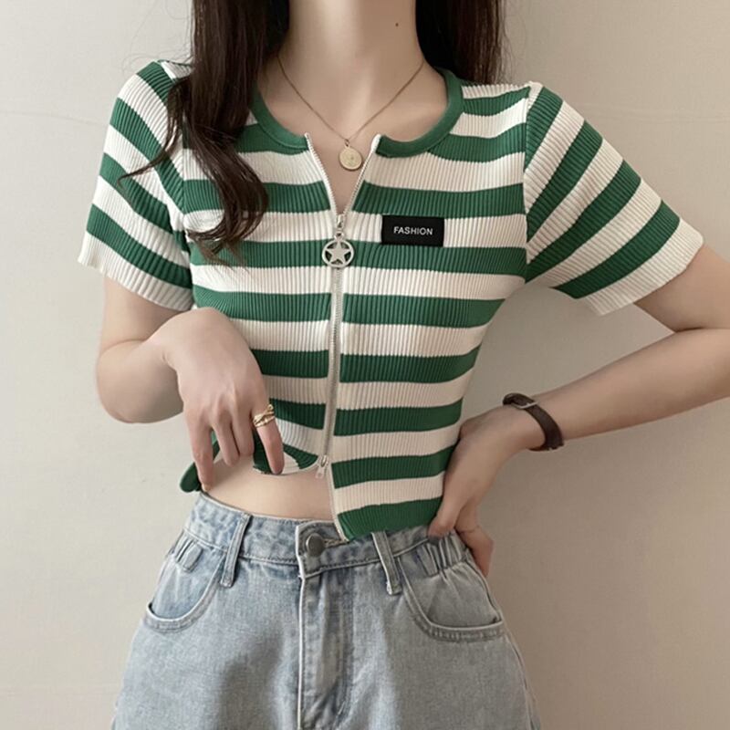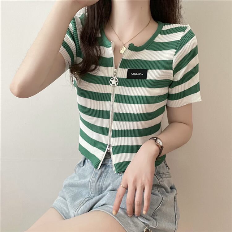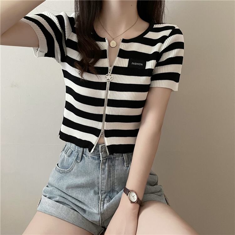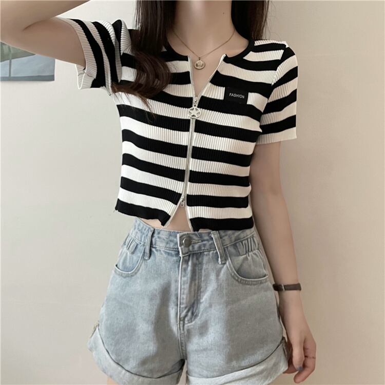 ダブルジップストライプフロントショルダーTシャツレディーススリム半袖ショートアイスシルクニットカーディガンサマーショートトップインタイド ハーフスリーブ 夏物 7460036066342922 | framboise21