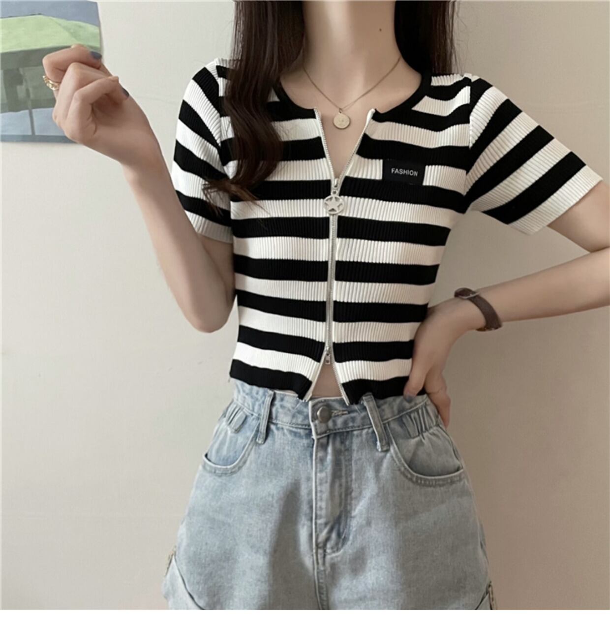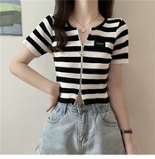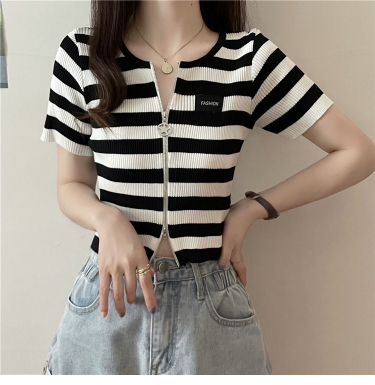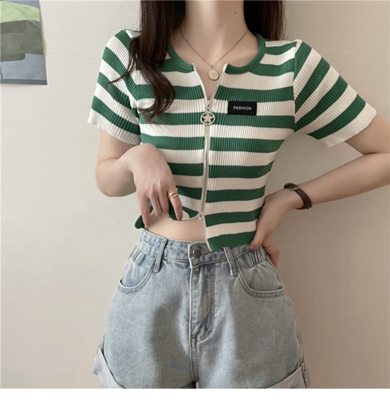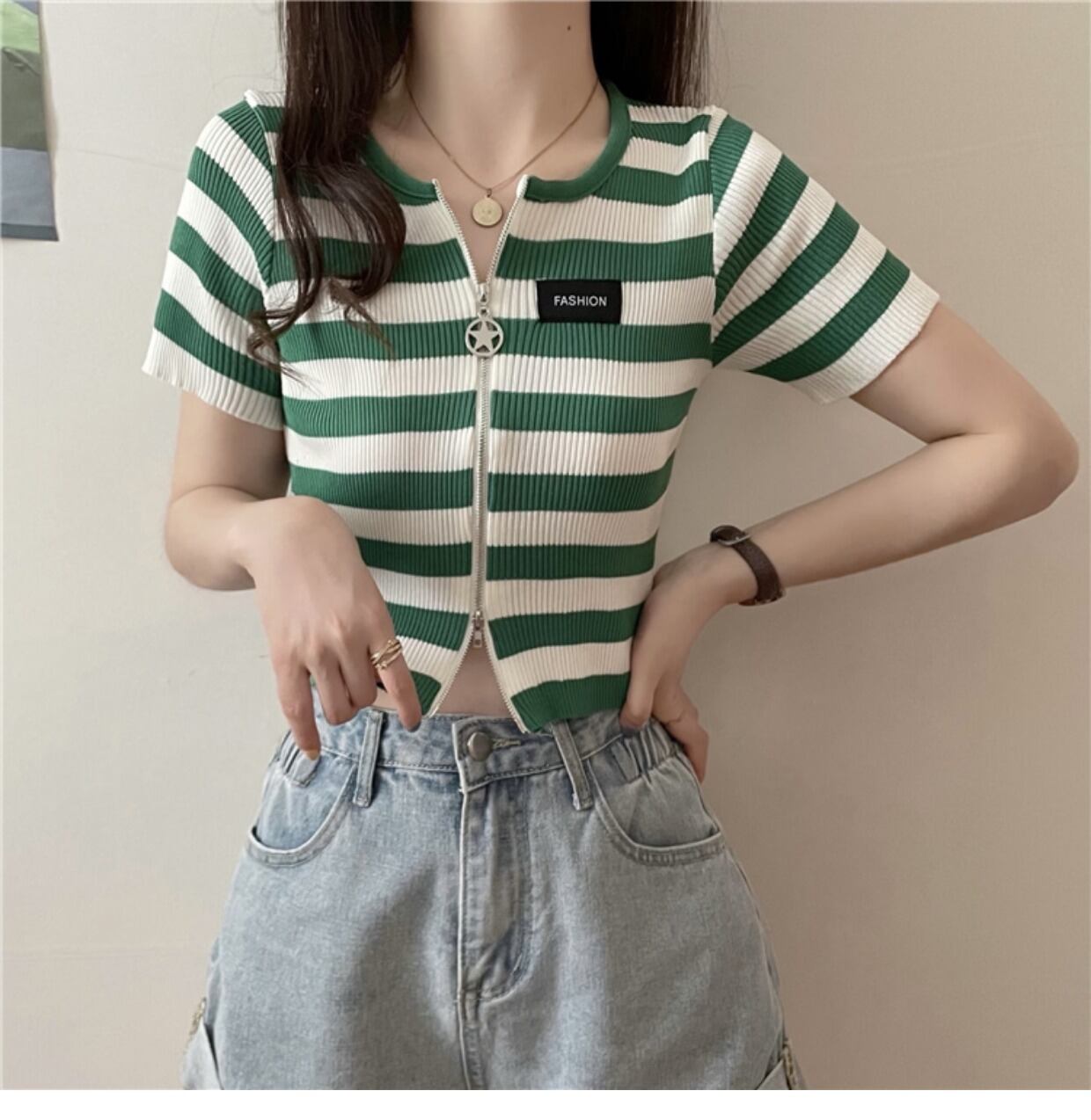 ダブルジップストライプフロントショルダーTシャツレディーススリム半袖ショートアイスシルクニットカーディガンサマーショートトップインタイド ハーフスリーブ 夏物 7460036066342922 | framboise21