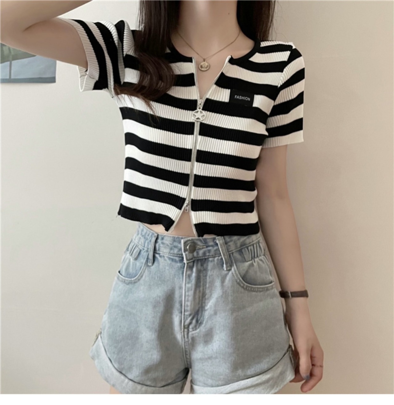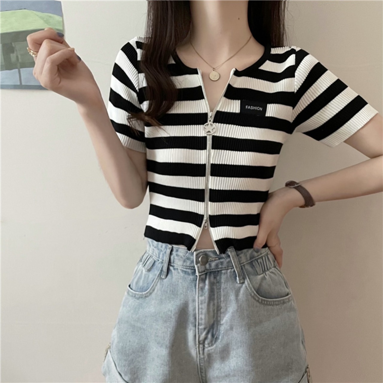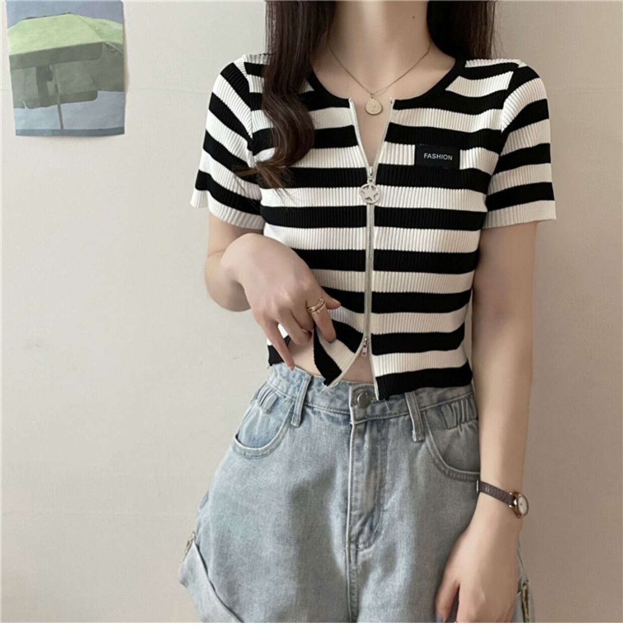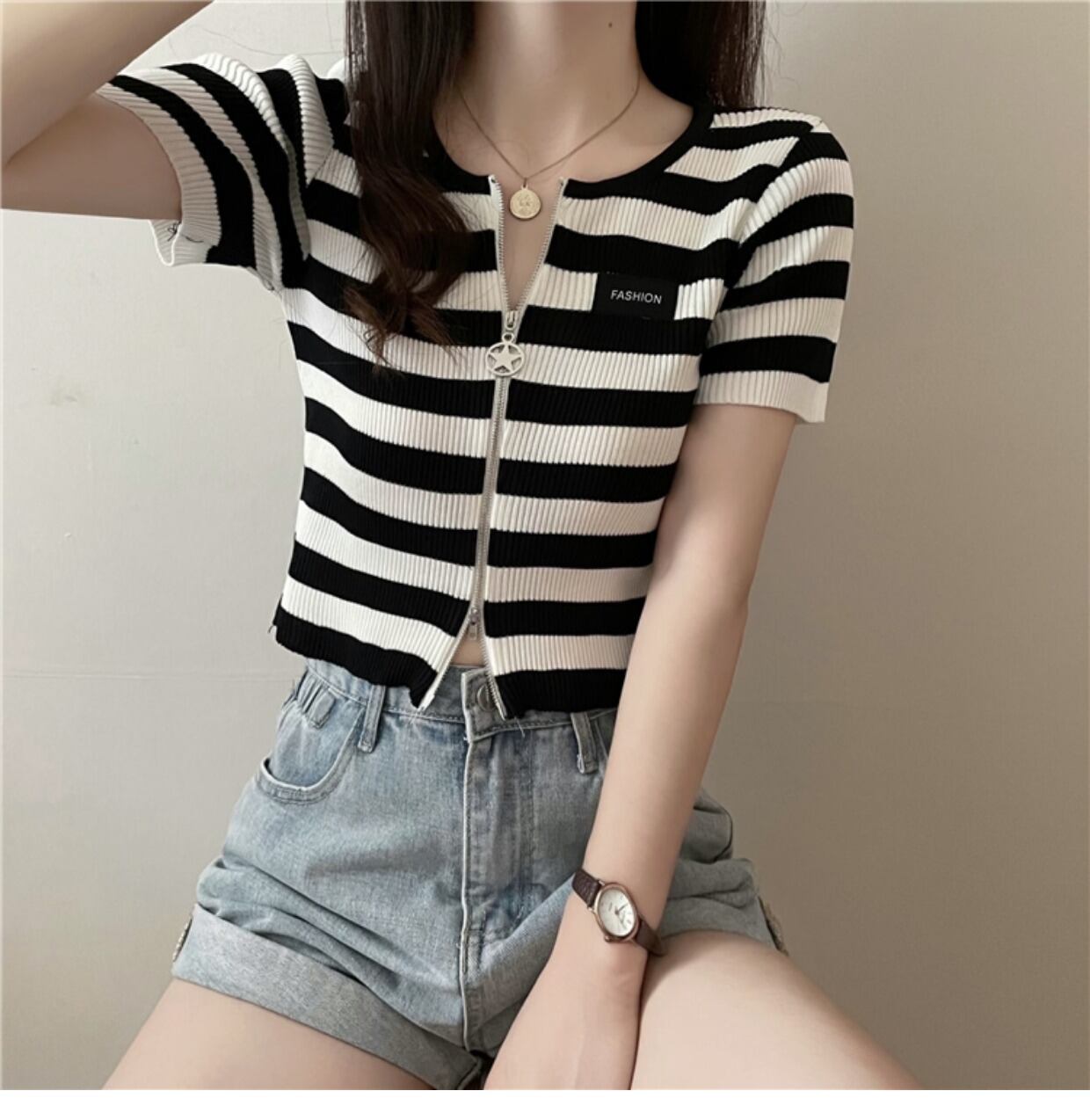 ダブルジップストライプフロントショルダーTシャツレディーススリム半袖ショートアイスシルクニットカーディガンサマーショートトップインタイド ハーフスリーブ 夏物 7460036066342922 | framboise21