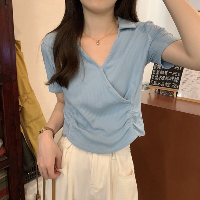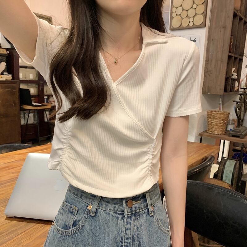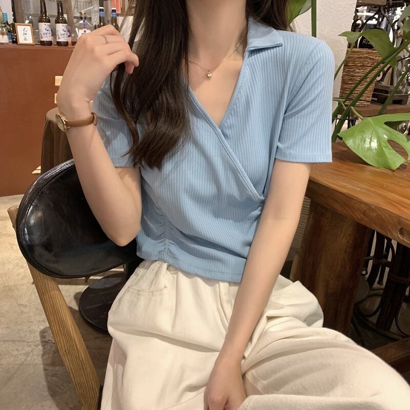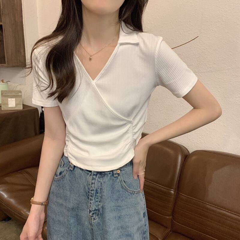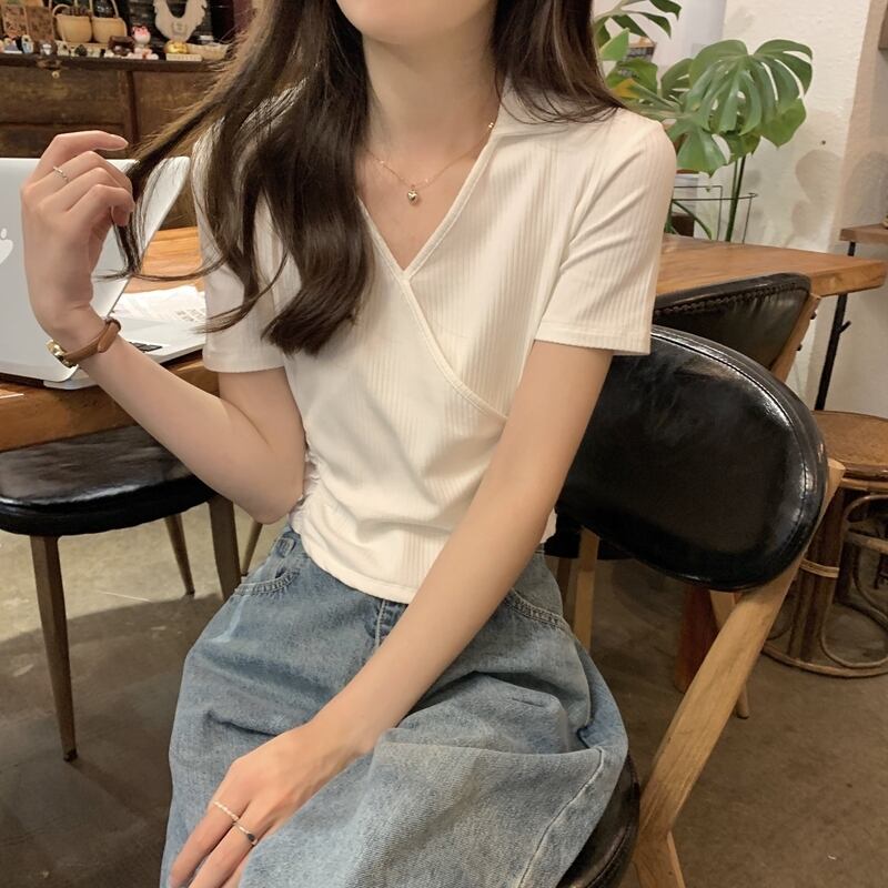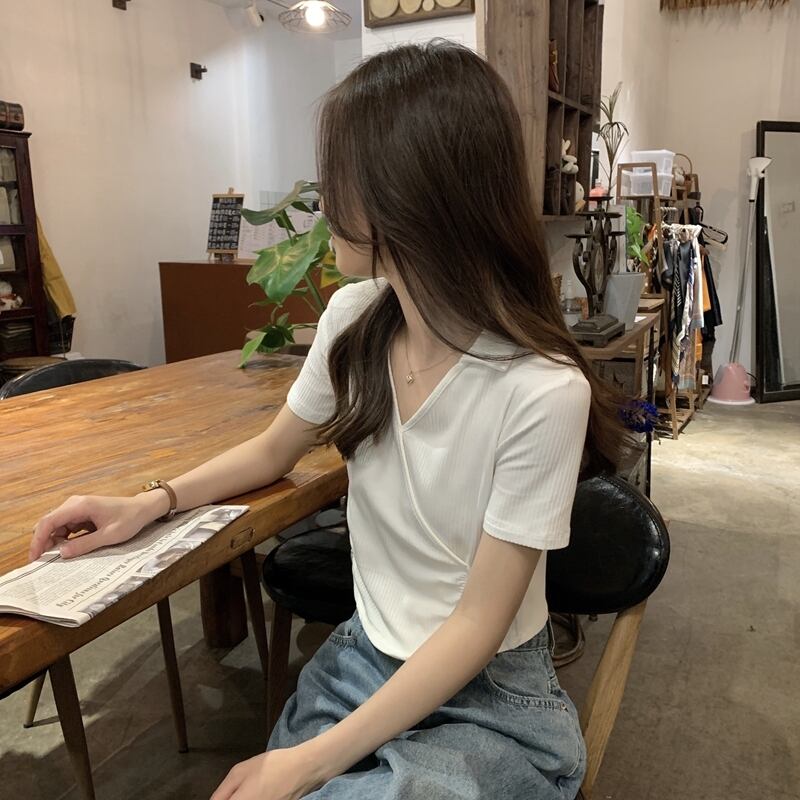 フレンチニッチVネックフロントショルダー半袖Tシャツレディースサマーデザインシックトップスモールショートビューティフルスモールシャツ 夏物 7460084205540039 | framboise21