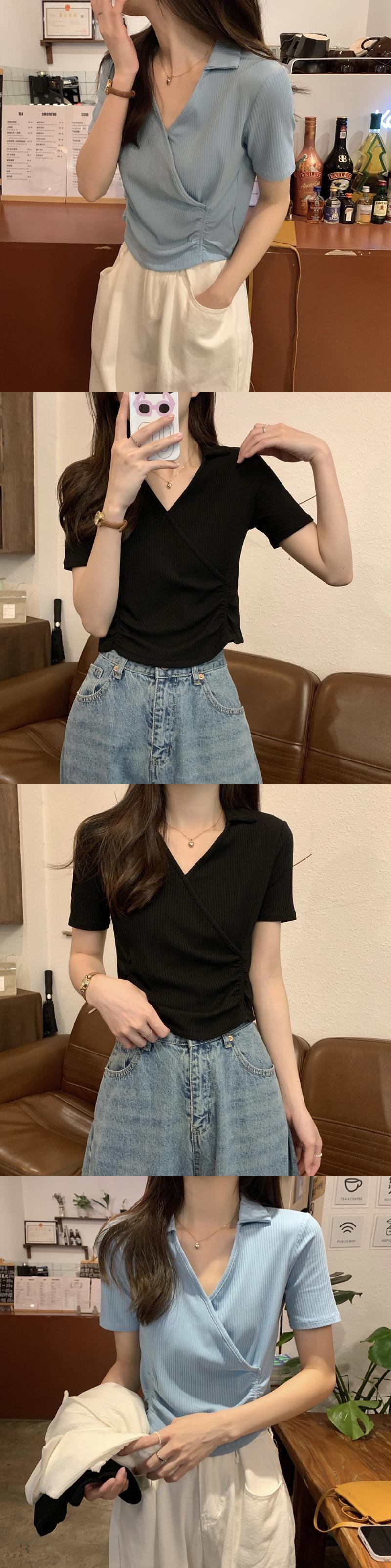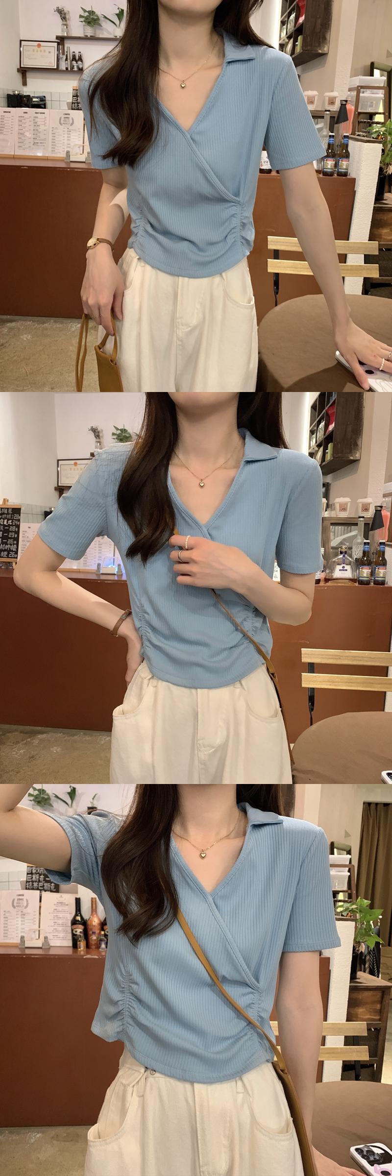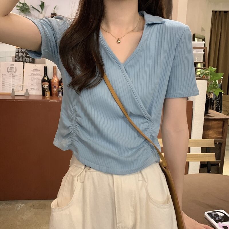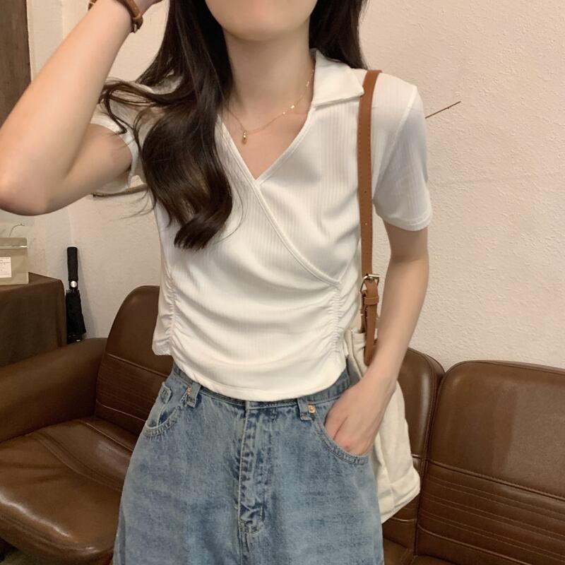 フレンチニッチVネックフロントショルダー半袖Tシャツレディースサマーデザインシックトップスモールショートビューティフルスモールシャツ 夏物 7460084205540039 | framboise21