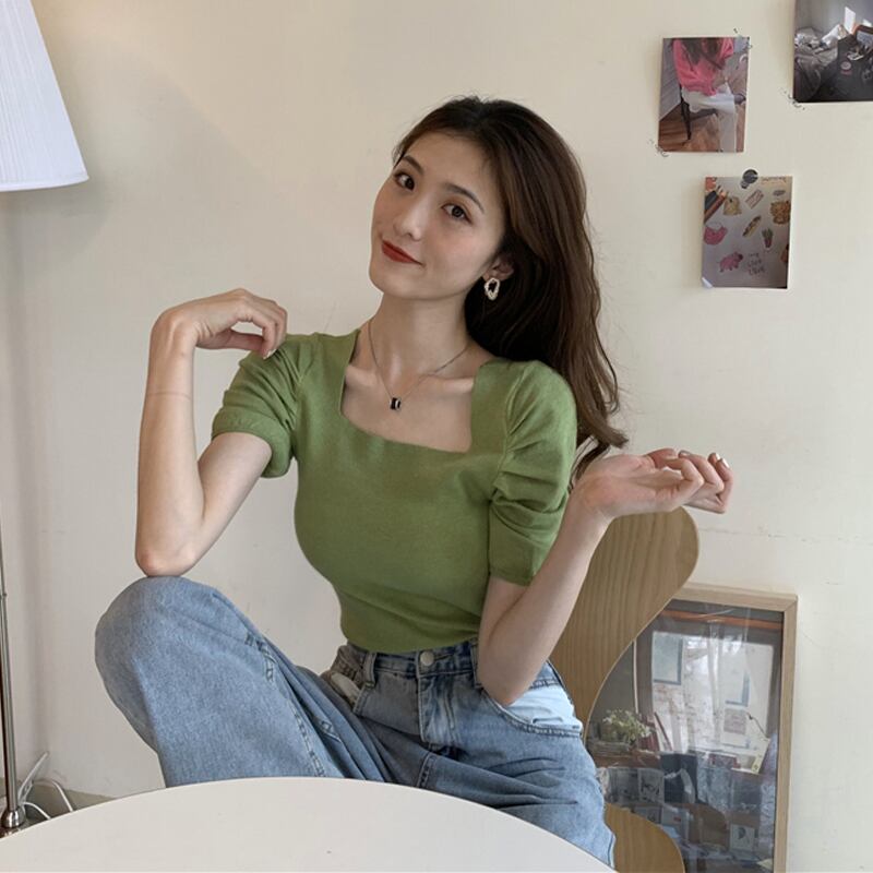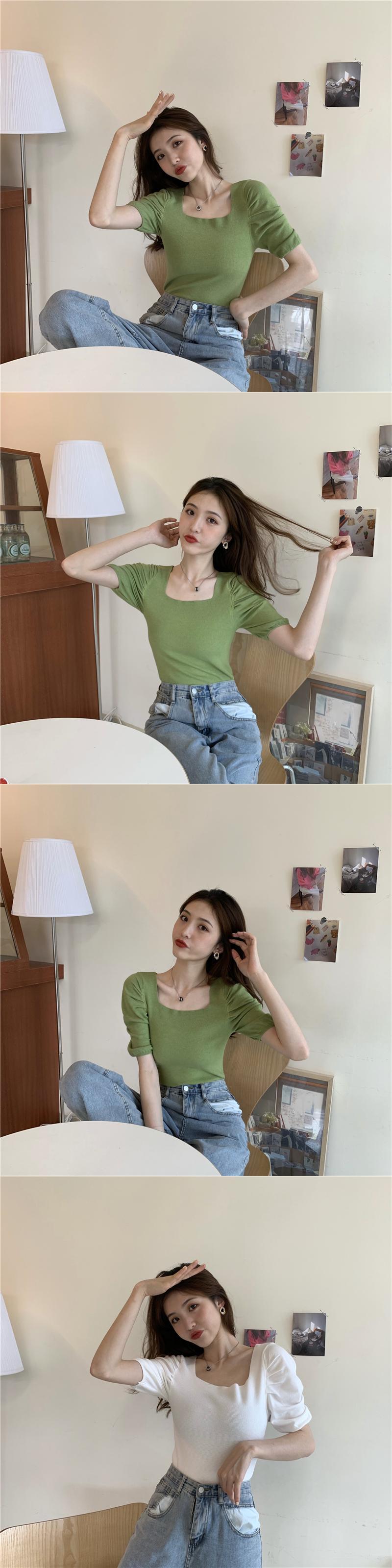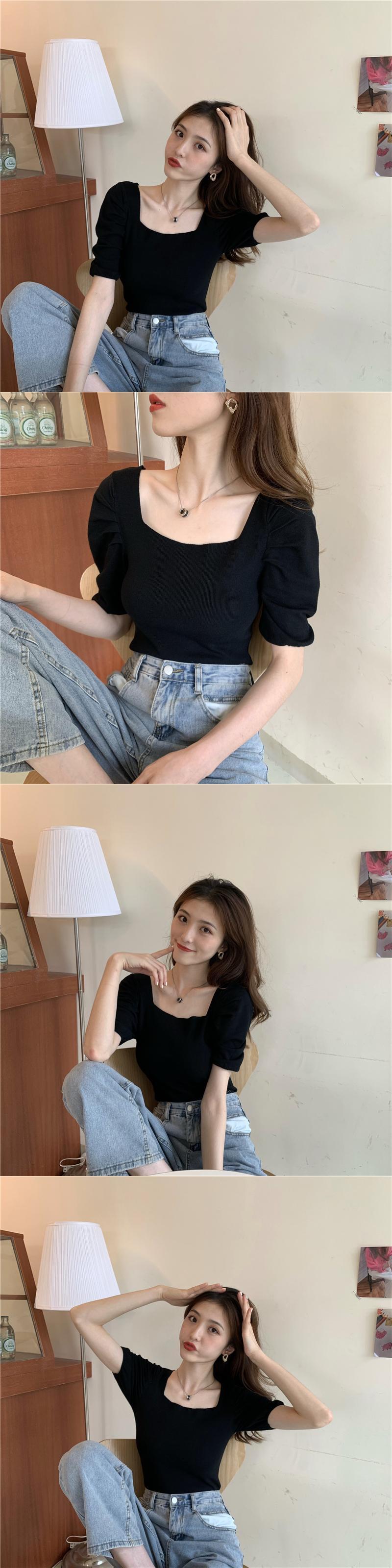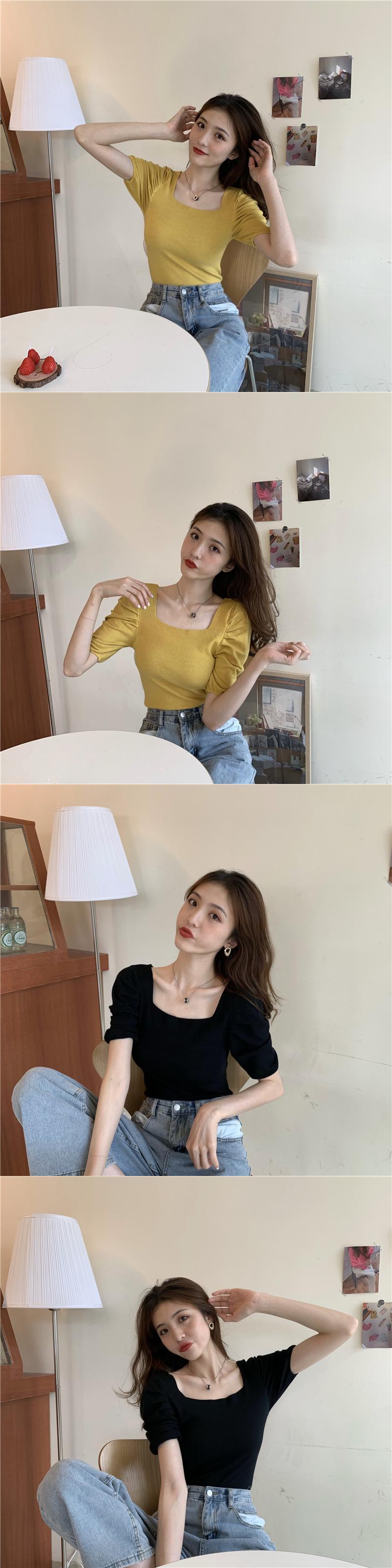 フレンチスクエアカラー露出カラーボーンアイスシルクニット半袖Tシャツ女性の2022年夏新しいレトロな痩身パフスリーブトップ サマー 夏物 スクウェア 746003042852527 | framboise21