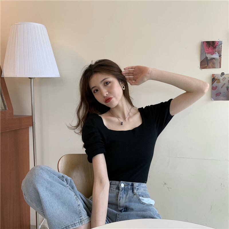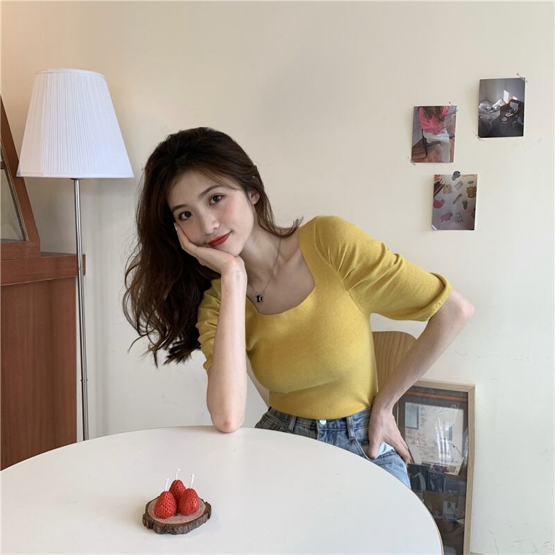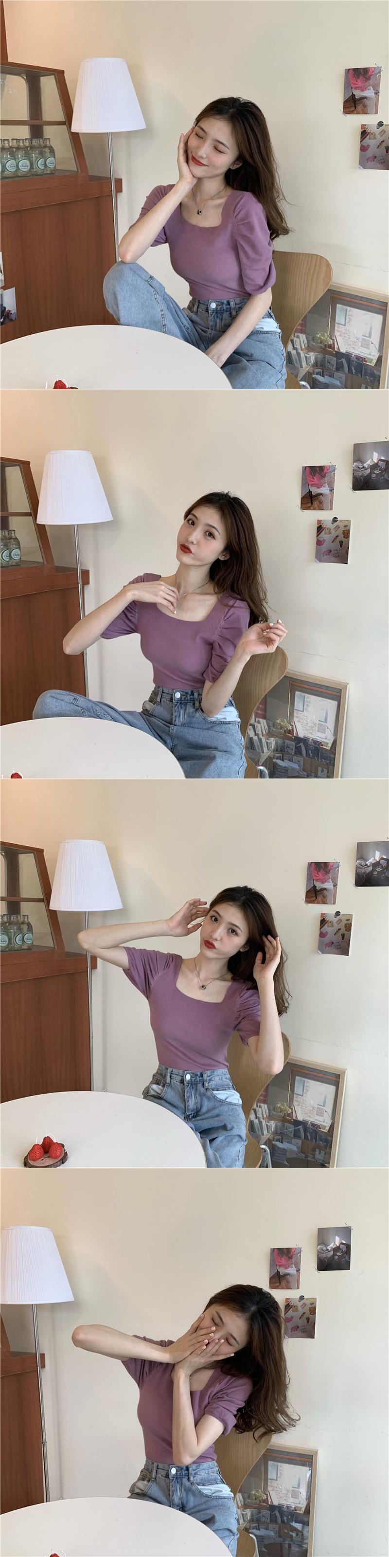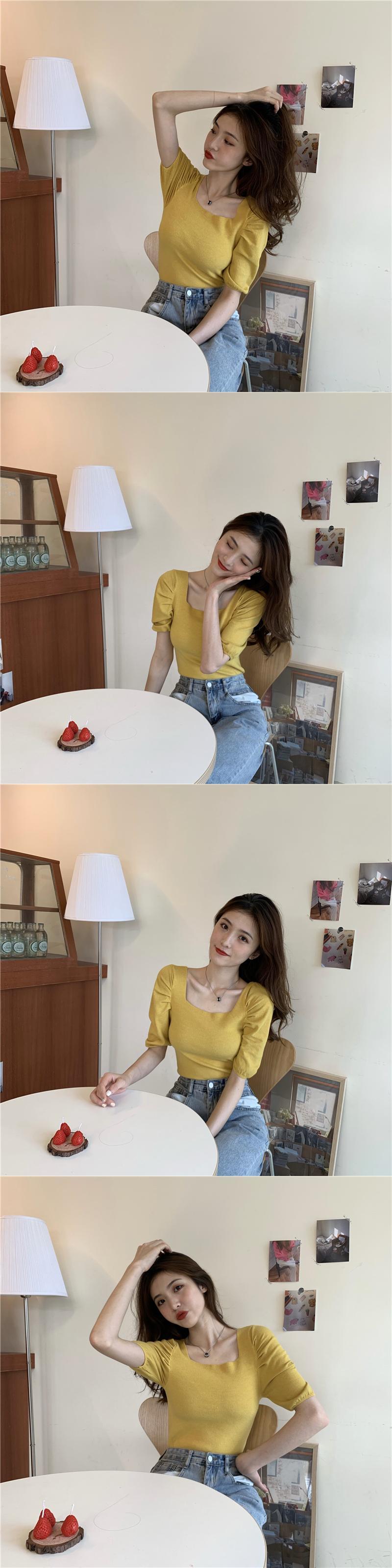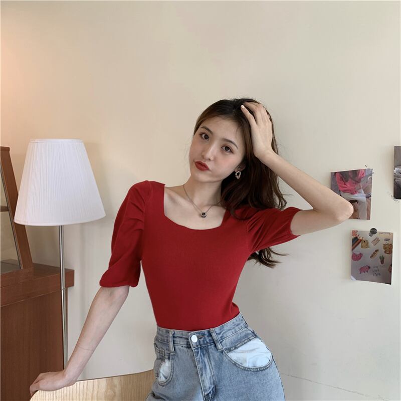 フレンチスクエアカラー露出カラーボーンアイスシルクニット半袖Tシャツ女性の2022年夏新しいレトロな痩身パフスリーブトップ サマー 夏物 スクウェア 746003042852527 | framboise21