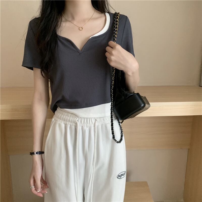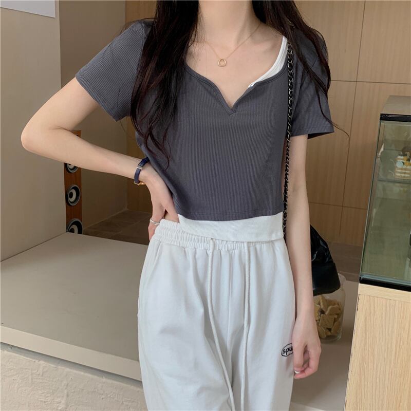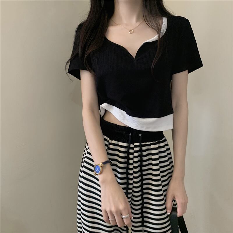 ブラックフェイクツーピースフロントショルダー半袖Tシャツレディースサマーシックイントレンディショートデザインニッチピュアデザイーンウィンドトップ 夏物 7460025296313312 | framboise21