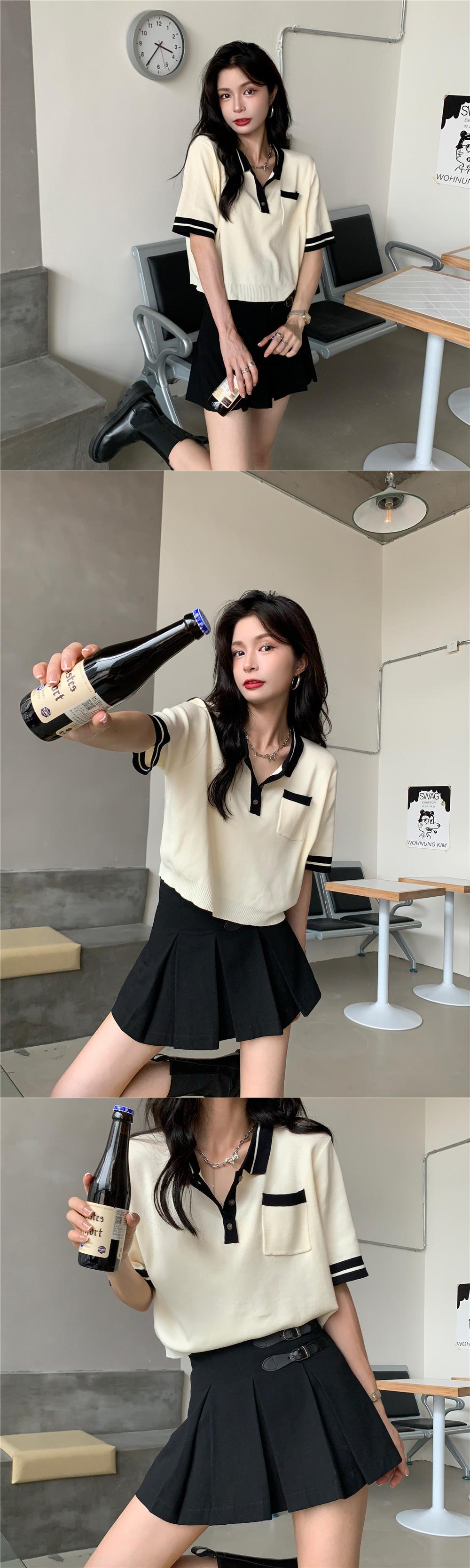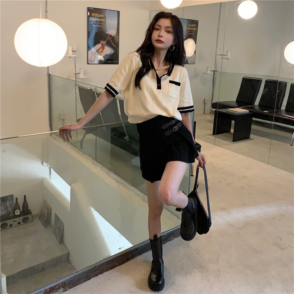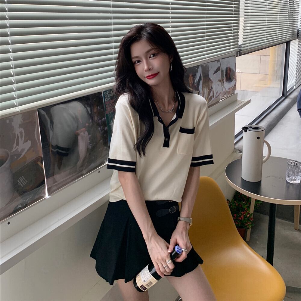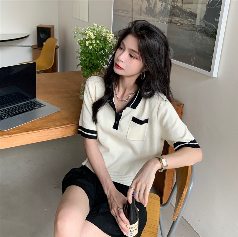 コントラストカラーのポロカラーニット半袖Tシャツレディースサマーシンデザインニッチルーズショートシックスウィートでスパイシーなトップス 大人ガーリー キュート カジュアル 夏物 7460087299293387 | framboise21