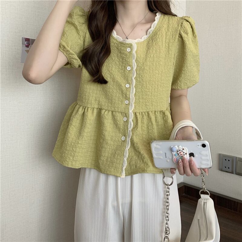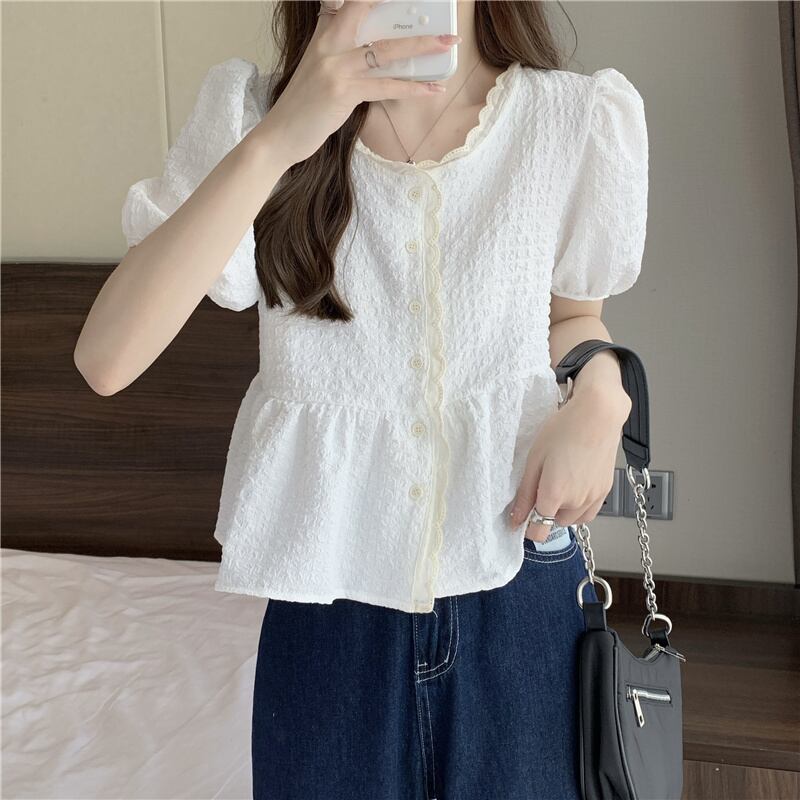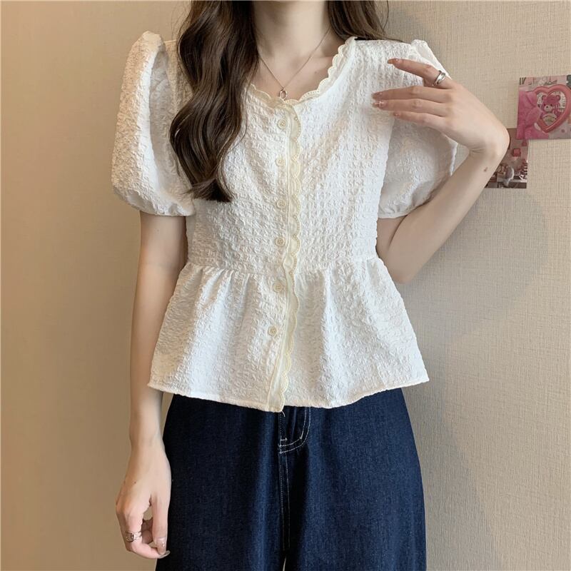 夏のフロントショルダーバブル半袖Tシャツ女性イントレンディでウエスタンスタイルの年齢を減らすオールマッチファッションスモールシャツウエストシフォントップス サマー 夏物 7460023237339 | framboise21