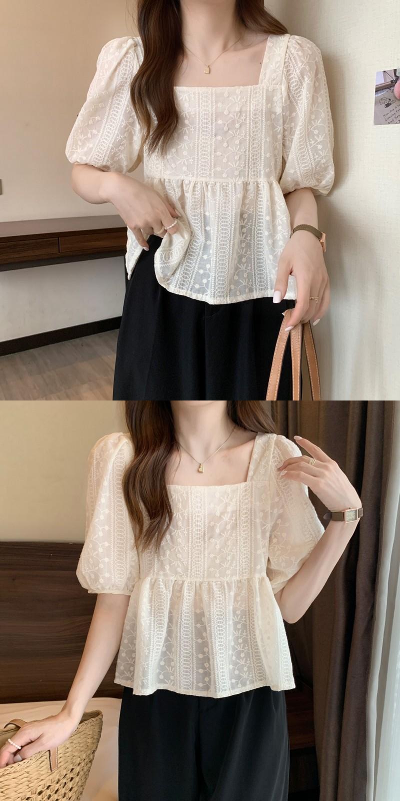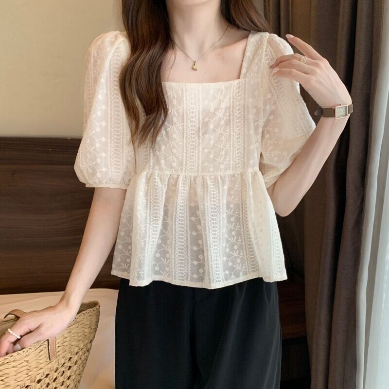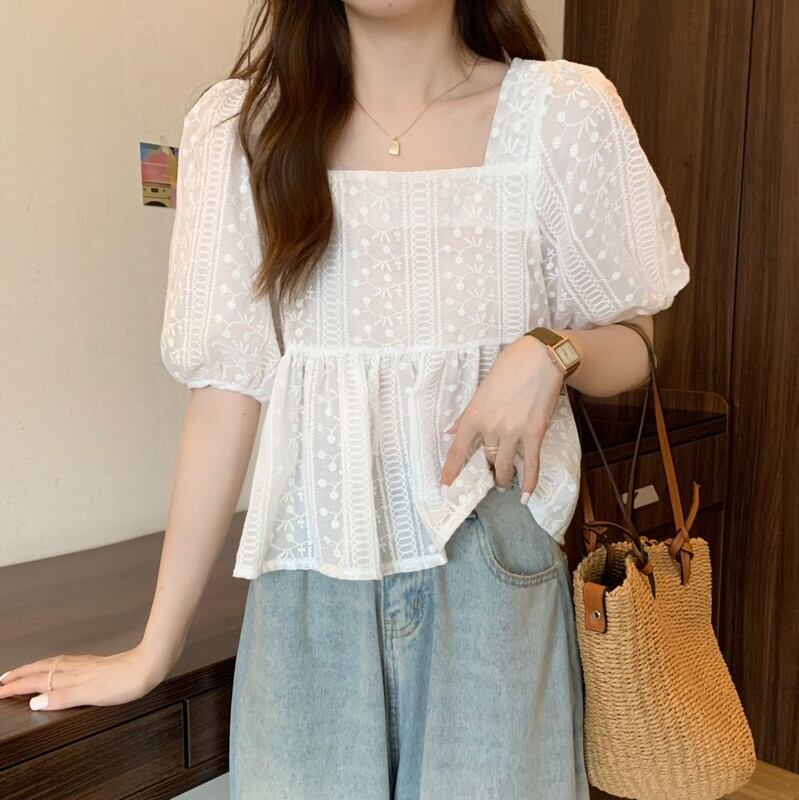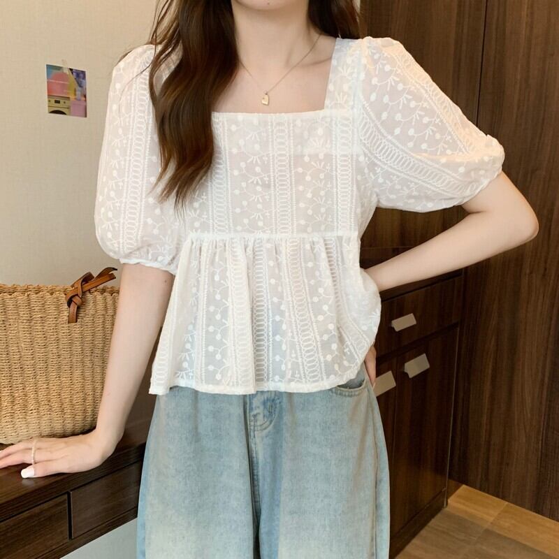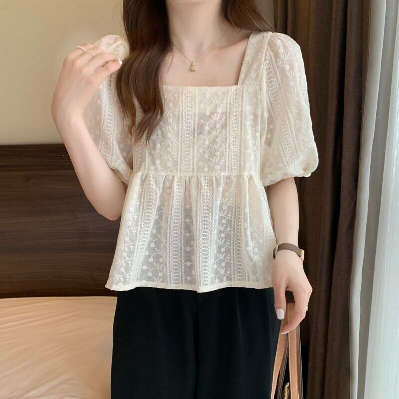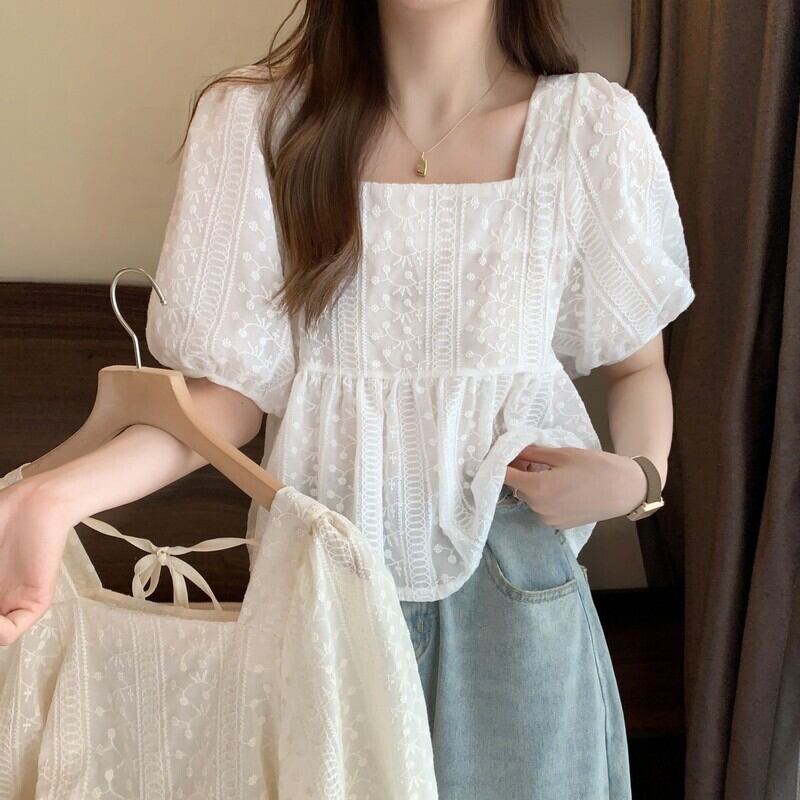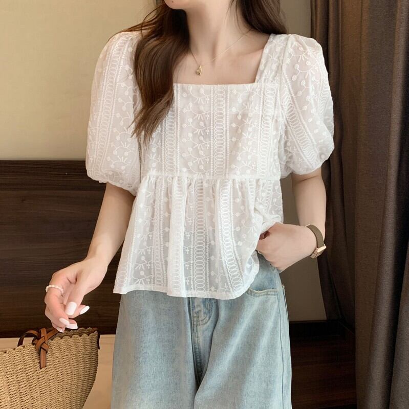 夏フレンチスクエアネック半袖シャツレディースホワイトスウィートデザインニッチシックパフスリーブトップやさしい風 大人ガーリー キュート カジュアル サマー 夏物 スクウェア 7460089483496899 | framboise21