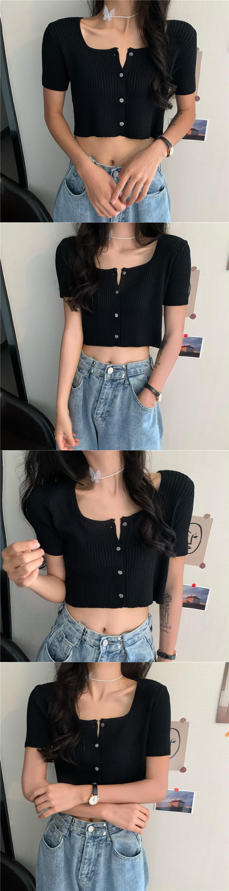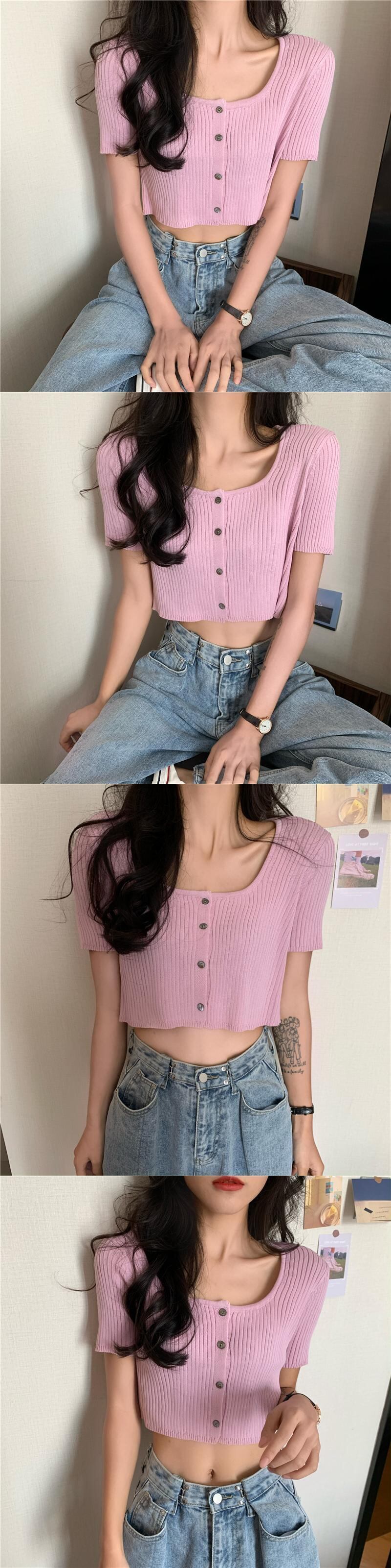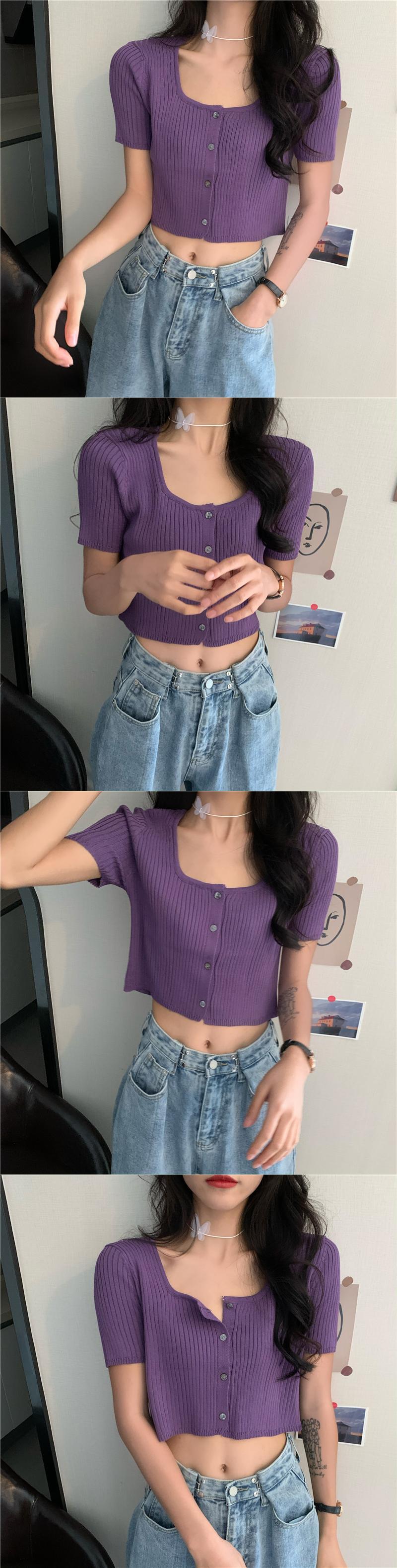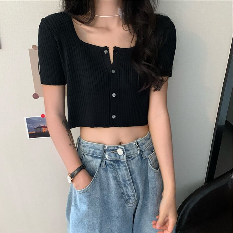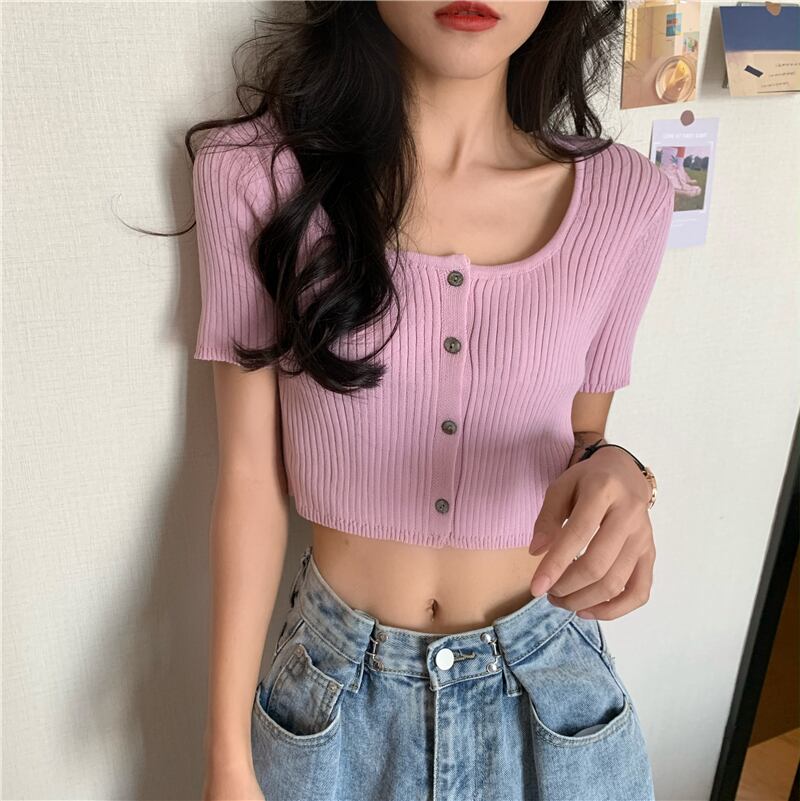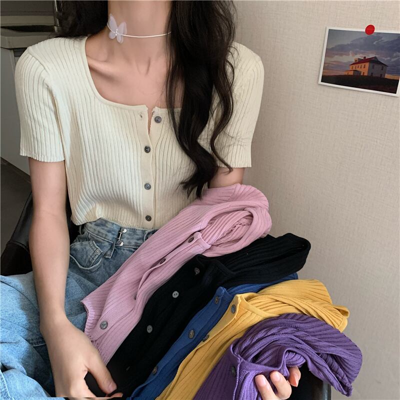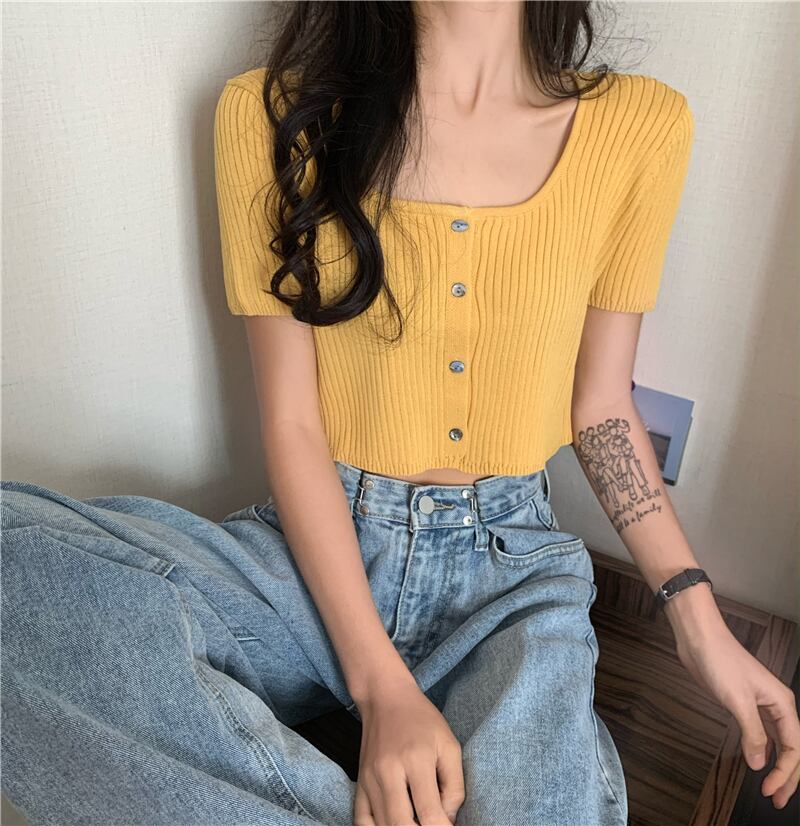2022年の新しい夏の女性のハイウエストショートクロップドネーブルトップ気質多目的スクエアネック半袖ニットセーター ハイウェスト ハーフスリーブ サマー 夏物 スクウェア 7460014034950164 | framboise21