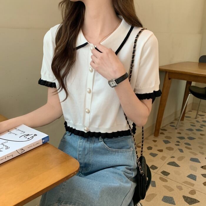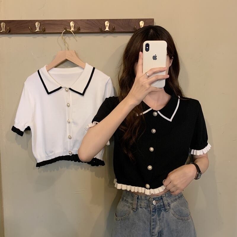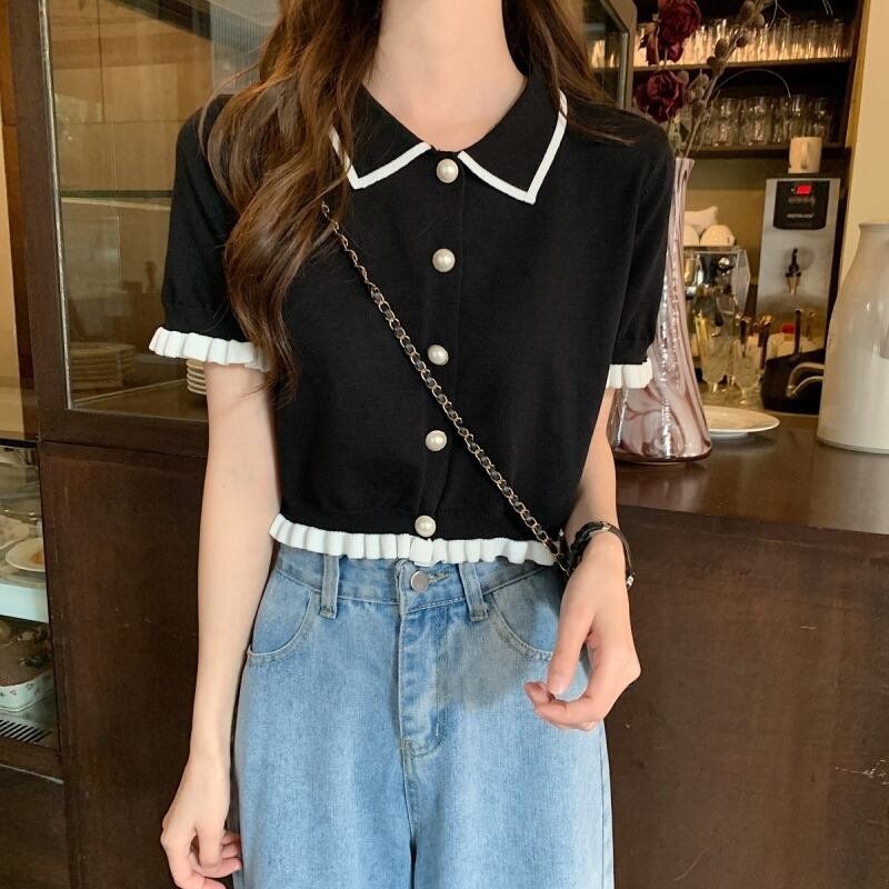 フロントショルダーブラックポロカラーニット半袖Tシャツレディースサマーデザインニッチハイウエストショートトップカーディガンサマー ハイウェスト 夏物 7460082795979795 | framboise21