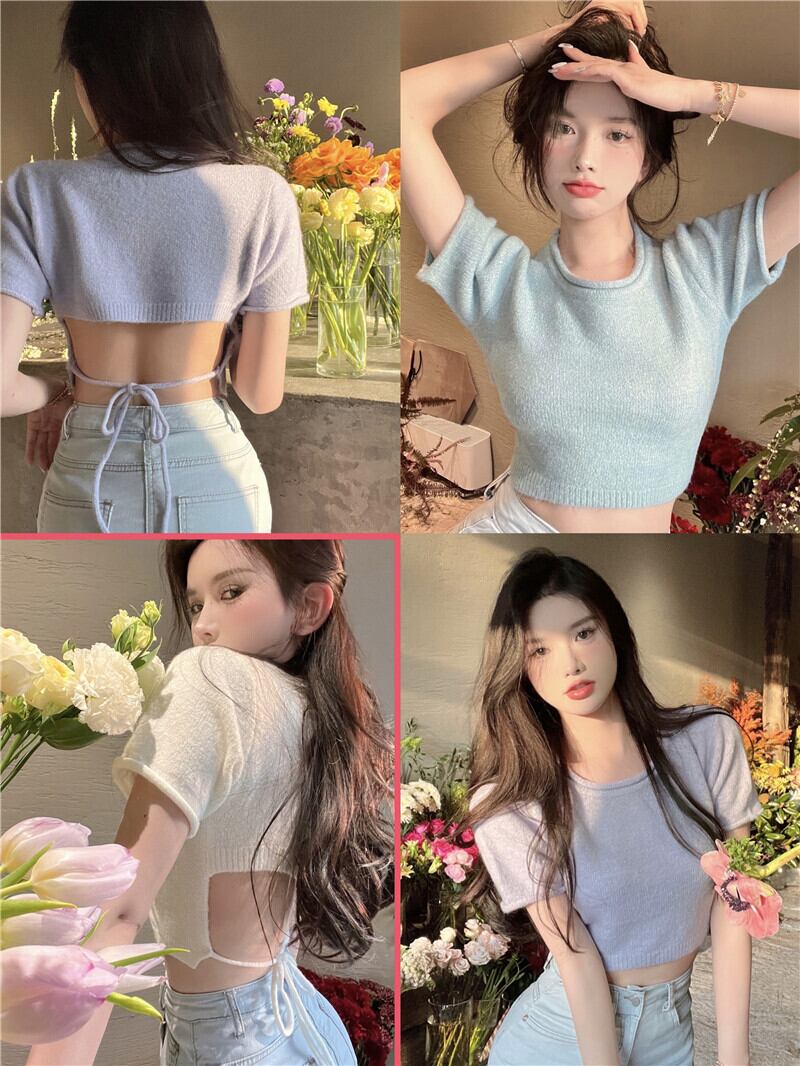 夏のシックなデザインセンスニッチ純粋な欲望甘い女の子セクシーな背中の開いたニット半袖Tシャツ女性のストラップ付きショートトップ 大人ガーリー スウィート キュート カジュアル サマー 夏物 ピュア 7460021065722832 | framboise21