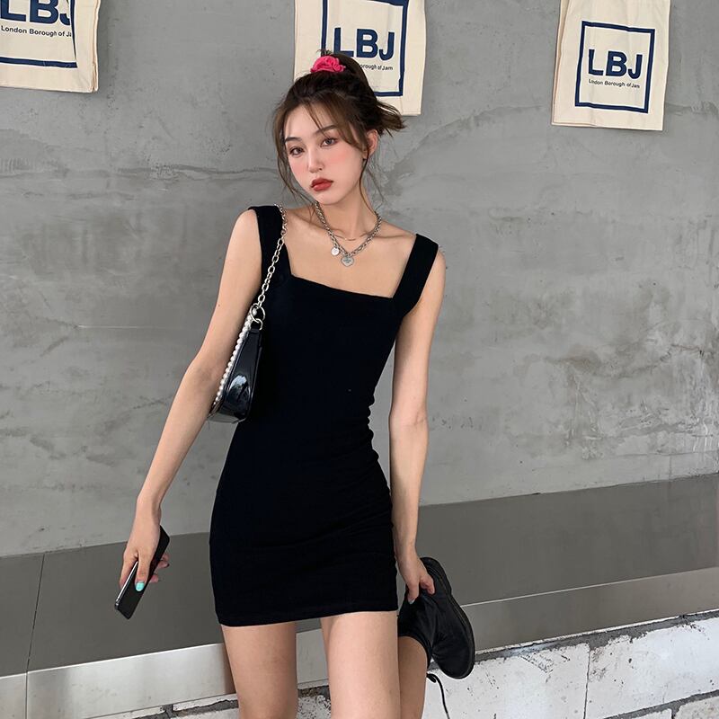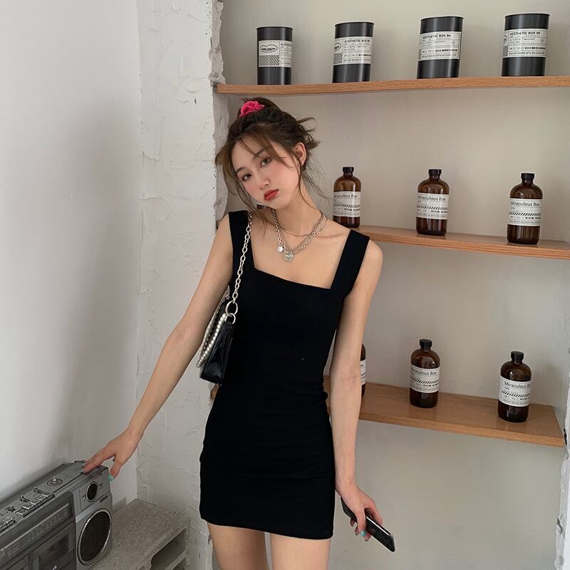 黒のドレスの女性の夏の薄いノースリーブサスペンダースカートセクシーな純粋な欲望スタイルスリムショートパッケージヒップスクエアネックスカート ブラック サマー 夏物 ピュア スクウェア 7460027008675696 | framboise21