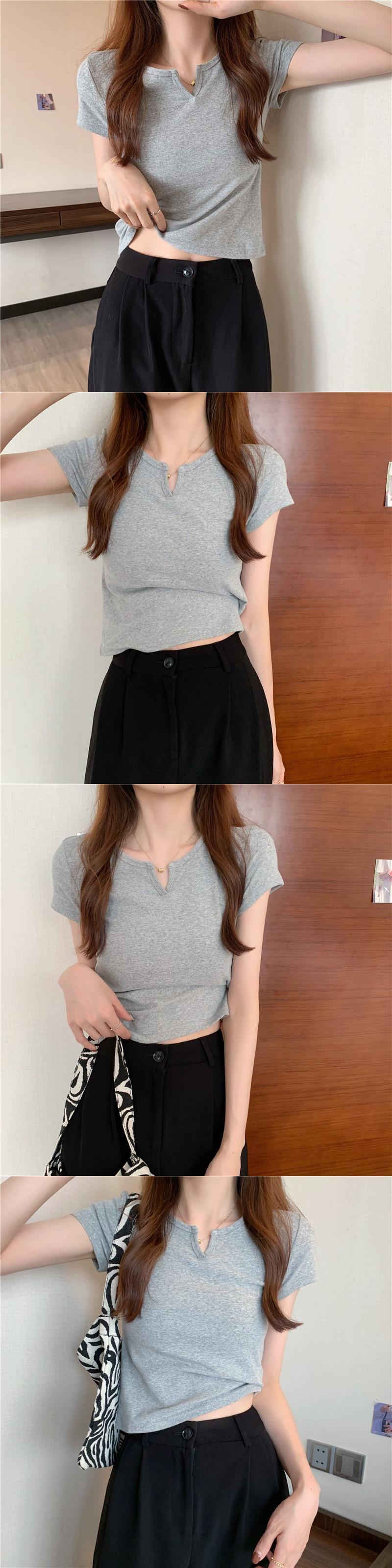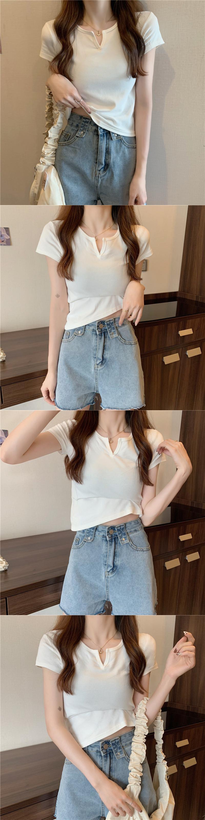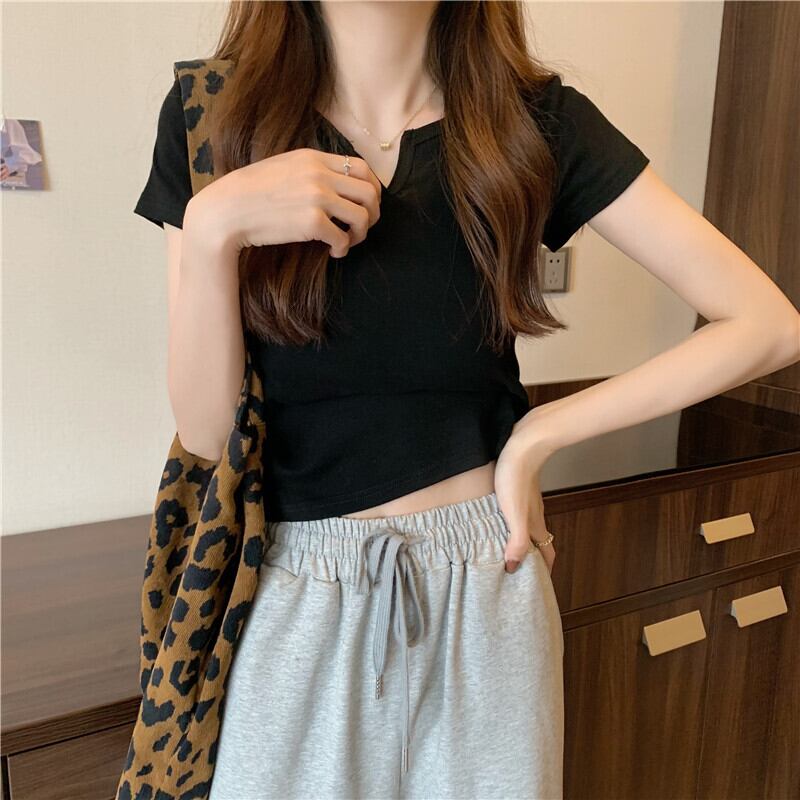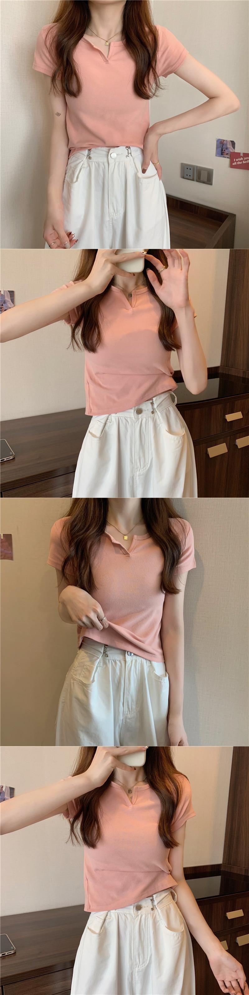 2022年新作フロントショルダーショートトップレディースサマーユニークデザインセンスニッチスウィートでスパイシーな半袖VネックTシャツ 大人ガーリー キュート カジュアル 夏物 746004005403947 | framboise21