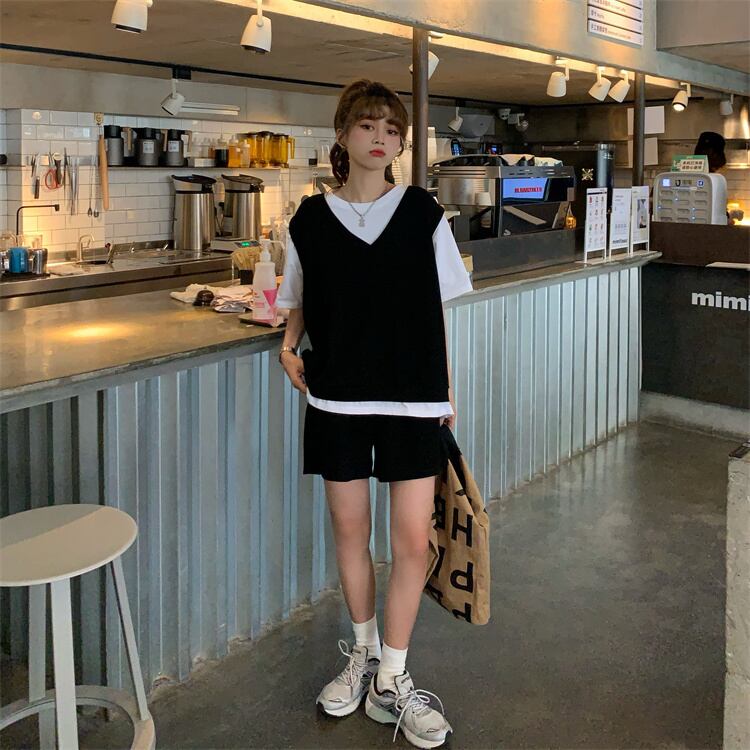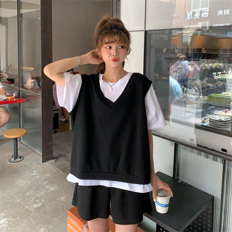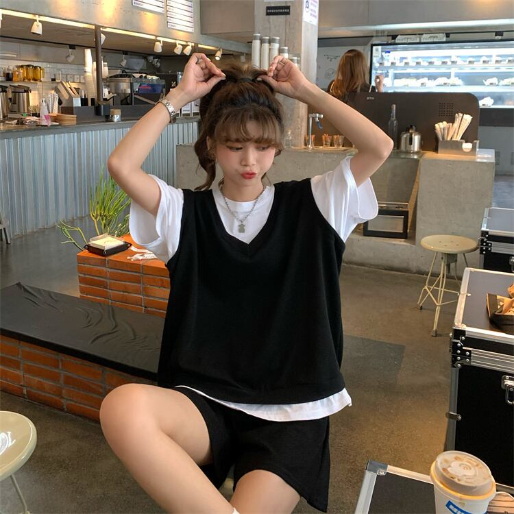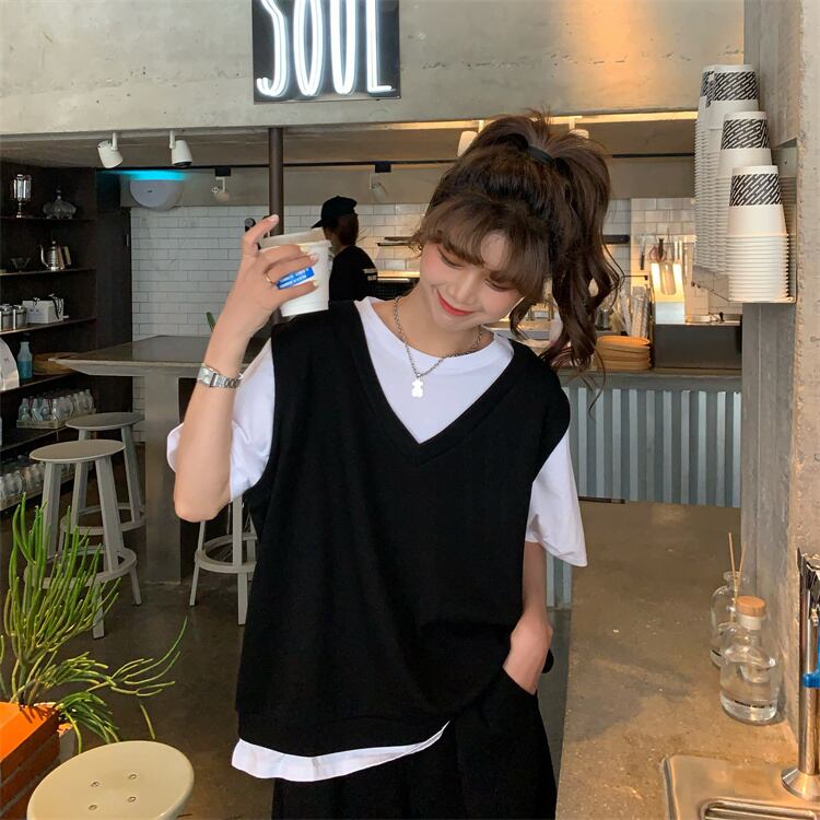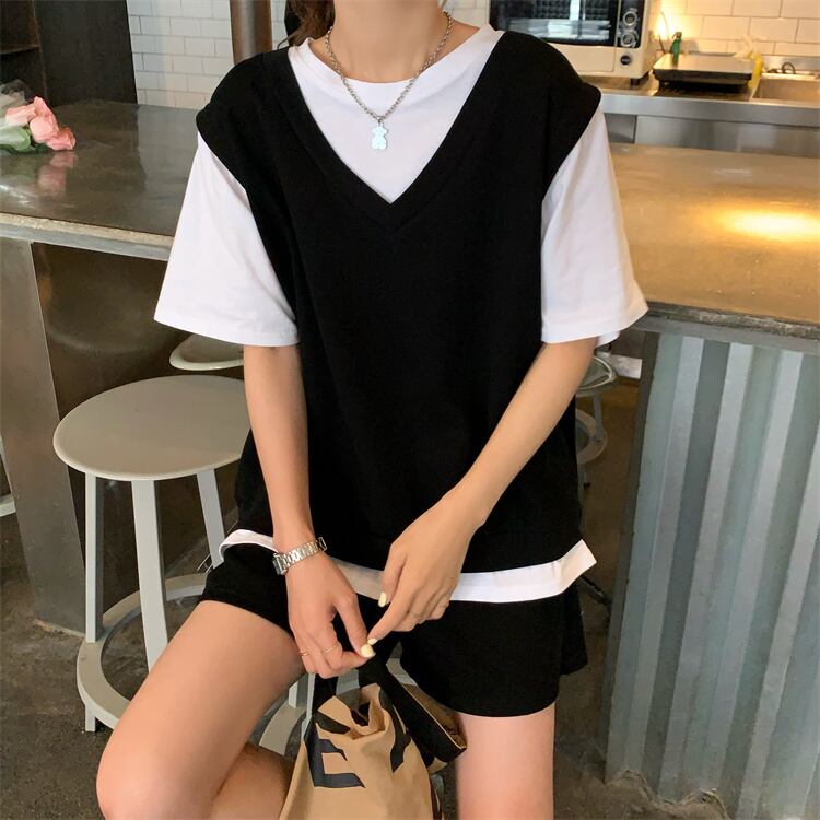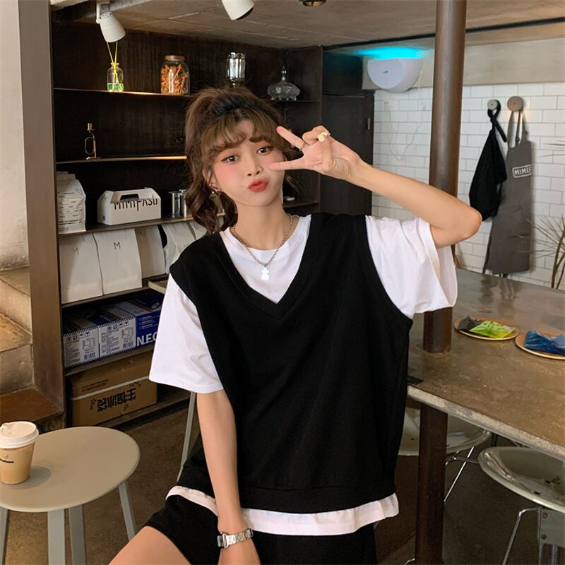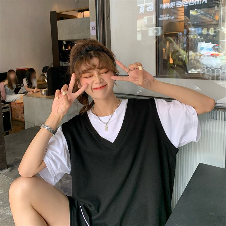 フェイク2枚の白黒カラーマッチング半袖Tシャツレディースサマーインスーパーデザインセンスニッチバージョンルーズカジュアルトップ ホワイト ブラック 夏物 7460086333959410 | framboise21