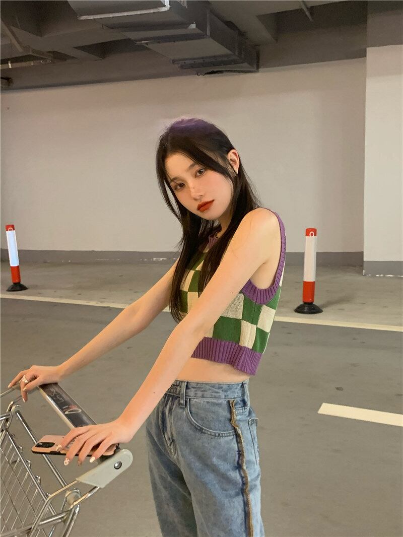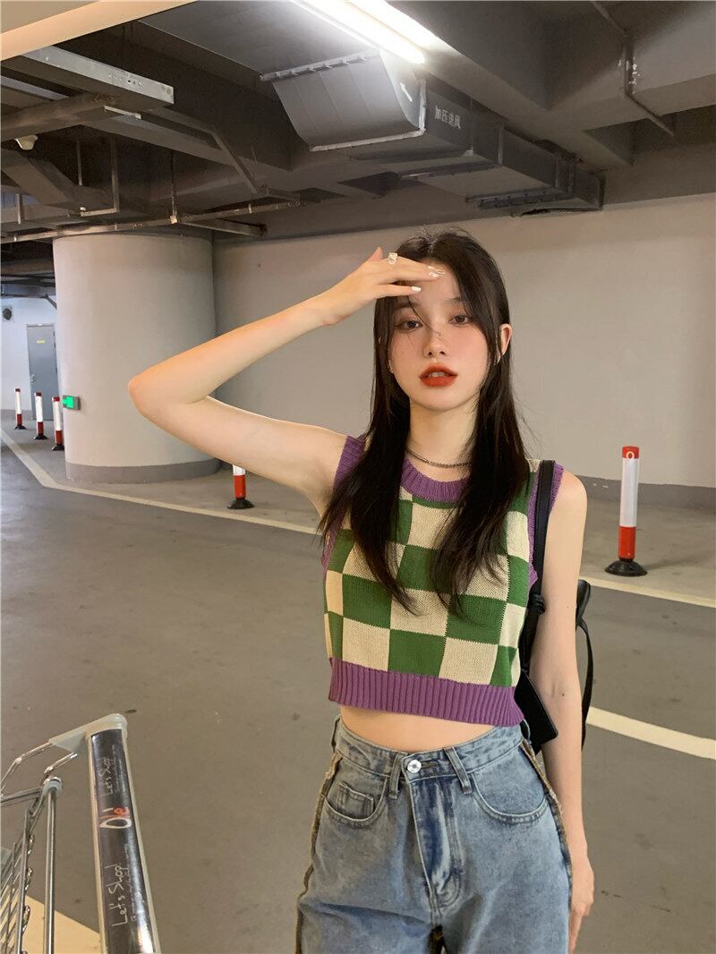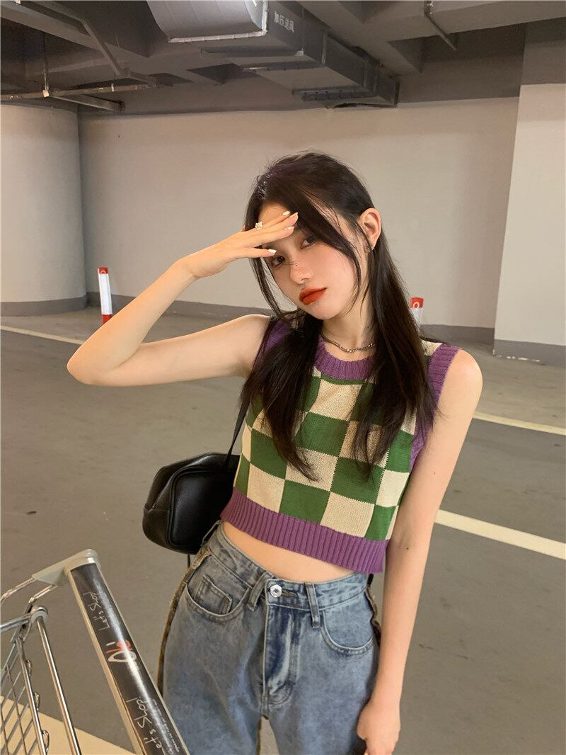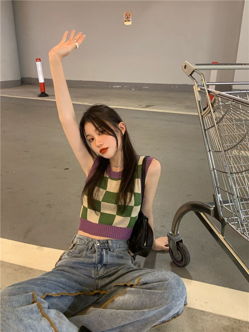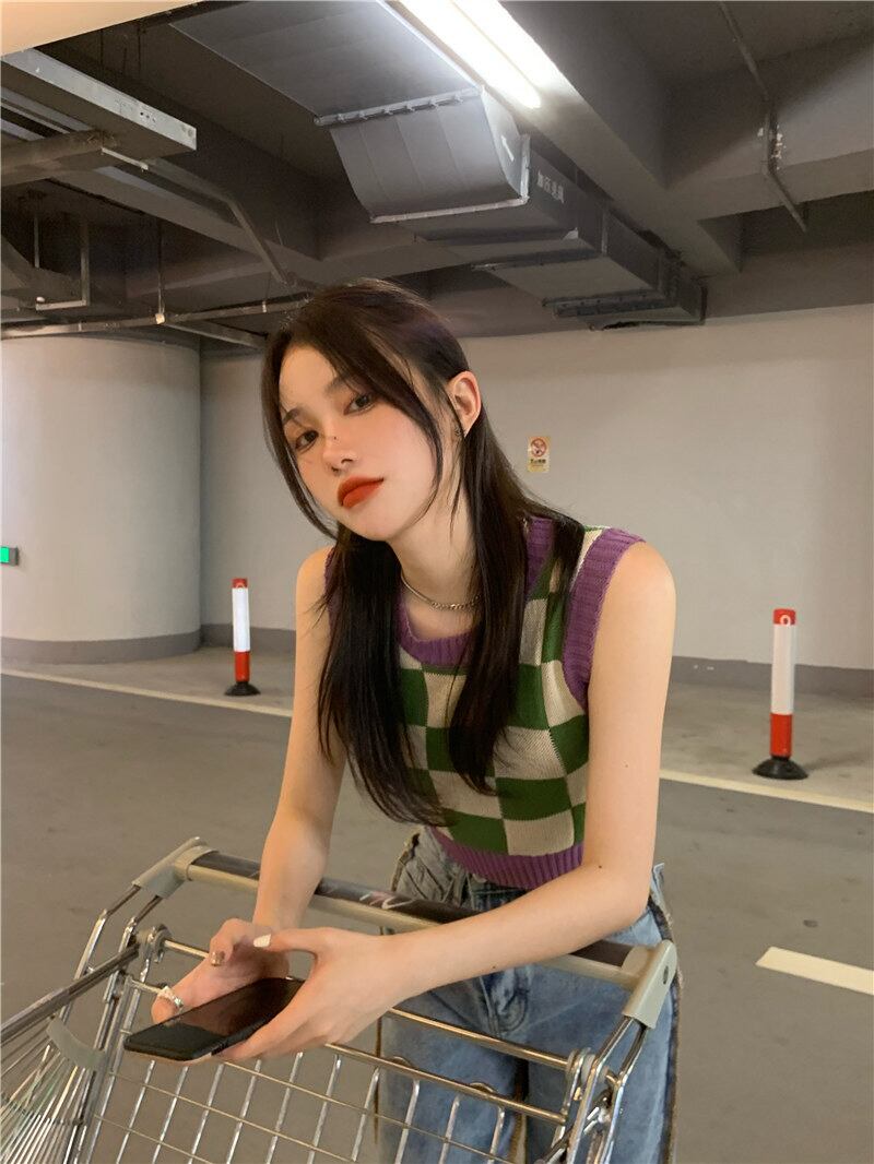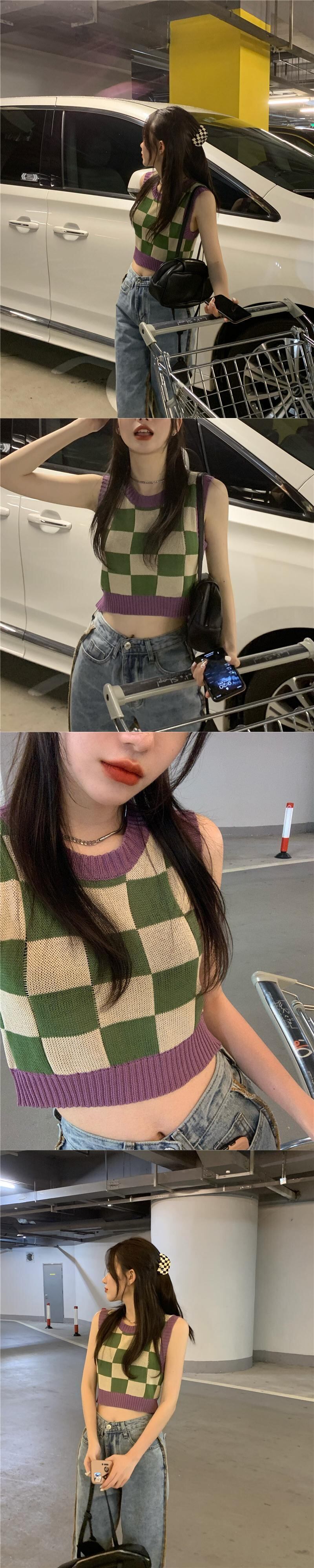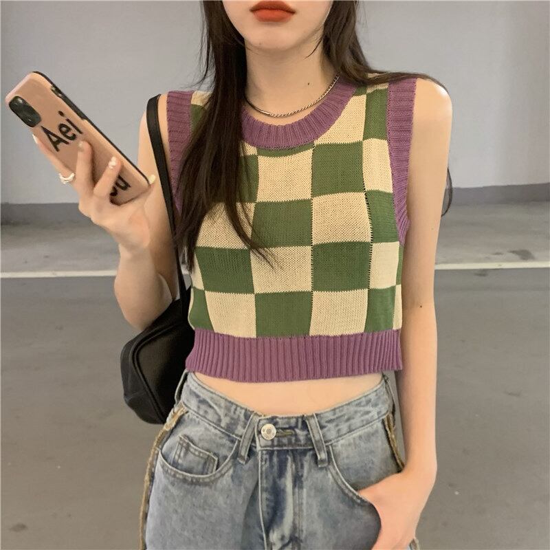 チェッカーボードニットベスト、サスペンダー、レディースインナー、サマーデザイン、小さくて甘くてスパイシーなスタイル、ショートチューブトップ 大人ガーリー スウィート キュート カジュアル 夏物 7460055391631468 | framboise21