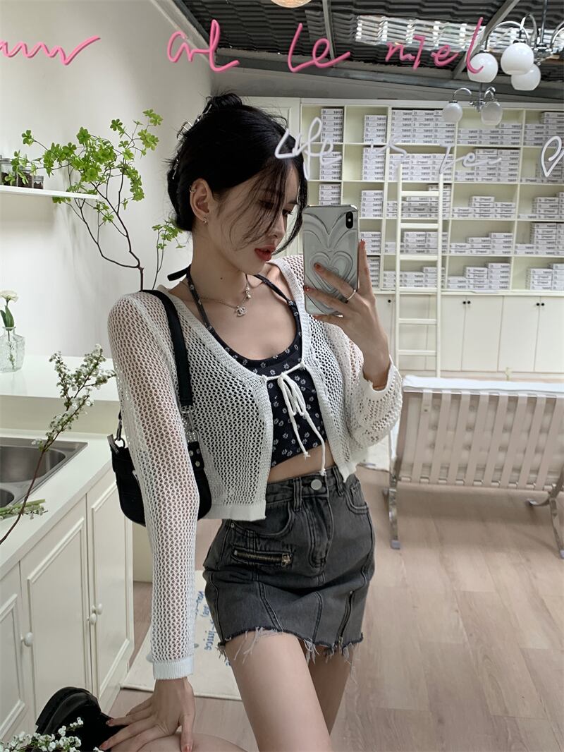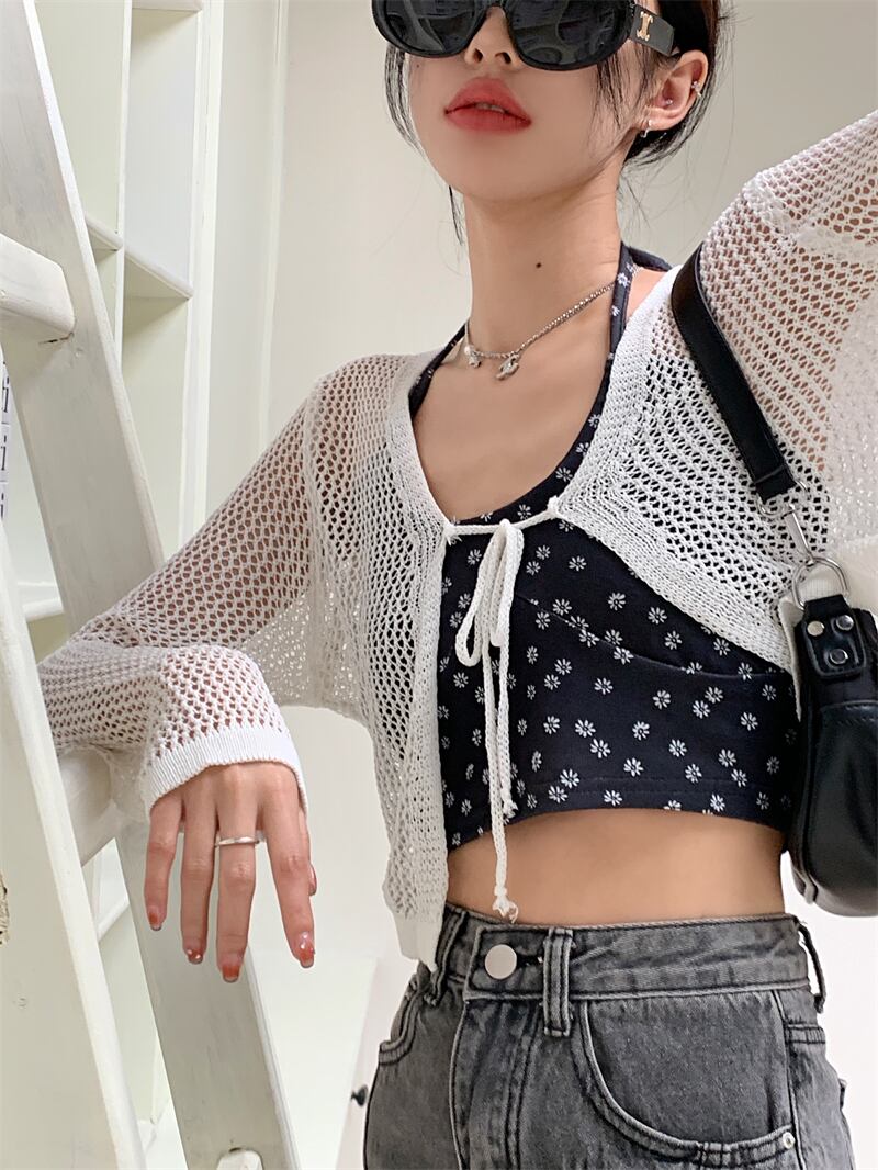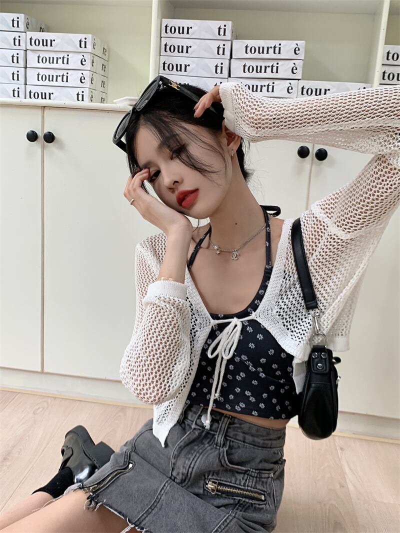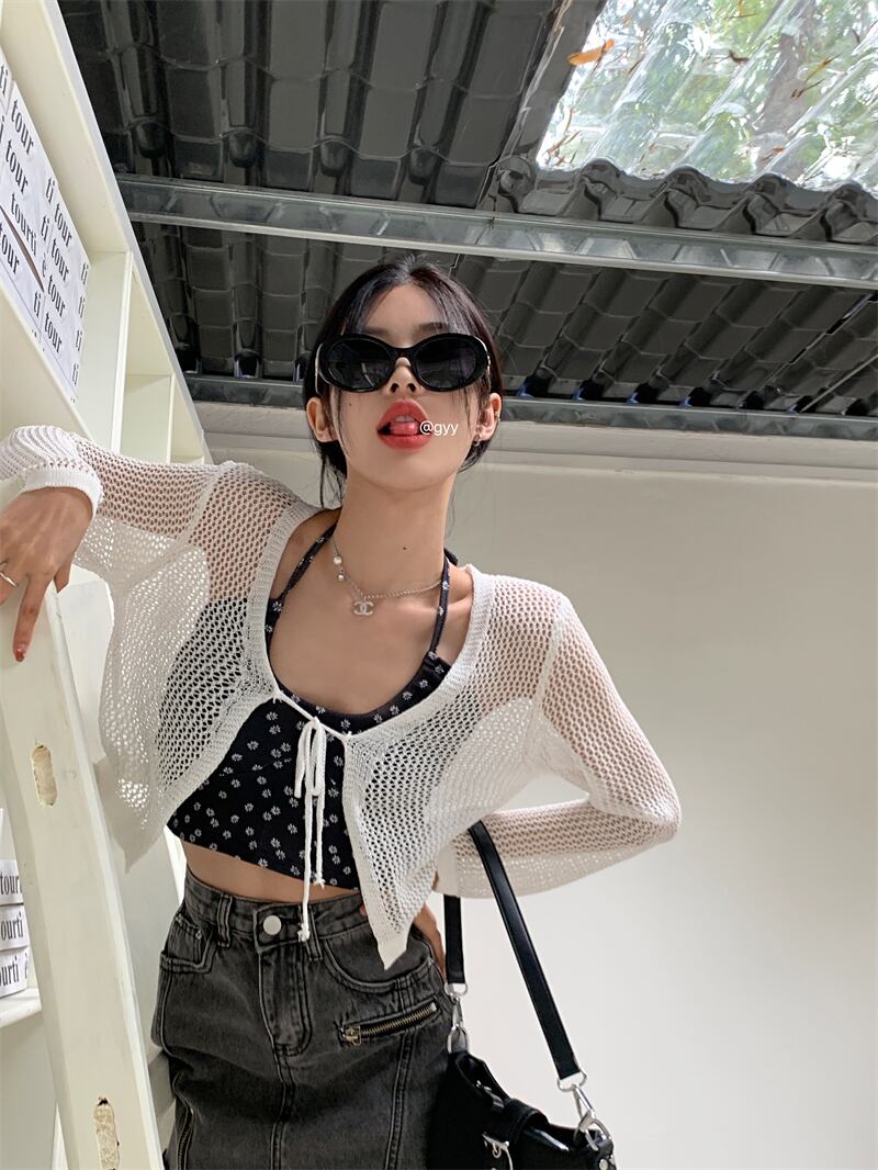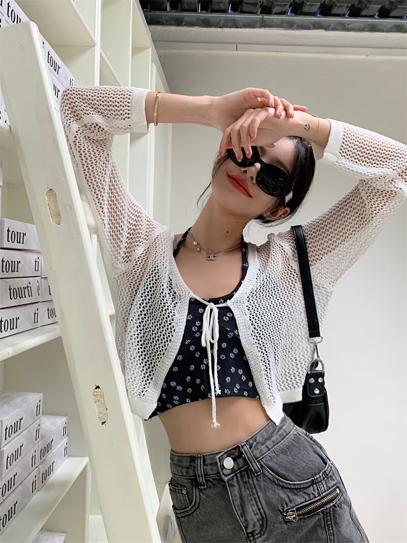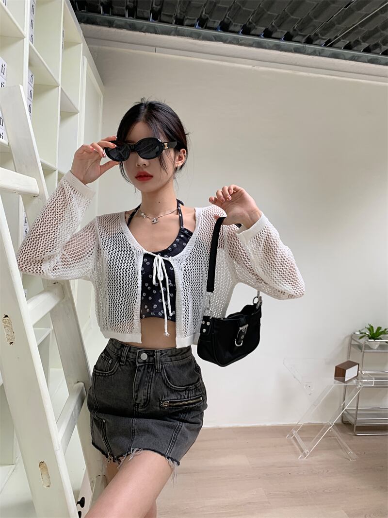 サンプロテクションカーディガンレディースサマー薄手ニットブラウスショートホローパースペクティブホワイトエアコンサスペンダー付きスモールコート 夏物 7460052268641165 | framboise21