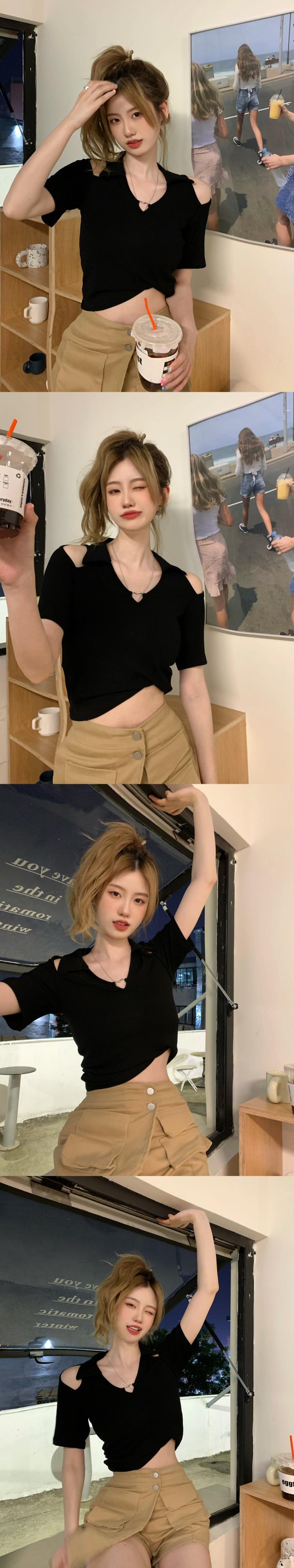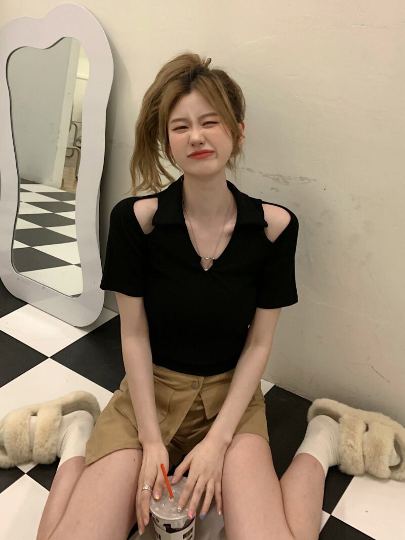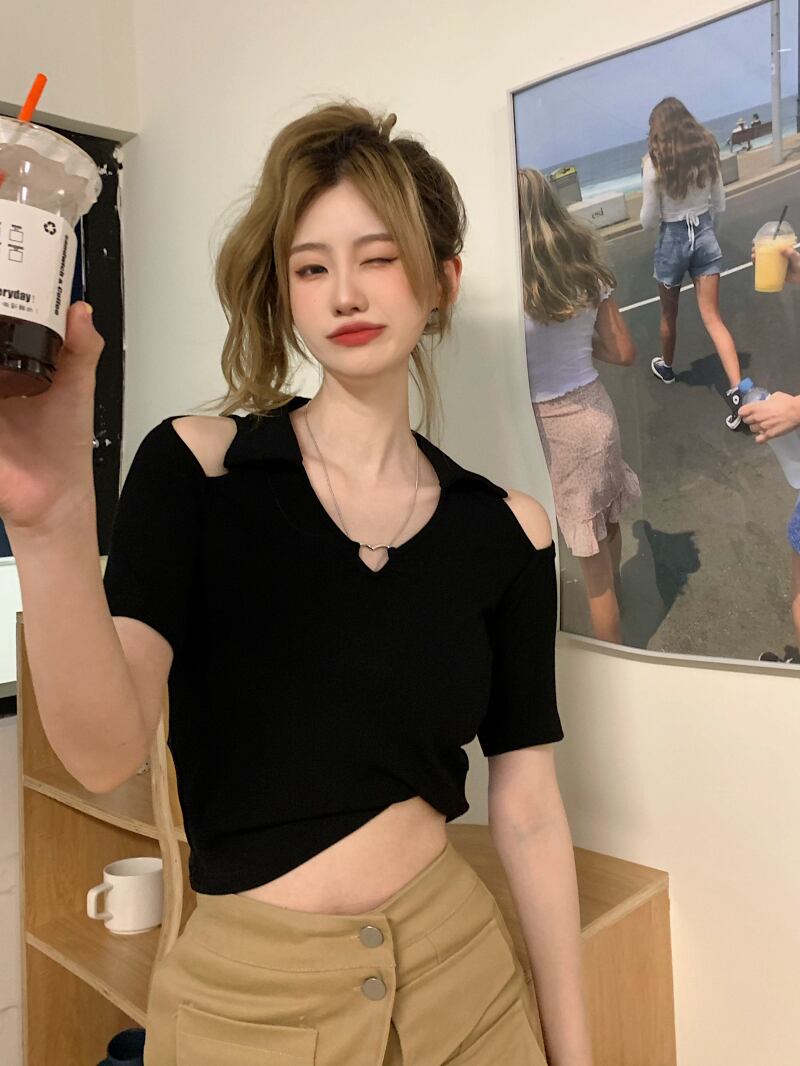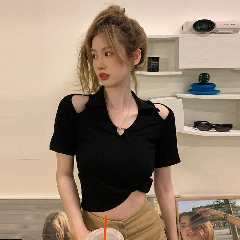 ブラックトップの女性の2022年夏の新しいbmスタイルのデザインセンスショートくり抜かれたオフショルダー半袖VネックTシャツ サマー 夏物 7460050632483911 | framboise21